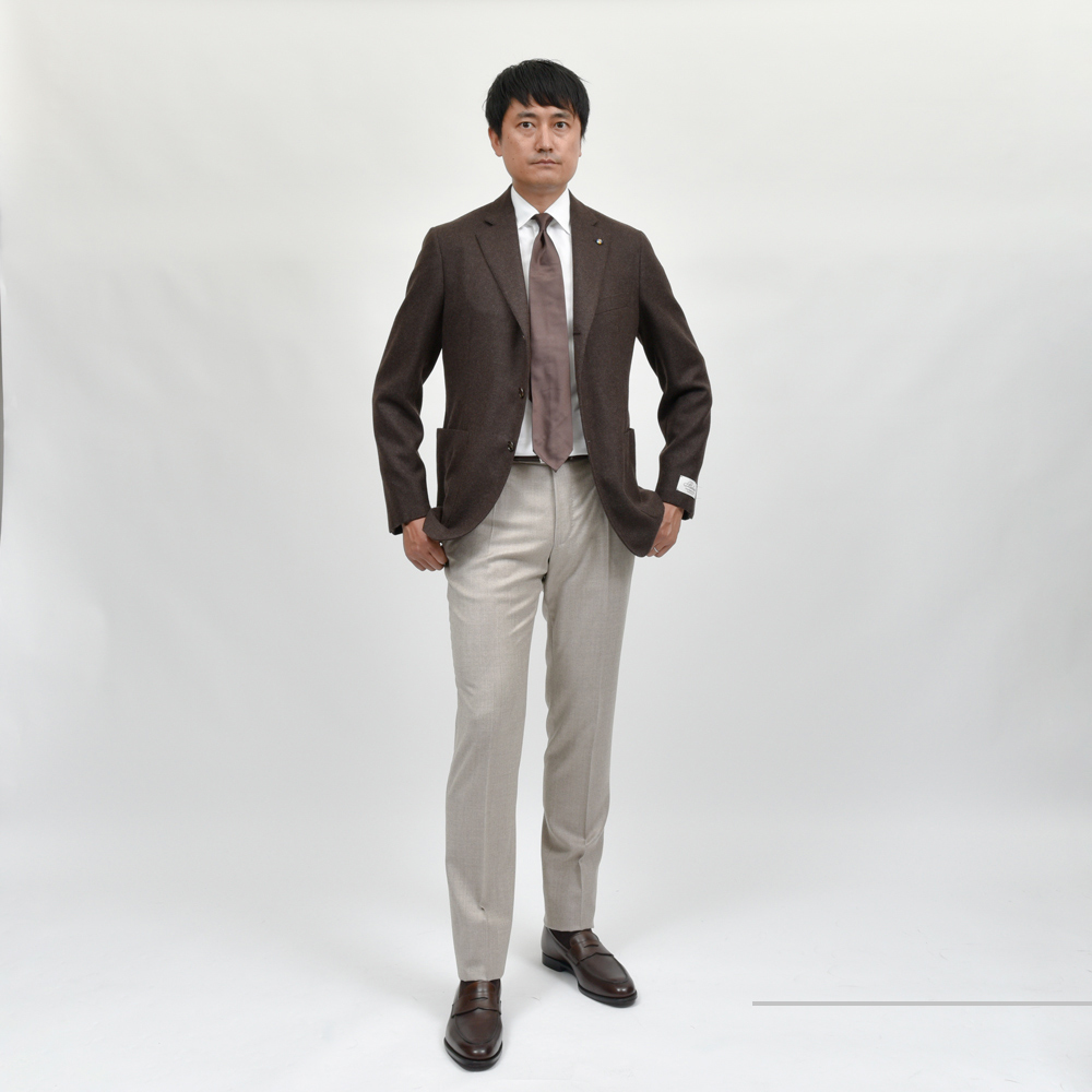目付は300g/mで程良いバランスです。軽すぎず重すぎず、ジャケットとして最も着やすいバランスのウェイト感で、何といっても奥深さのあるブラウンの発色が素晴らしいですね。