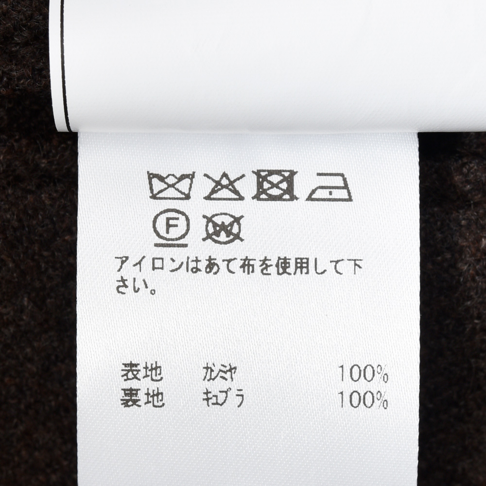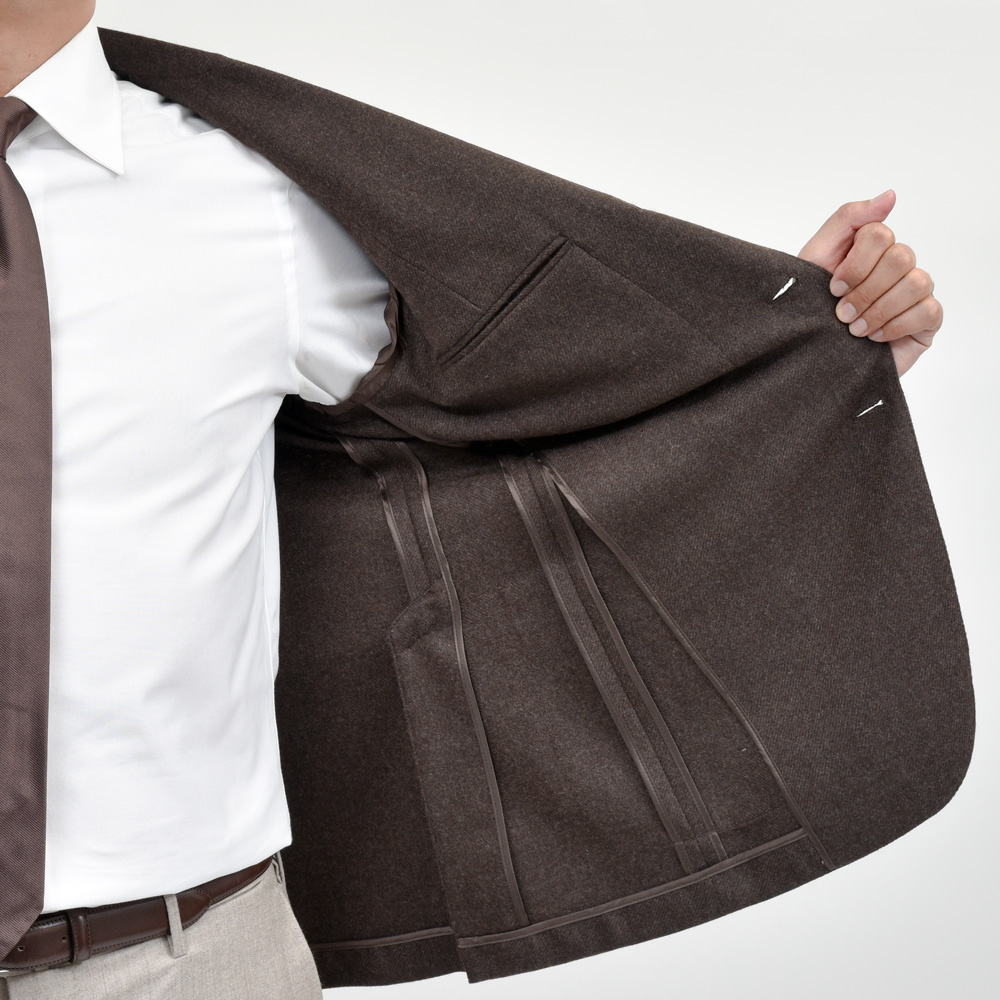 カシミア100%ならではの滑らかさとぬめり感を備えたブラウンの生地は、深みのある発色と極上の肌触りが魅力。