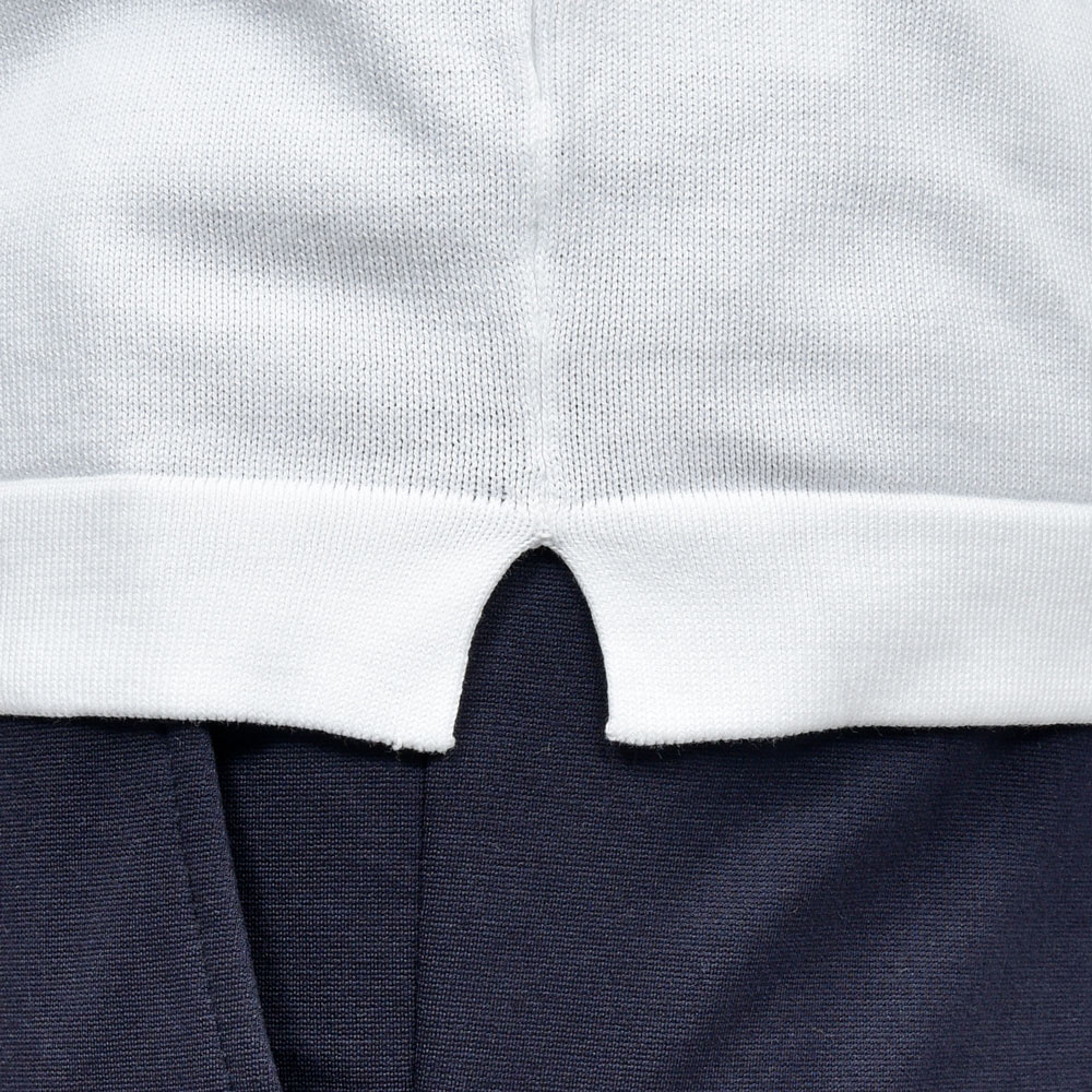 加えてサイドスリットを入れることで軽快感も備えており、ニット編地ですがTシャツの様に着られるように仕上げを工夫。