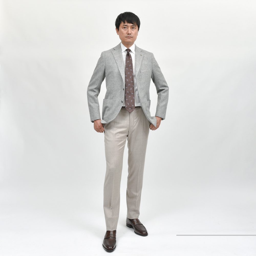 グレーの色味、立体感、ちょっと細めの控えめなピッチなどとても上品でスマートなジャケットに仕上がっていると思います。