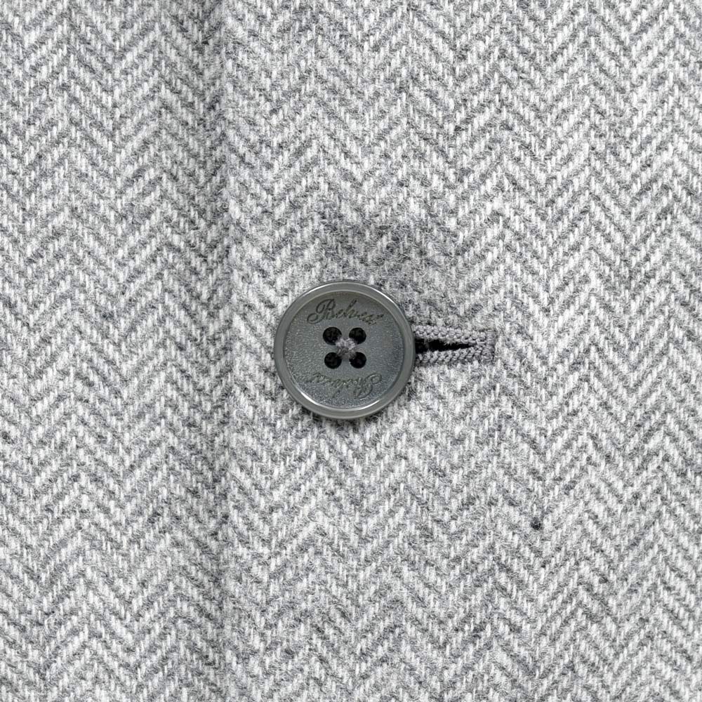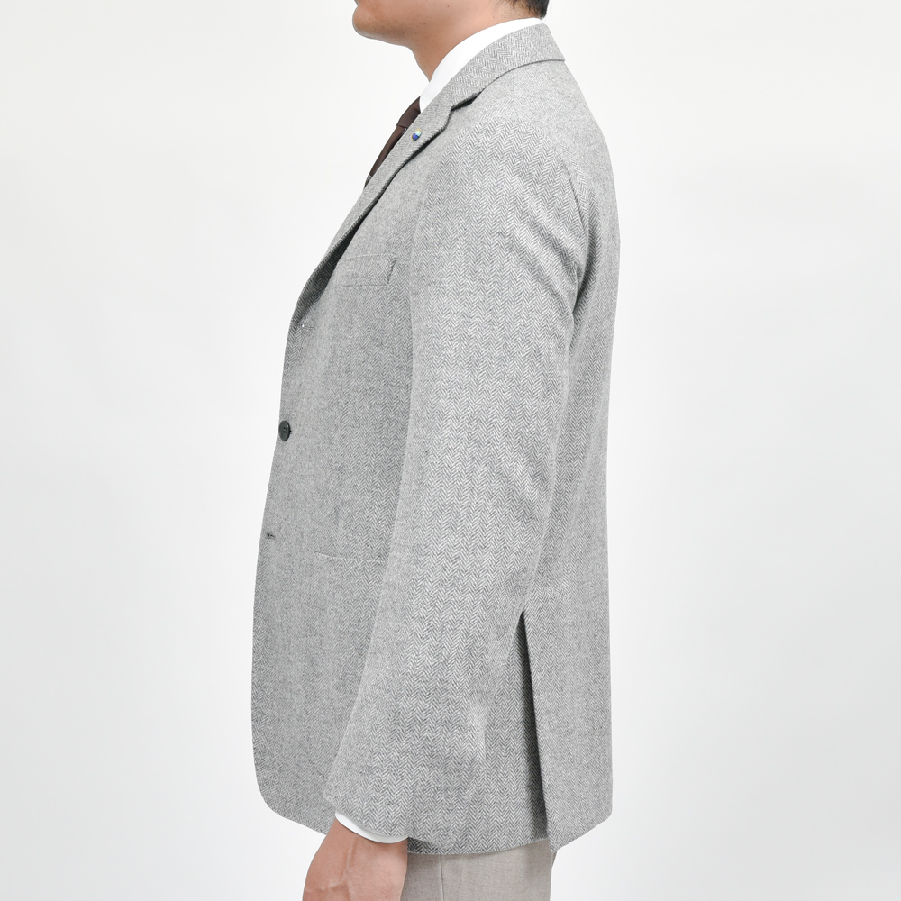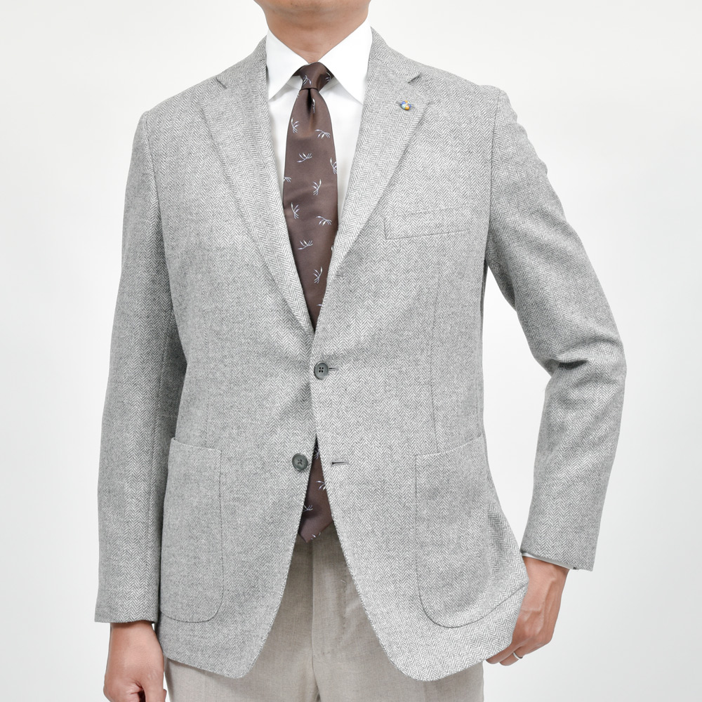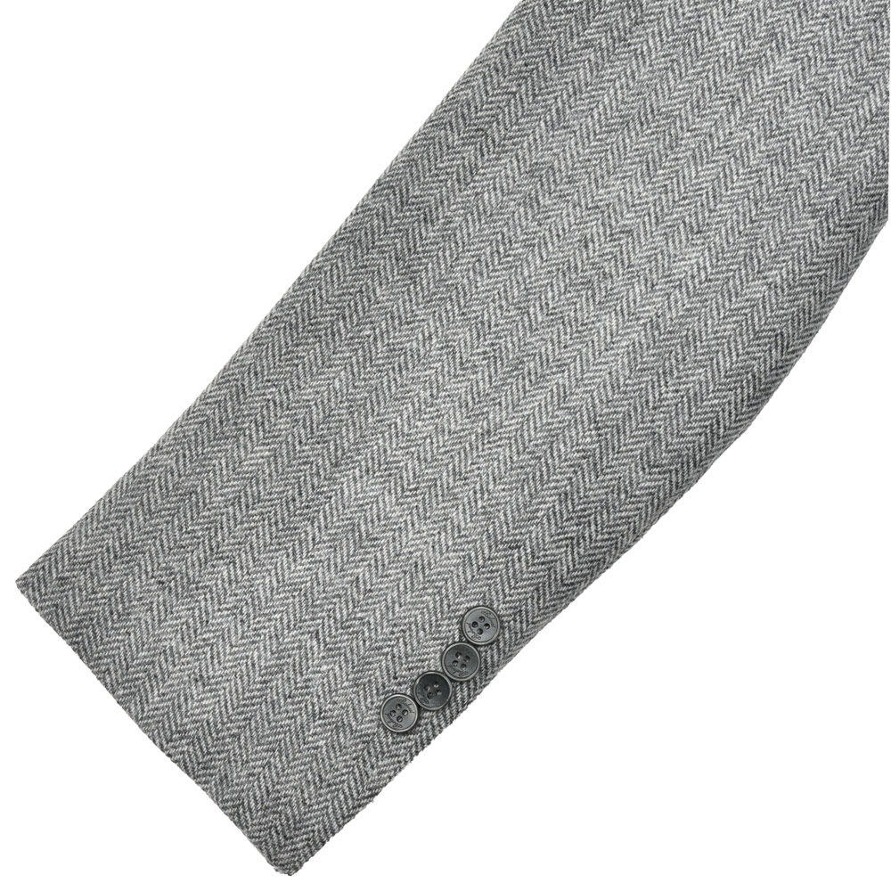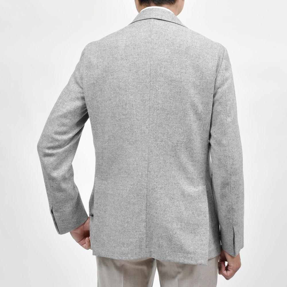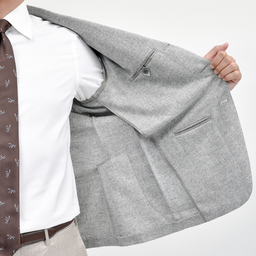 ウールに3%のカシミアをブレンドしたライトグレーのヘリンボーン生地は、ふんわりとした起毛感と柔らかさが特徴。