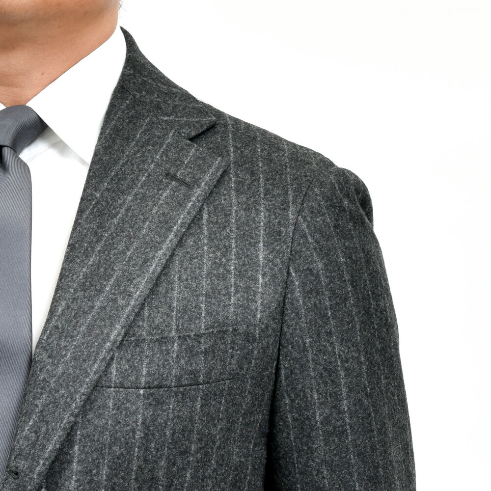 guji made by ring jacketの秋冬の特選素材として定番的に展開しているFox brothersのフランネル“CBT5”。今シーズンはチョークストライプのシングルスーツでご用意致しました。この重量感と柔らかな風合いで、僕たちが愛してやまない生地の一つです。僕も愛用しており、数年着用してだいぶ馴染んできたので、今シーズンも着用するのが楽しみです。