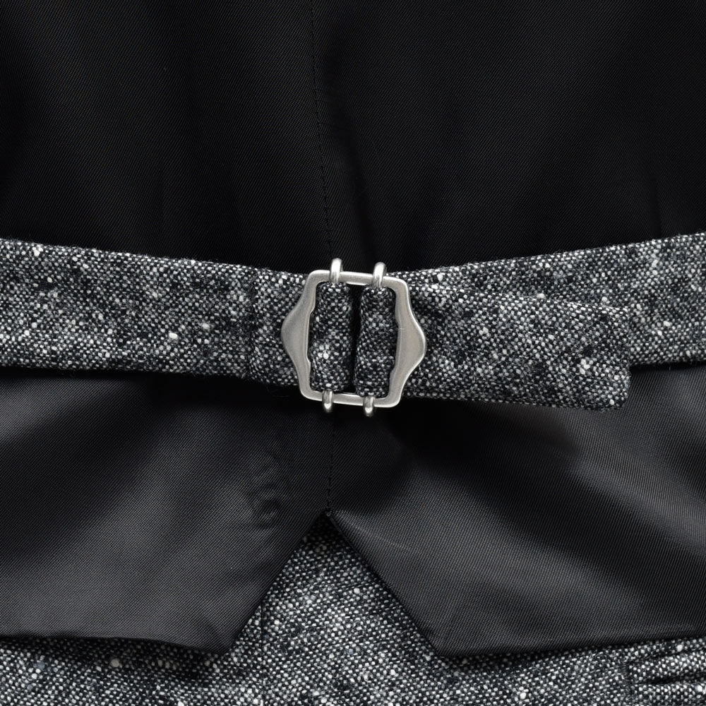 スリーピース、クラシックなシルエットではなくモダンなバランスのものを選ぶことで印象はガラリと変わりますね。 モード的なブランドですとスーツやセットアップはあってもスリーピースはほぼありませんので、オーダーの自由度が高いファクトリーブランドならではの展開かと思います。 ボクシーでシェイプを感じさせないスタイルに、あえてウエストをきゅっと引き締めるジレを合わせるという挑戦ですね。 スタッフ 西出 |