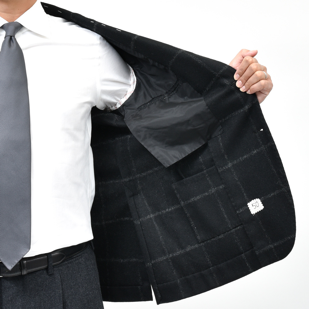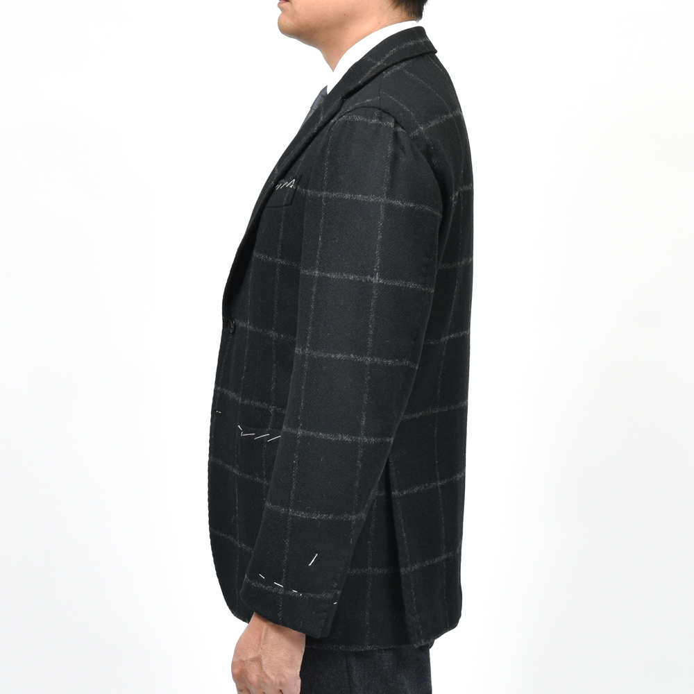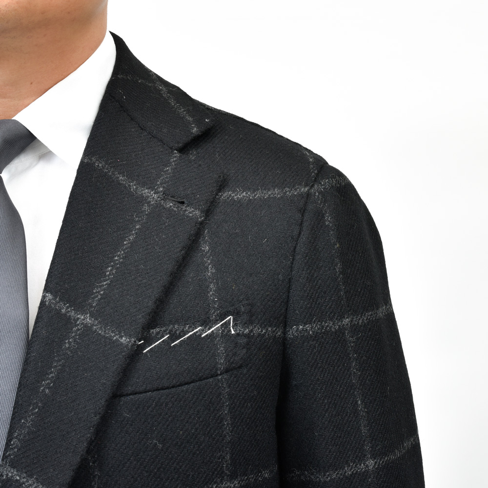 深いブラックベースに配されたウィンドーペーンが、ツイード特有のざっくりとした織り目の中で繊細に浮かび上がる生地です。 程よい厚みと温かみを持ちつつ、仕立て映えする適度な張りがあり、ナポリ仕立ての柔らかなフォルムとも美しく調和します。 モノトーンのチェックは控えめながら存在感があり、ジャケット一枚で現代的な雰囲気とクラシックな品格を両立してくれますよ。 Alfonso Siricaのジャケットについて 副資材を最小限におさえた軽量な仕立て、カマが深いアームホールにより運動量が確保され快適な着心地です。 肩は、ナポリ仕立て特有のマニカカミーチャ(雨降り袖)仕様で、いせ込みによる立体感と柔らかな表情が特徴です。 3ボタン / アンライニング / ハーフキャンバス / サイドベンツ / パッチポケット /アンフィニッシュドスリーブ |