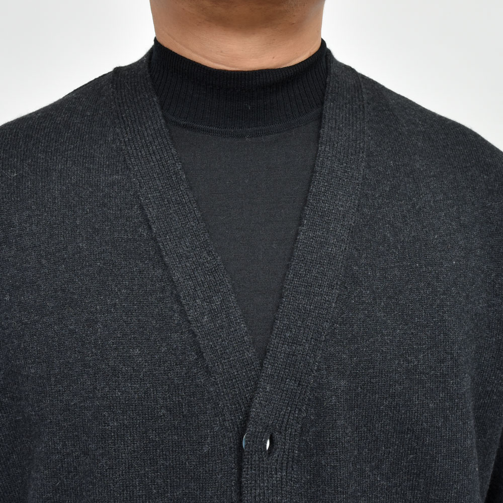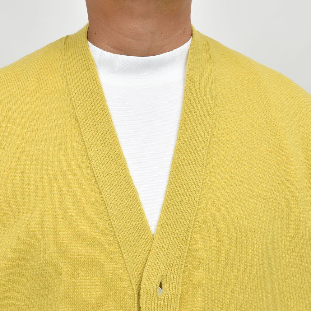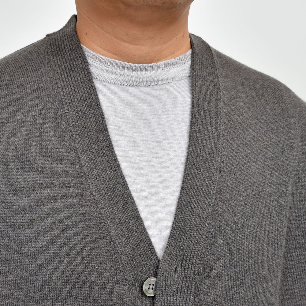 ただ作りに関してはこだわりが発揮されていまして、カーディガンにありながちなネック部分のリブが寄れてしまわないように前立て部分を7ゲージにしてフィット感を高めたり、シルエットも過度にスマートにしすぎず、身頃は12ゲージの糸を使うことでクリーンな雰囲気を強調。いつ着ても適度なリラックス感を演出できるようにバランスを整えています。