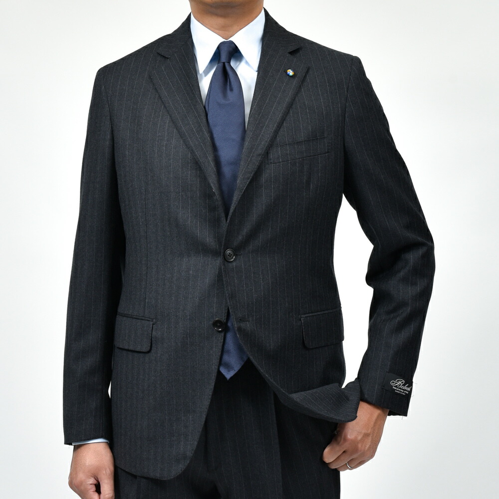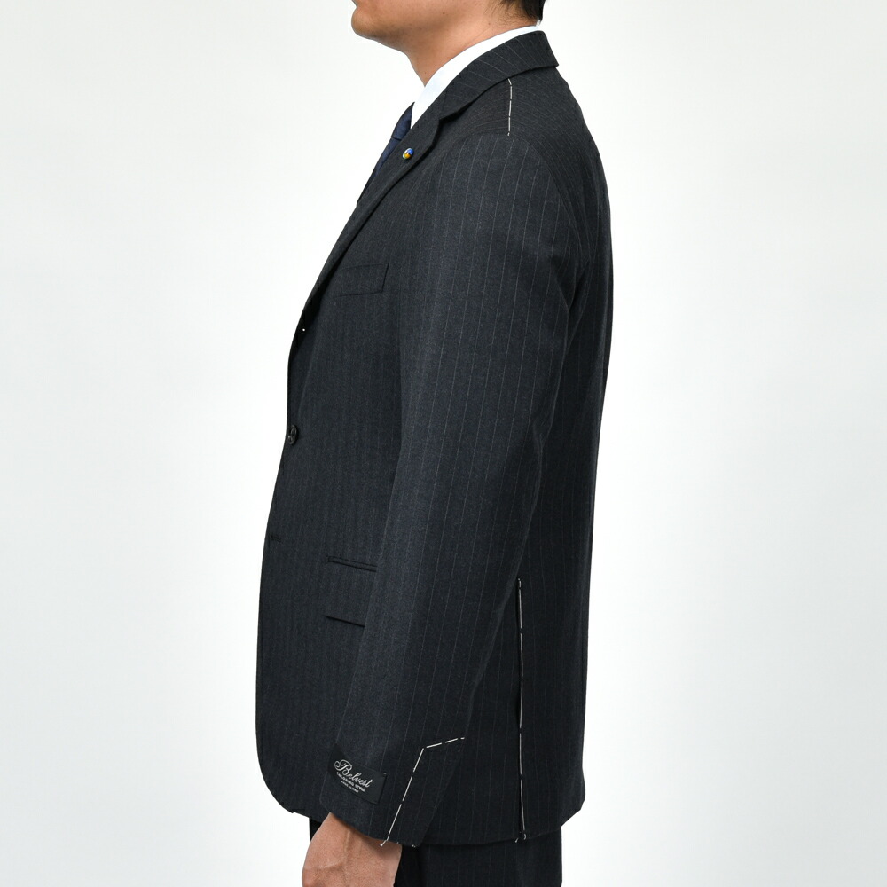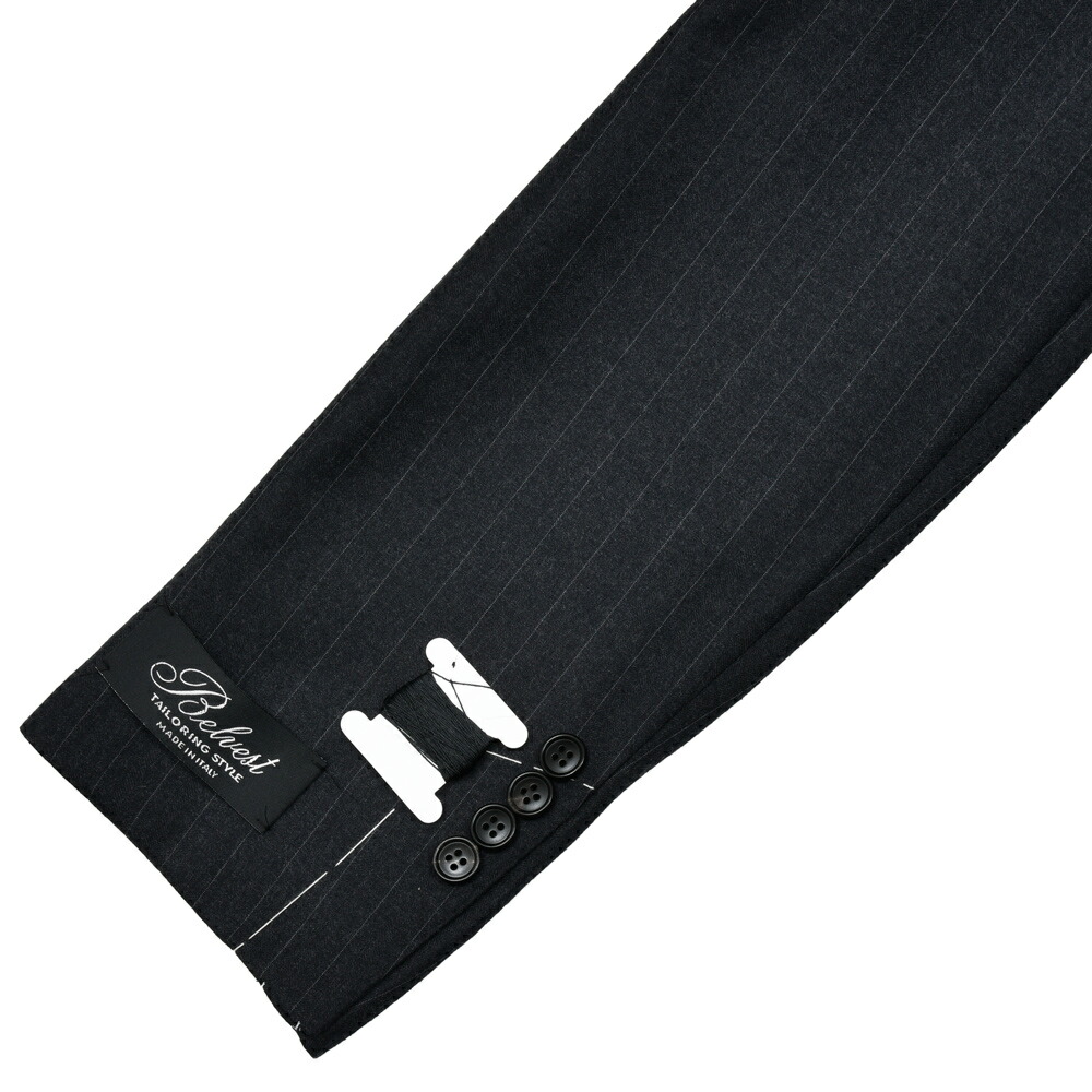 落ち着きのあるストライプ生地が上品さと知的な雰囲気を漂わせ、BELVESTの仕立てにマッチし、包み込まれるような着心地は、至極のスーツに仕上がっております。