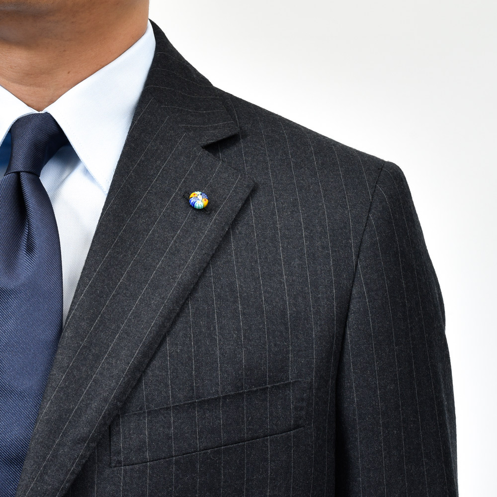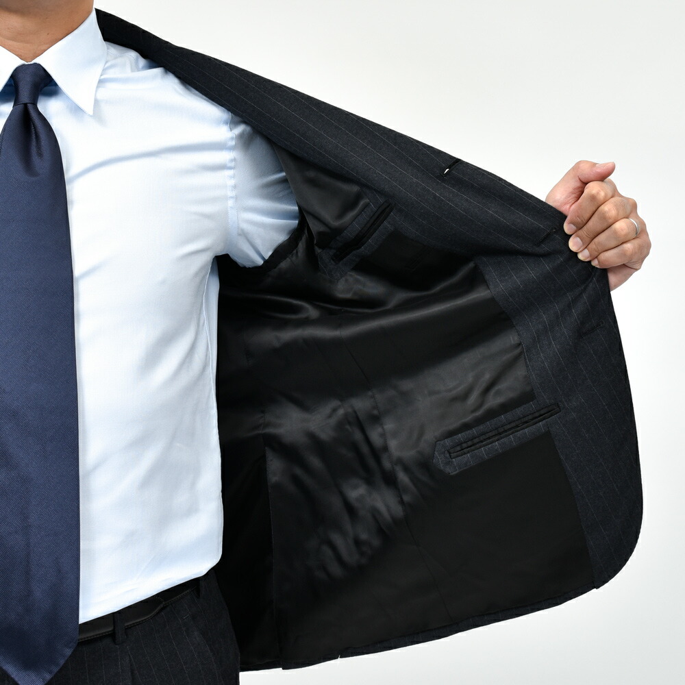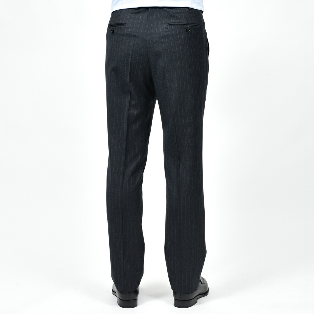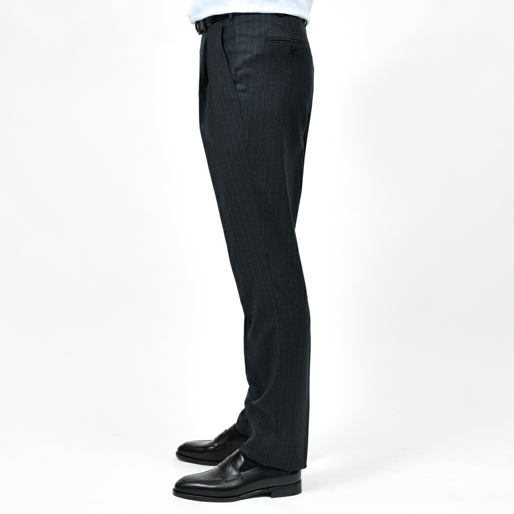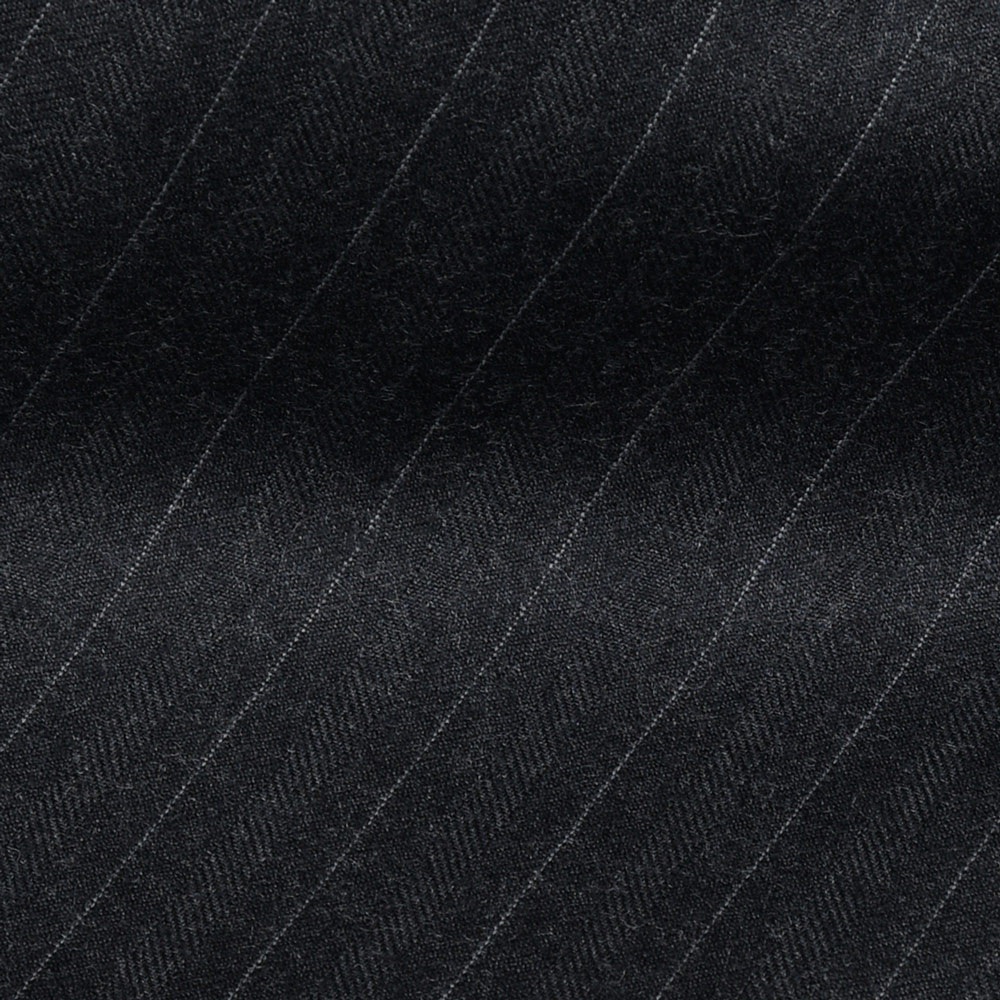 上質な100%ウールのピンストライプ生地は、滑らかでしなやかなタッチと程よいハリを兼ね備え、端正で知的な印象です。