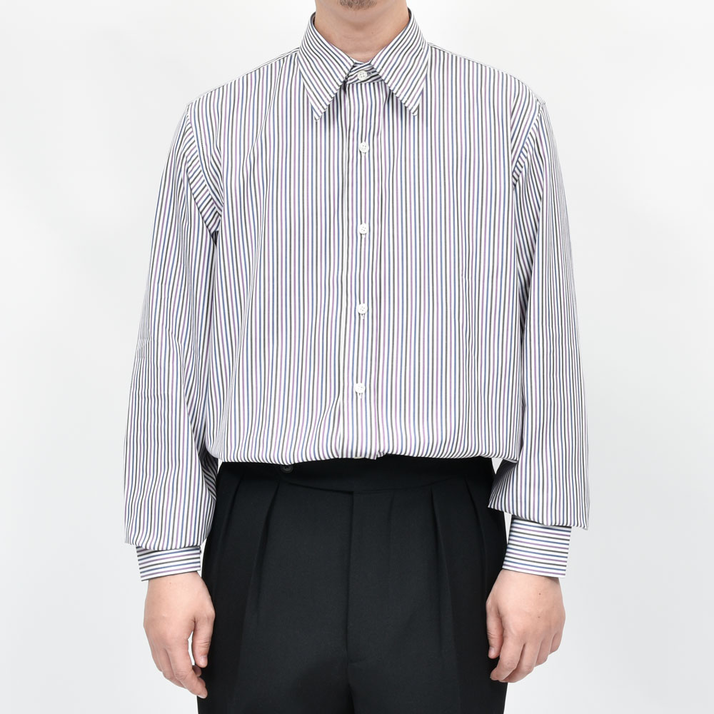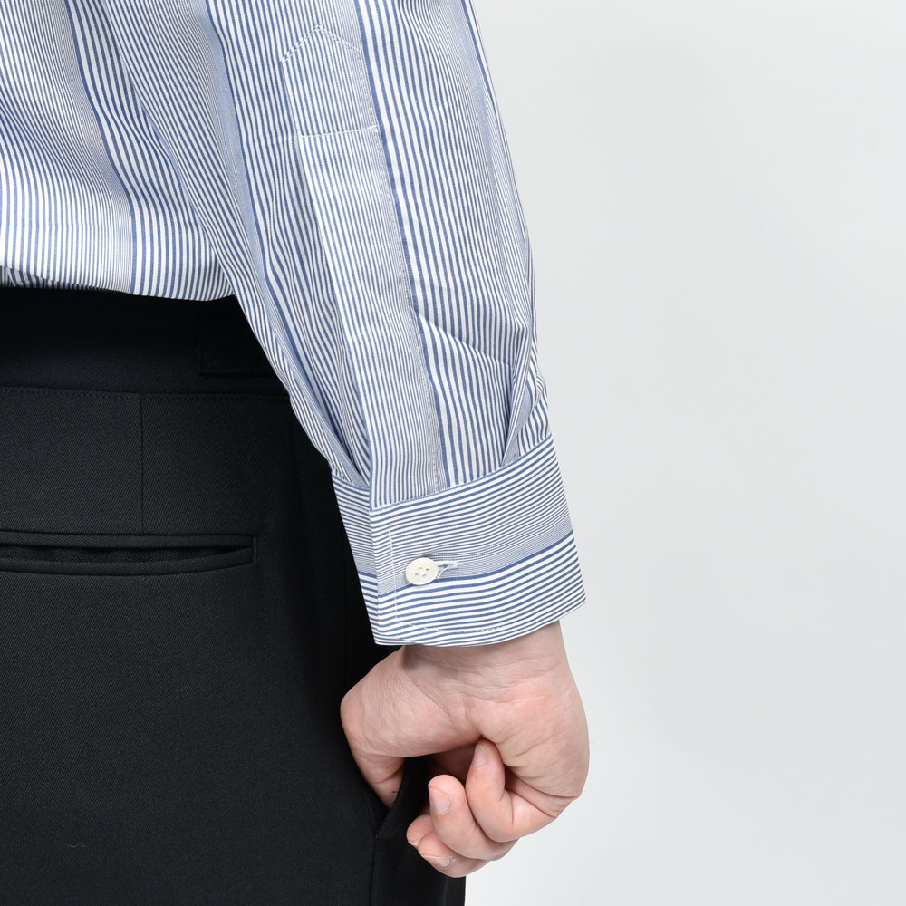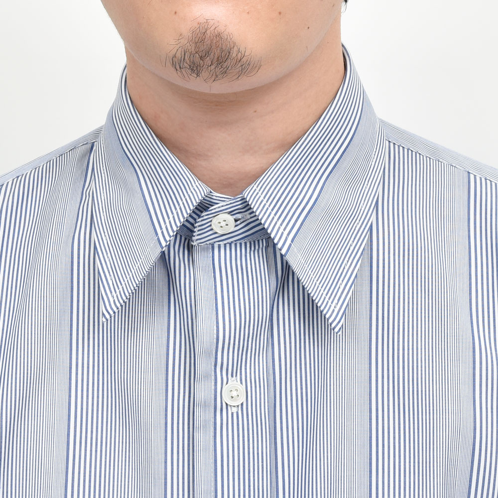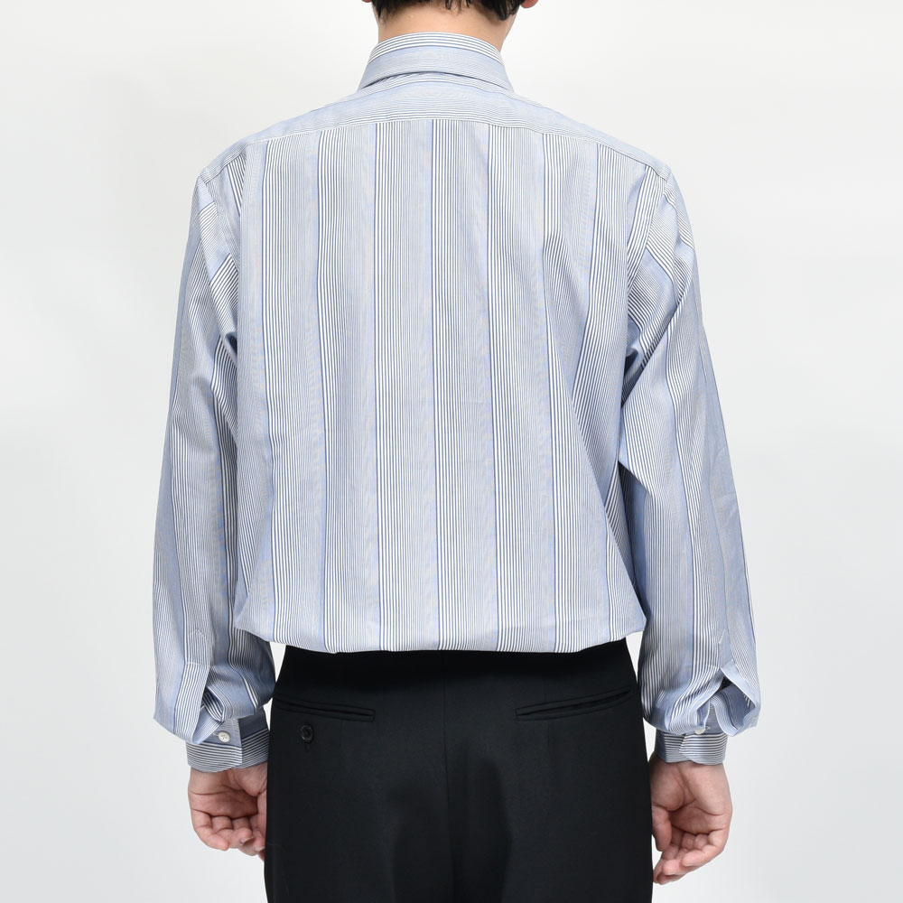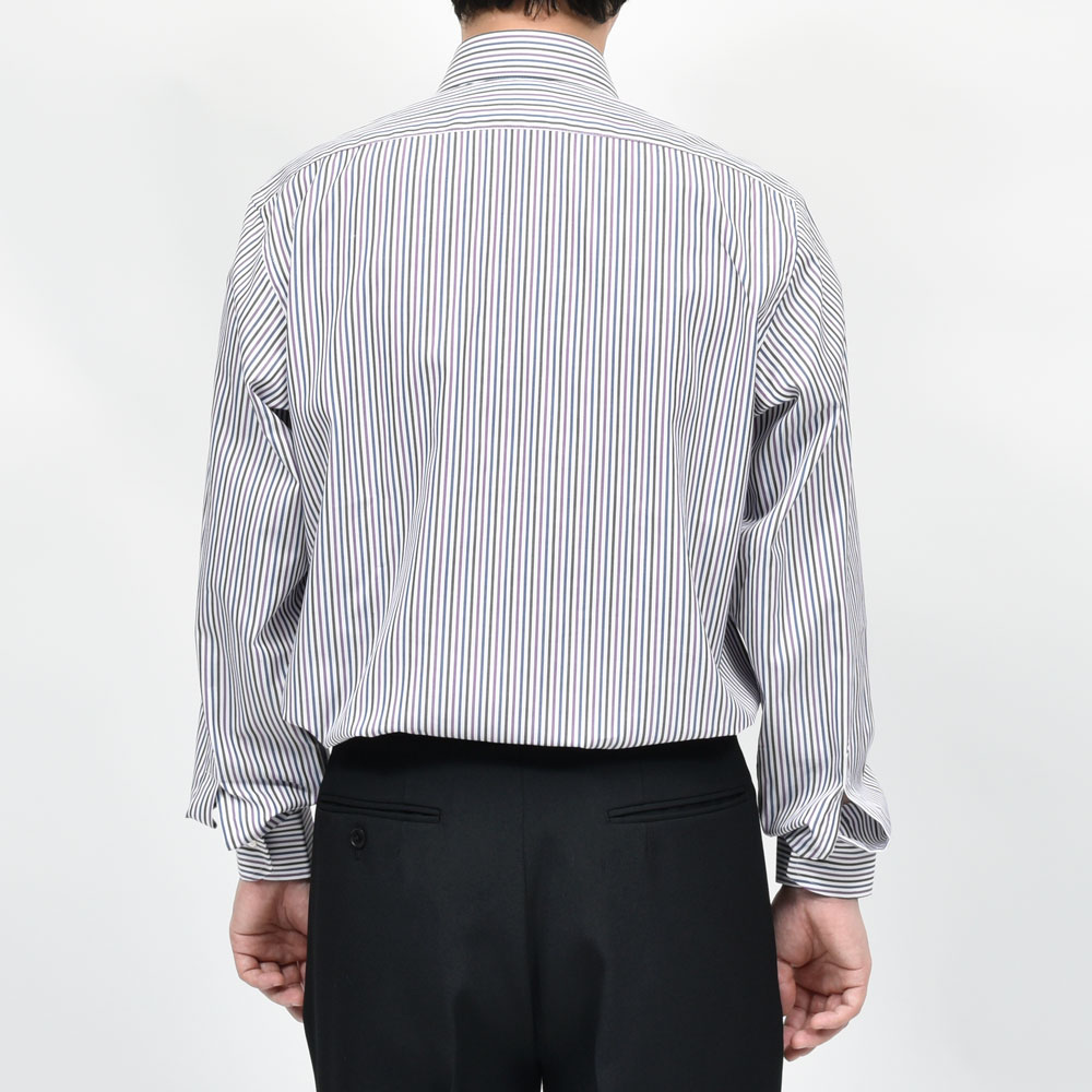 英国らしいストライプを採用、さらにクラシックなポインテッドカラーという組み合わせ、ズバリな感じではありますが襟の芯地はソフトなものにすることで、やや柔らかなニュアンスにしています。