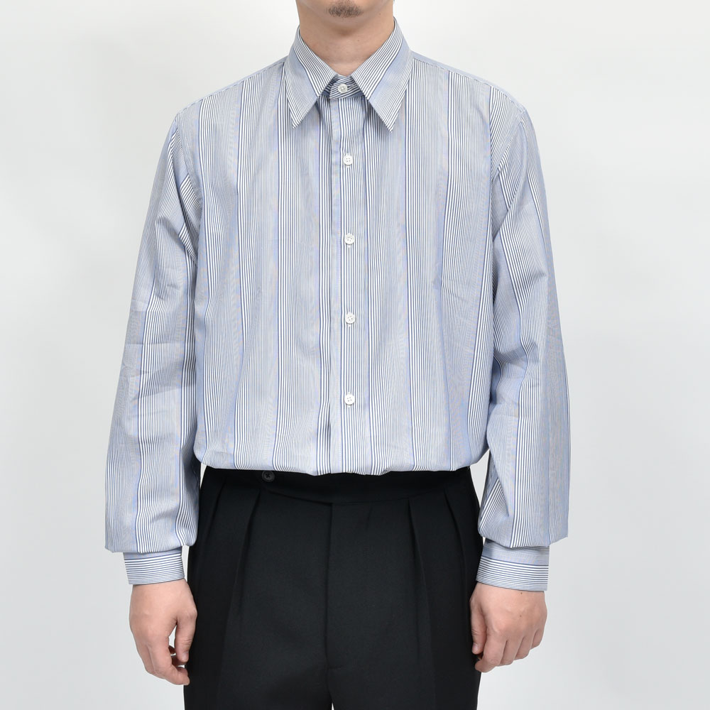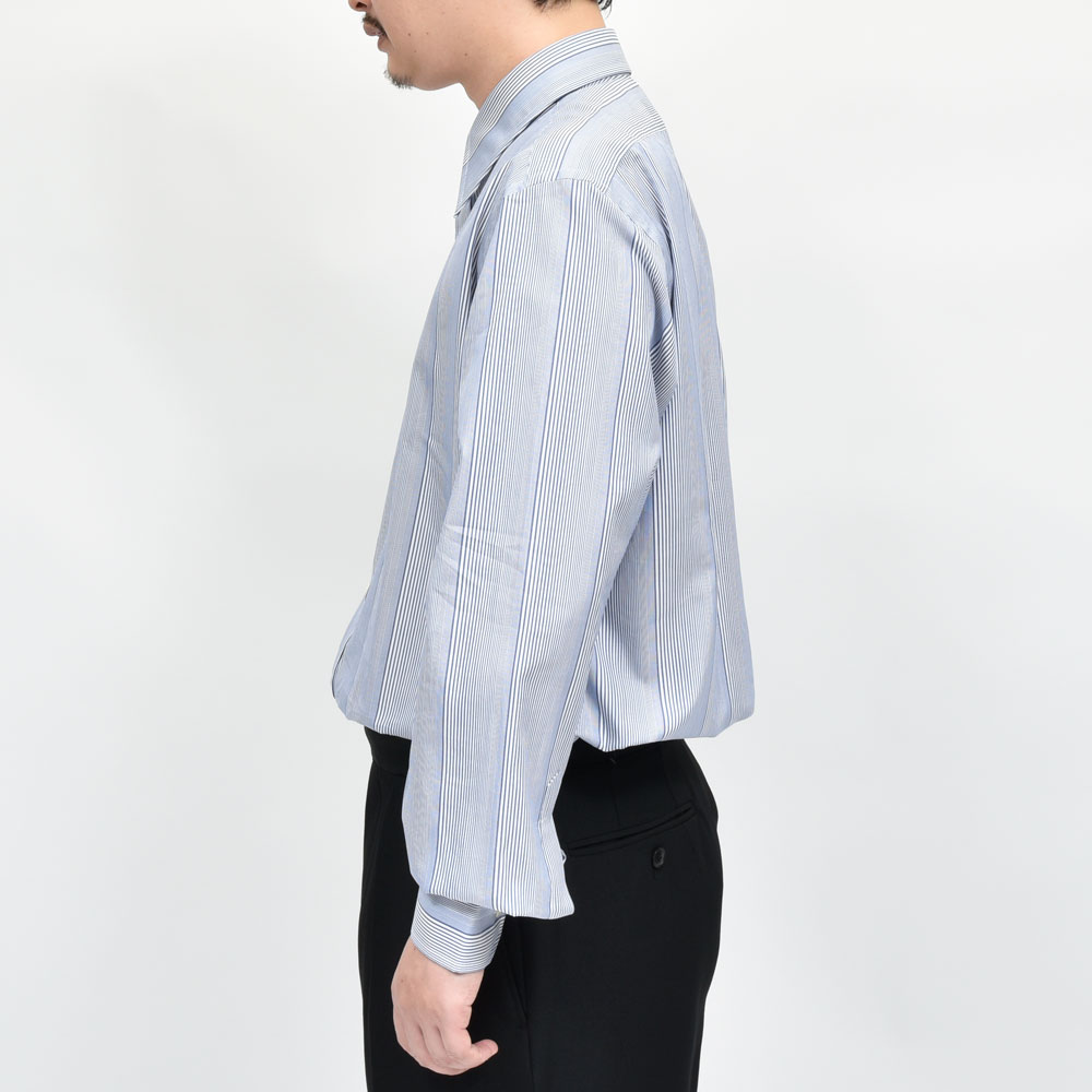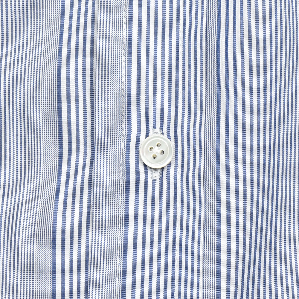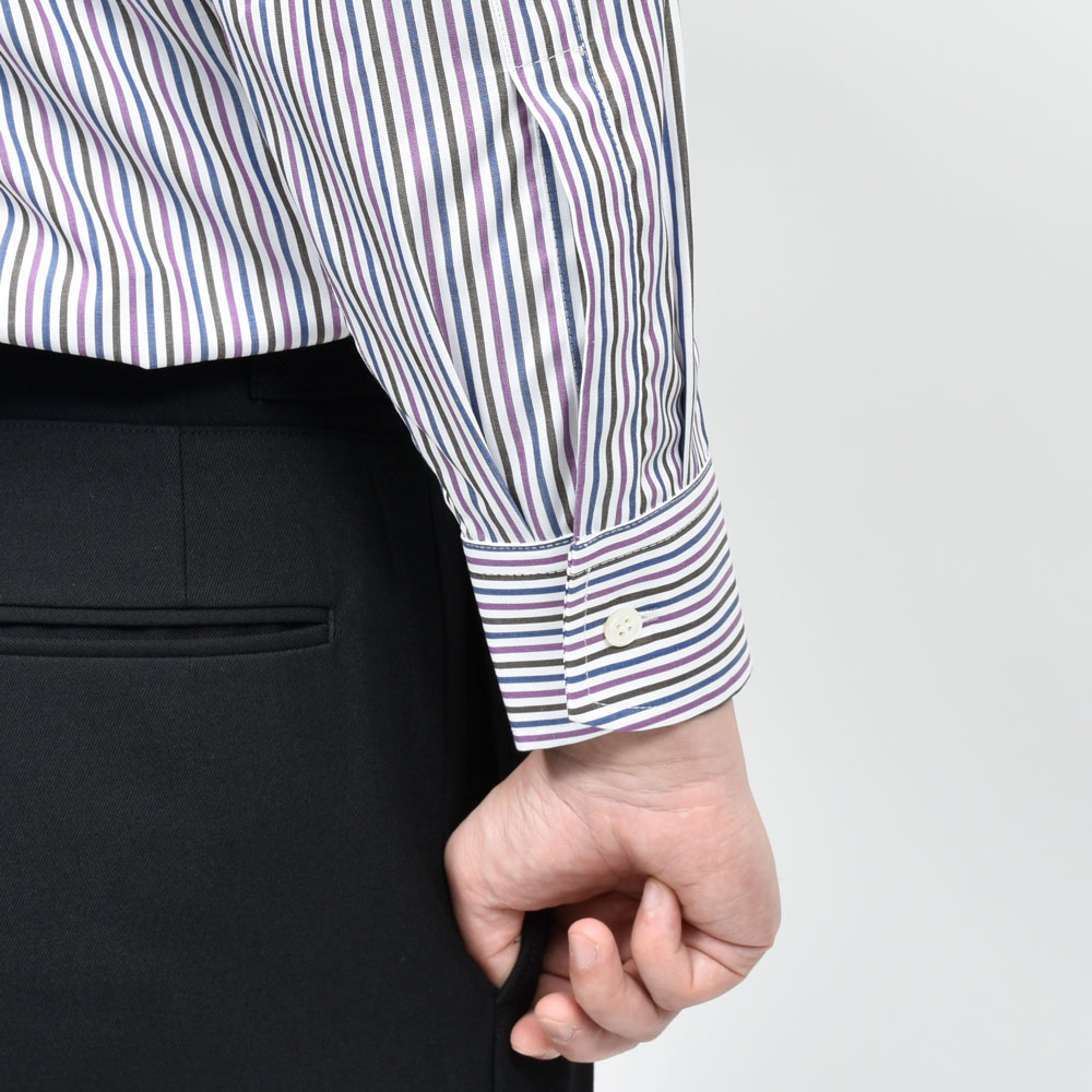 英国らしいストライプを採用、さらにクラシックなポインテッドカラーという組み合わせ、ズバリな感じではありますが襟の芯地はソフトなものにすることで、やや柔らかなニュアンスにしています。