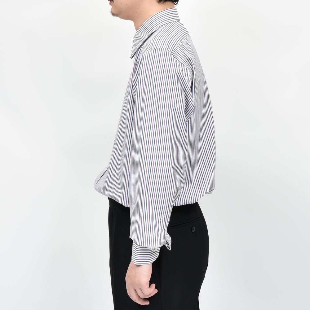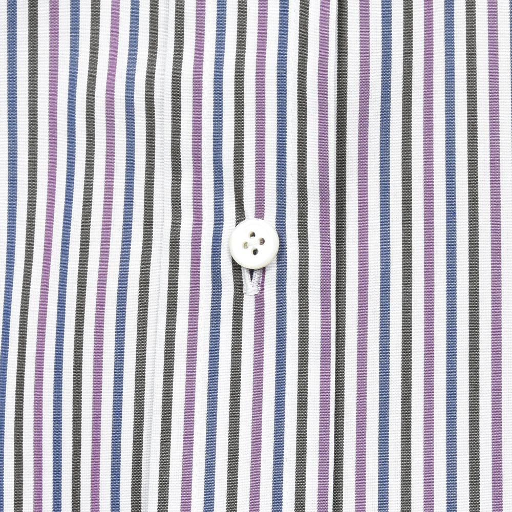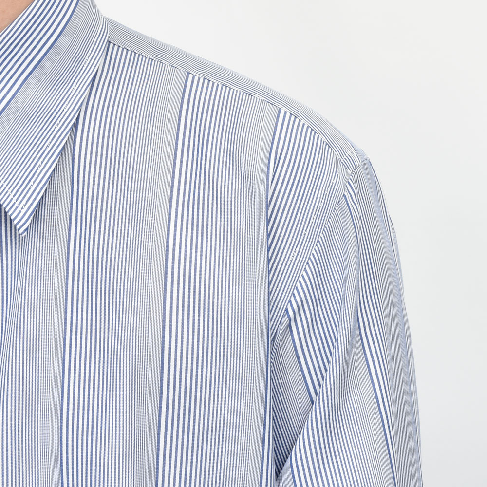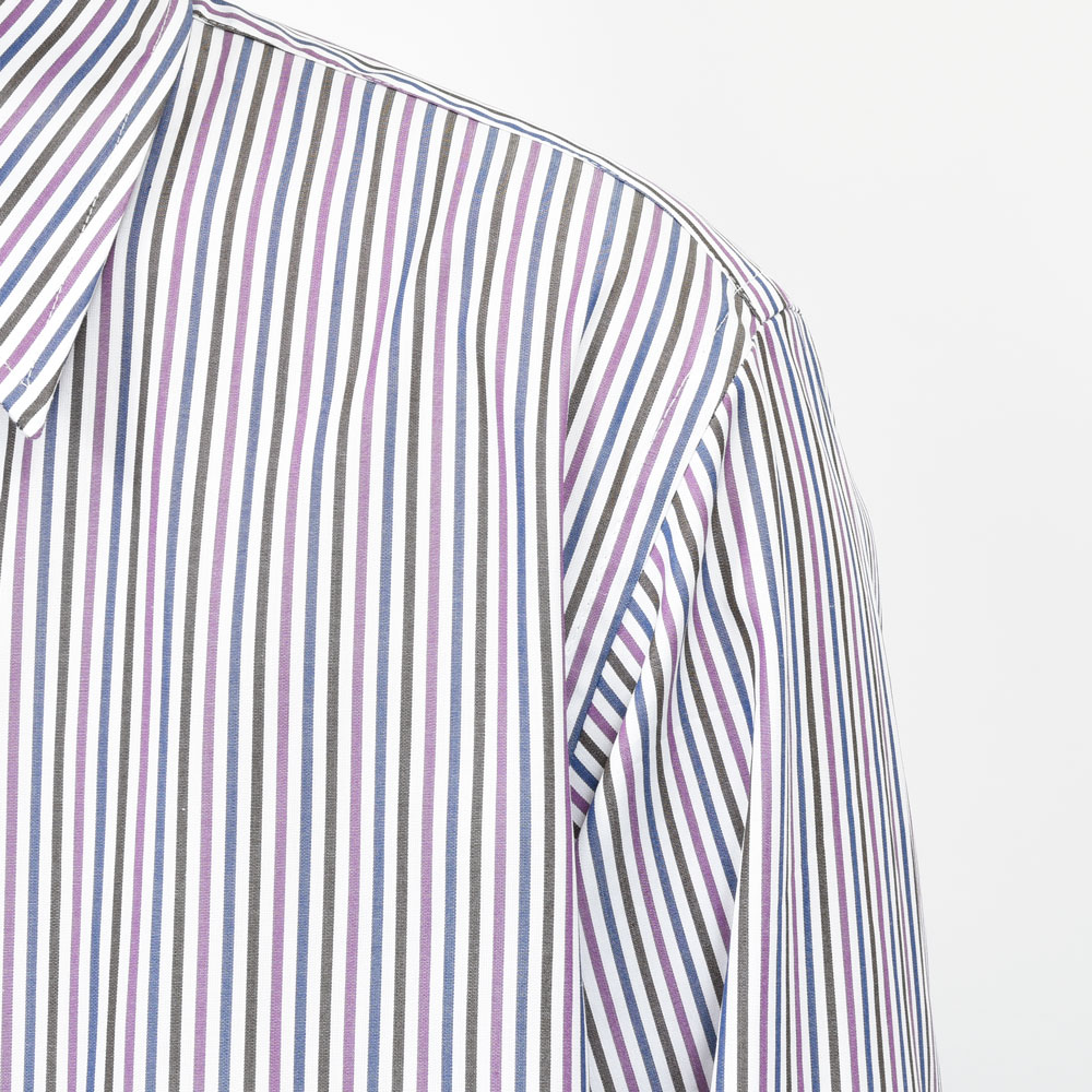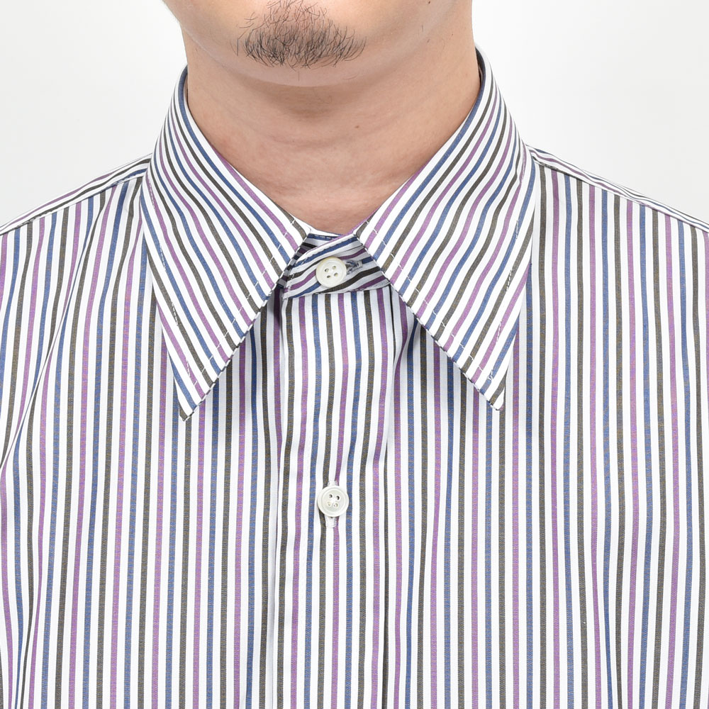 英国らしいストライプを採用、さらにクラシックなポインテッドカラーという組み合わせ、ズバリな感じではありますが襟の芯地はソフトなものにすることで、やや柔らかなニュアンスにしています。