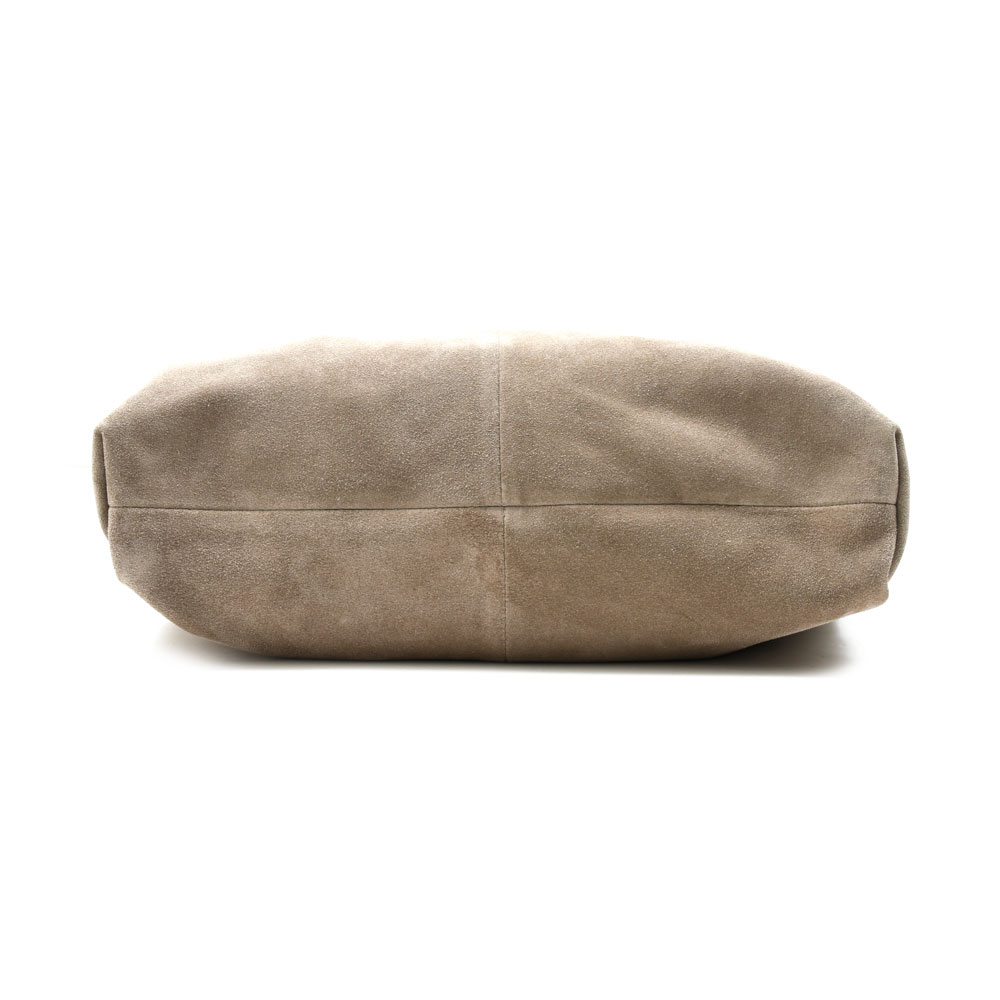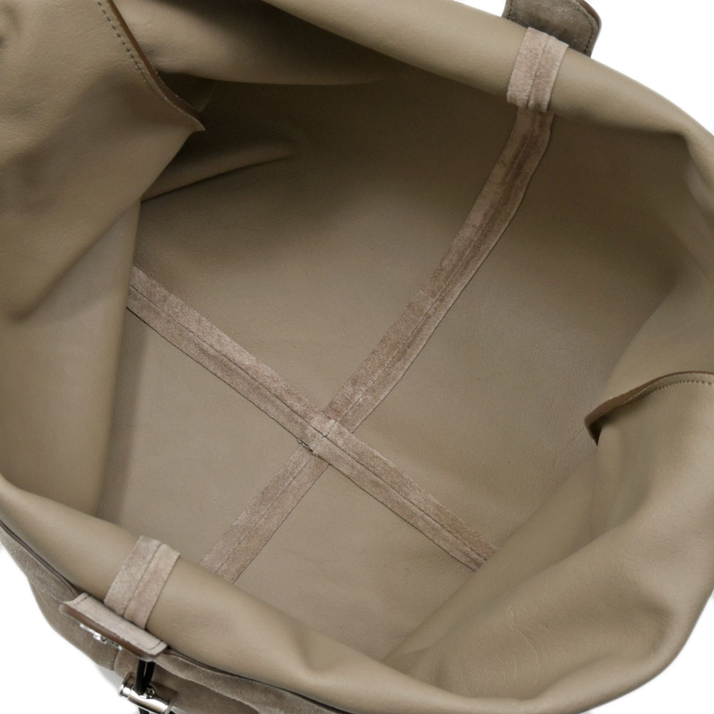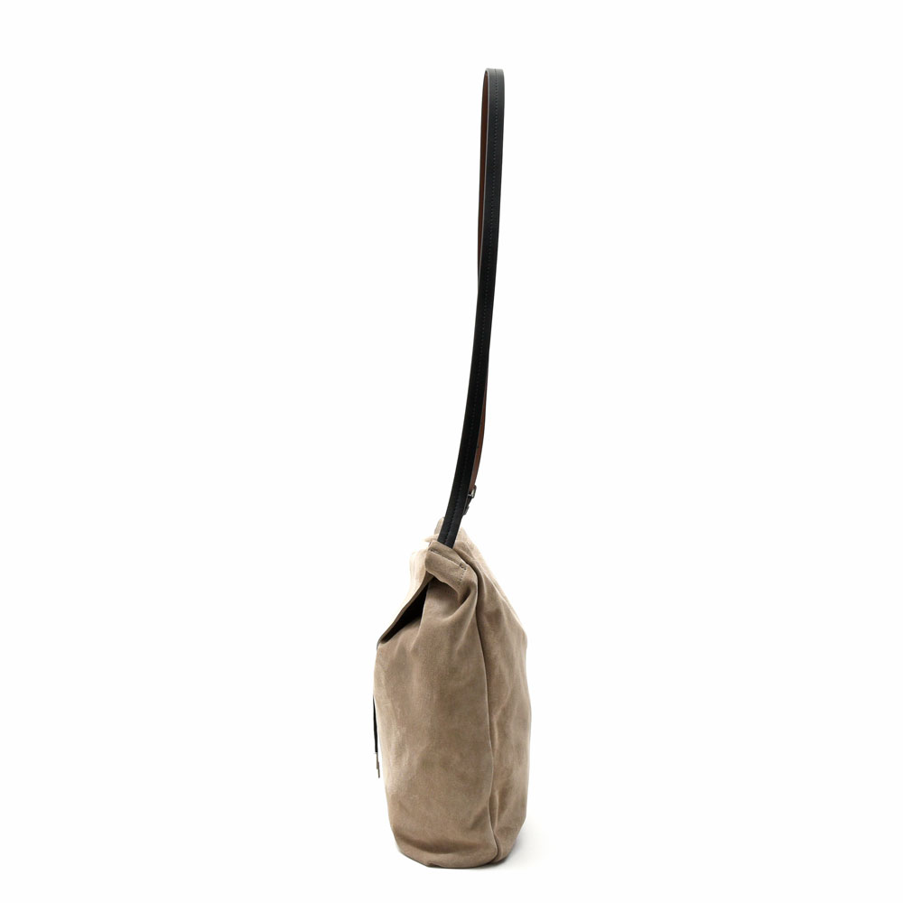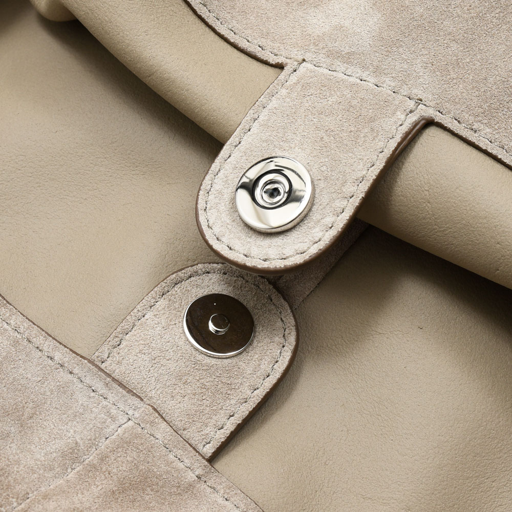 ボディのスエードとストラップのスムースレザーのコントラストがあることで、ボディの雰囲気もより良く見える印象。色合いも柔らかなグレージュ系統の色味になっているのでレザーバッグですが重厚感は出ず、軽やかにさらりと持っていただける逸品になっています。