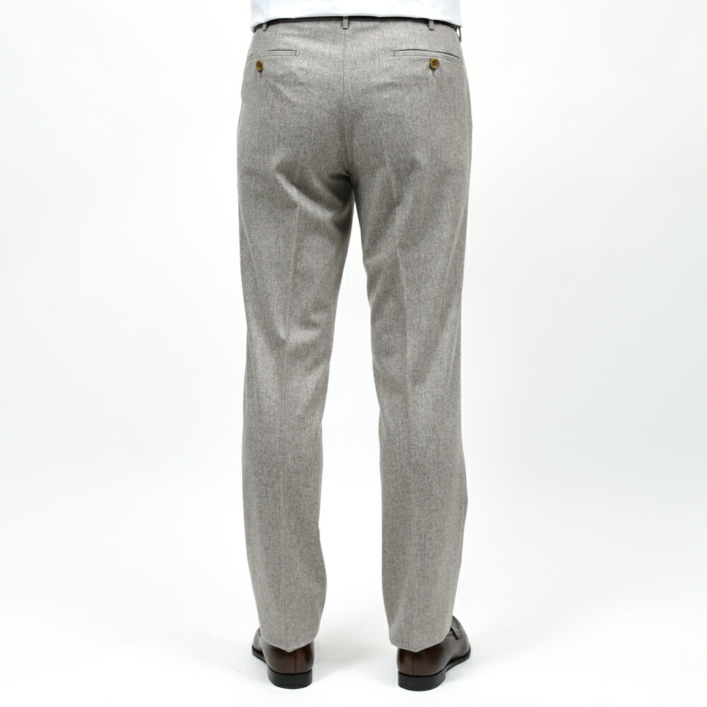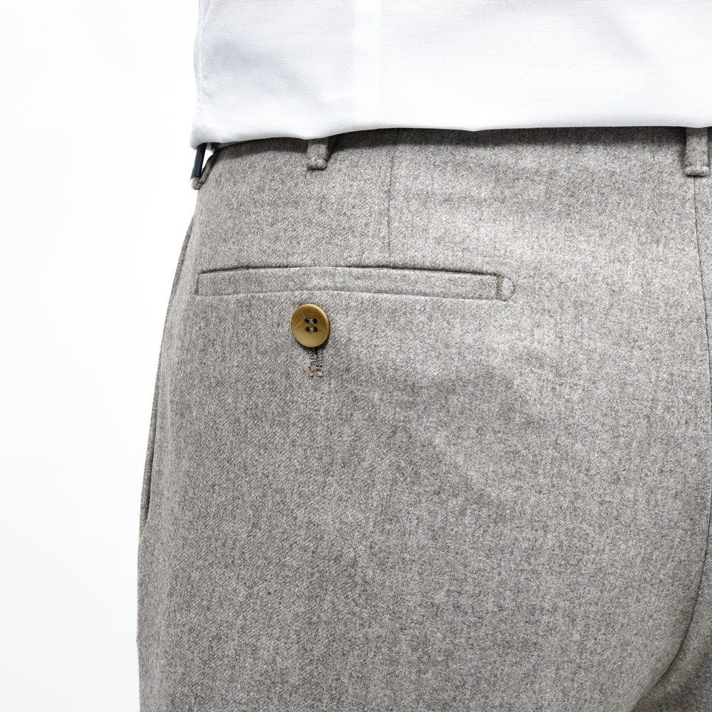 ウールにカシミヤをひとさじ加えた生地は、触れた瞬間にわかるしなやかさと深い表情が魅力で、穿くだけで上質さを実感いただけます。