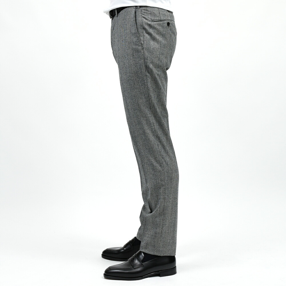 程よくタイトなフィット感で、ノープリーツ仕様により腰回りをすっきりと見せてくれます。