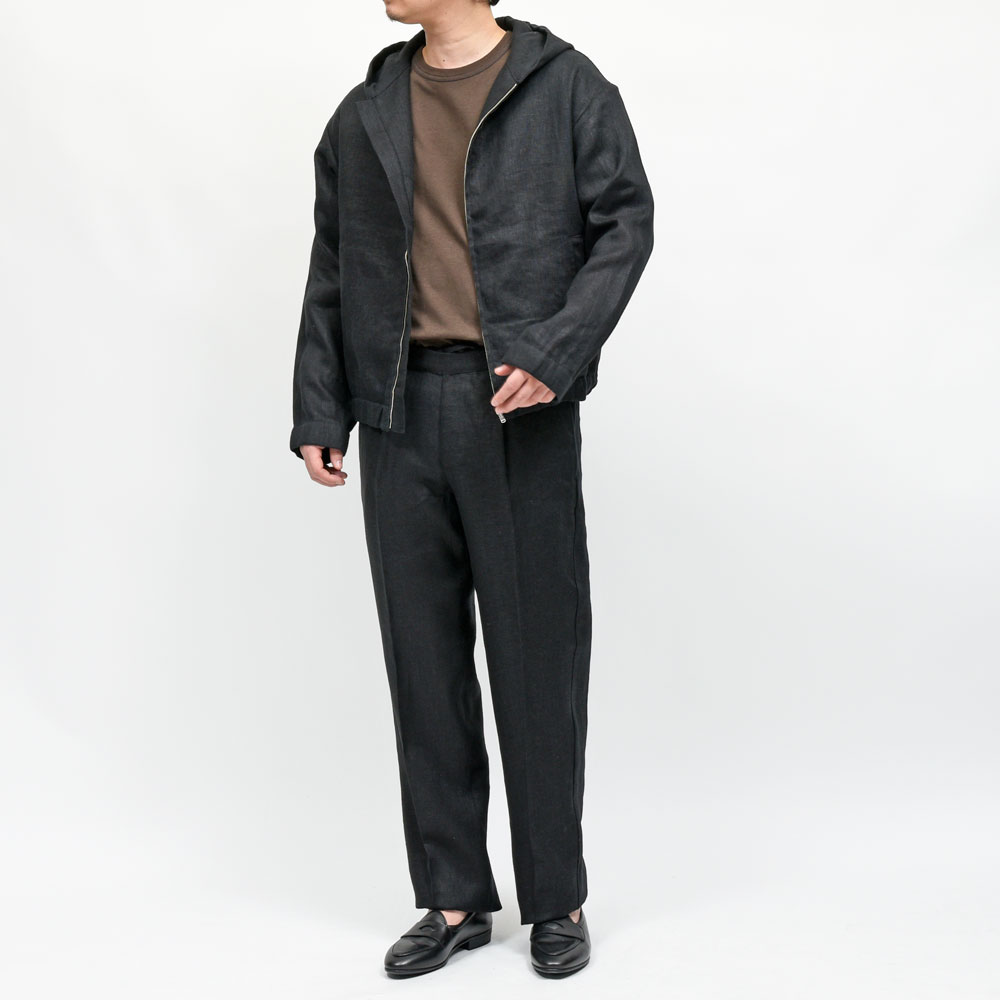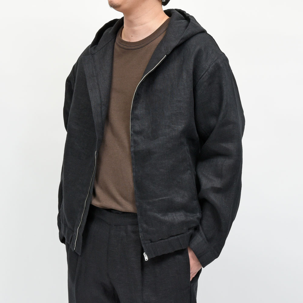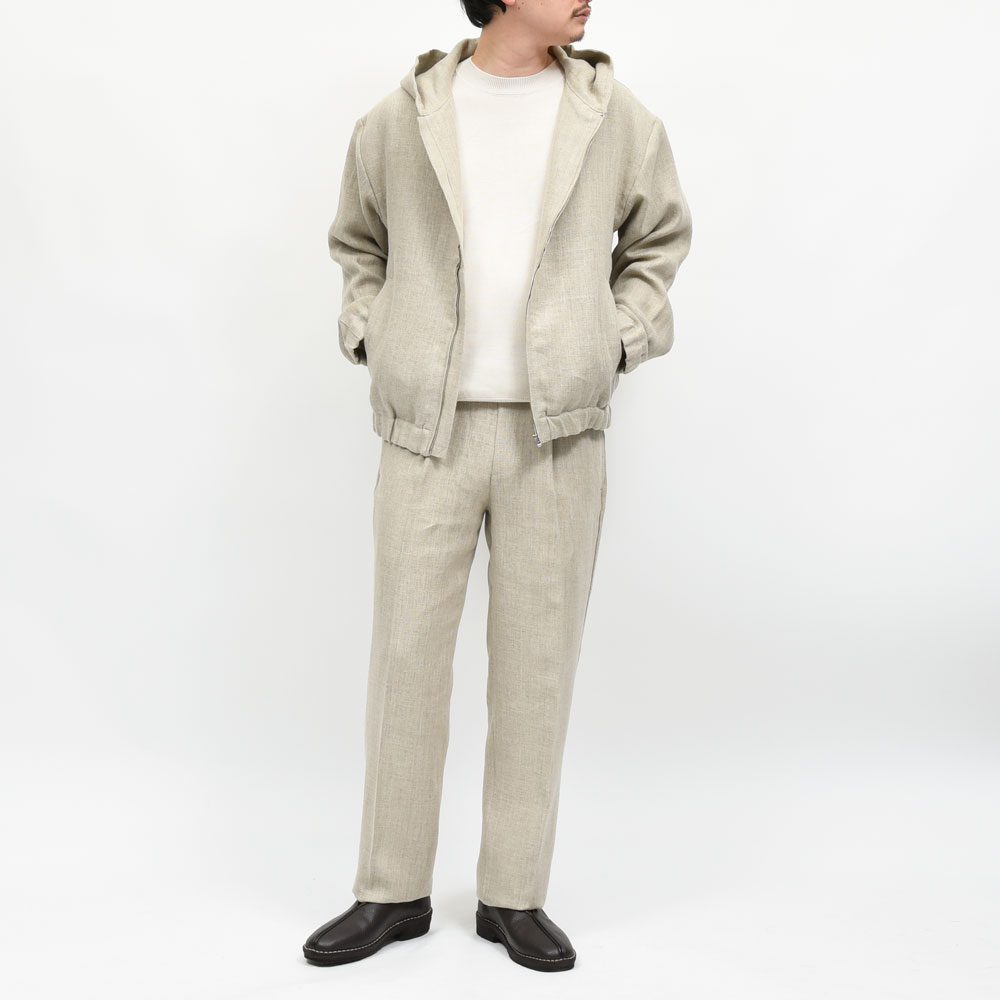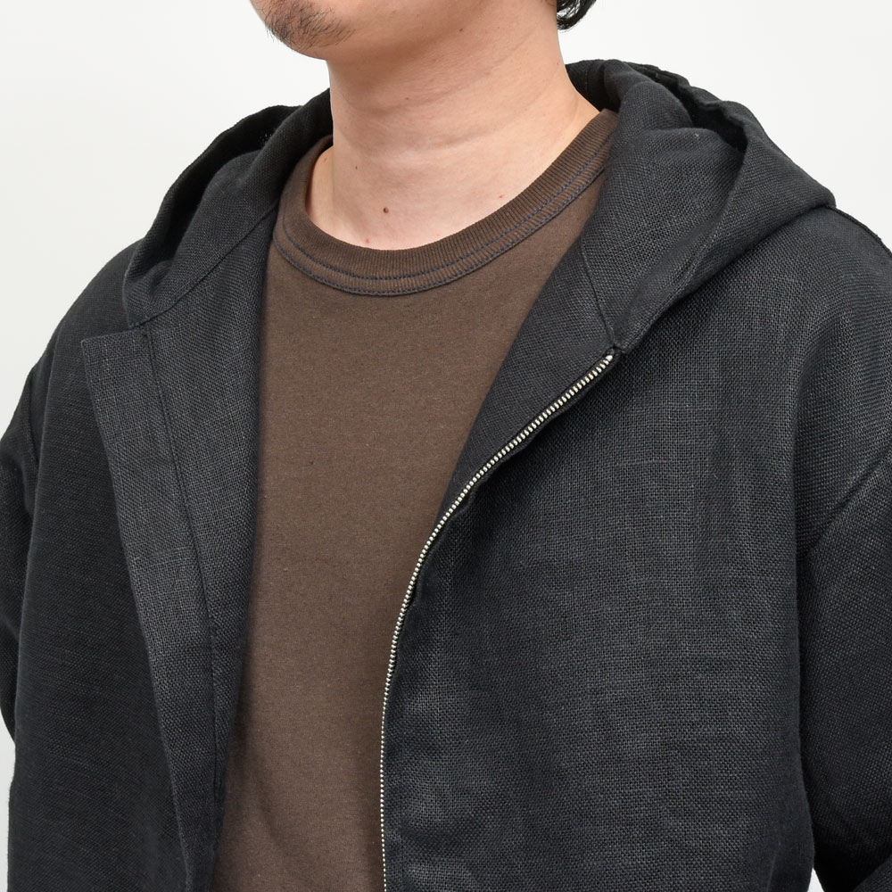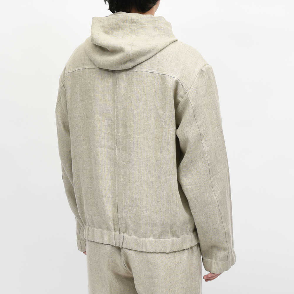 フーディータイプのブルゾンは使用する生地によってかなり印象が変わるわけでして、こちらはシャキッとしたリネンを用いているのでとても上品です。