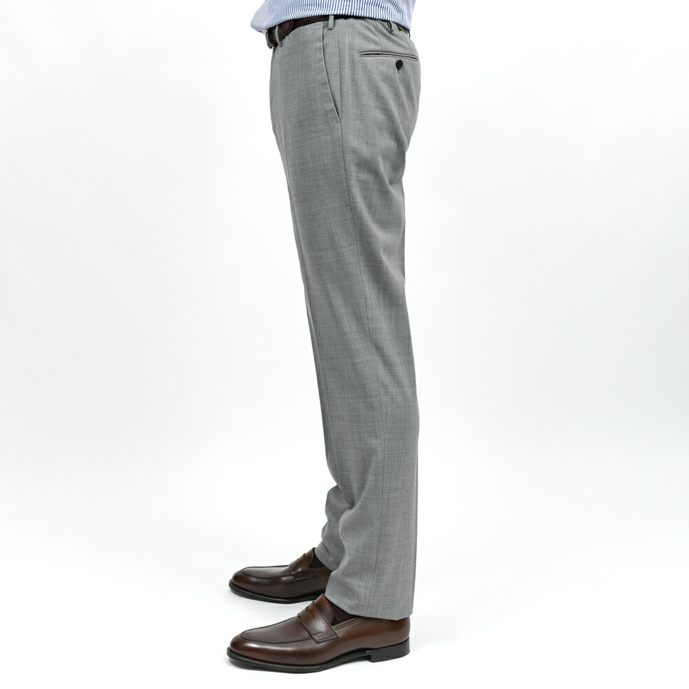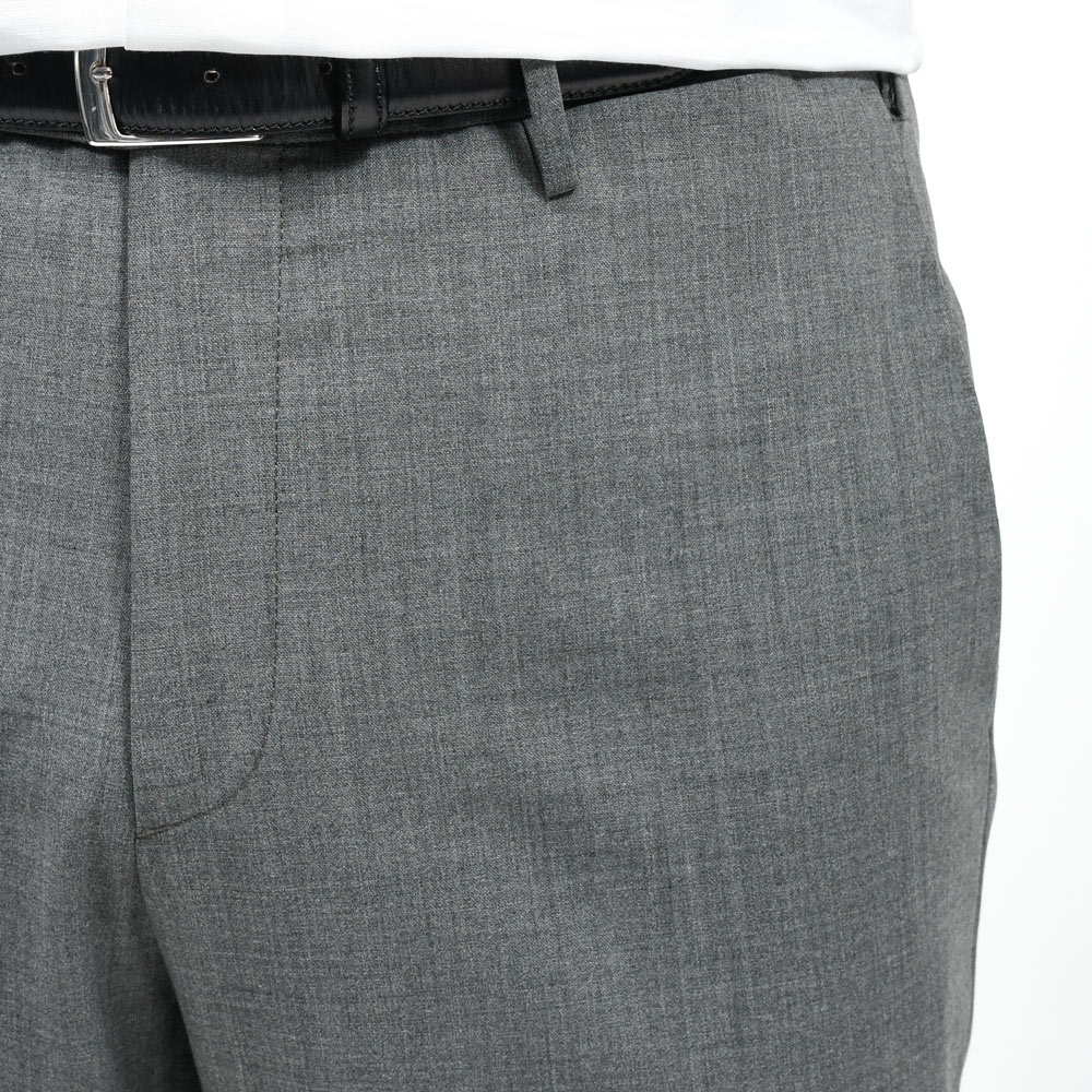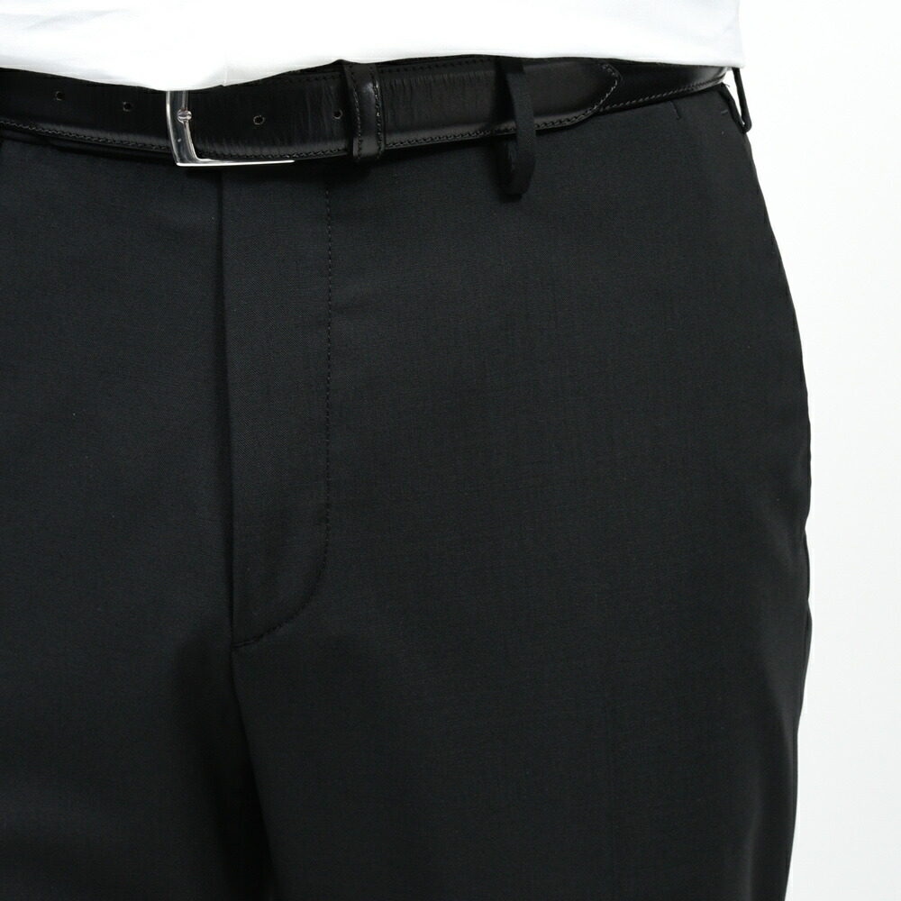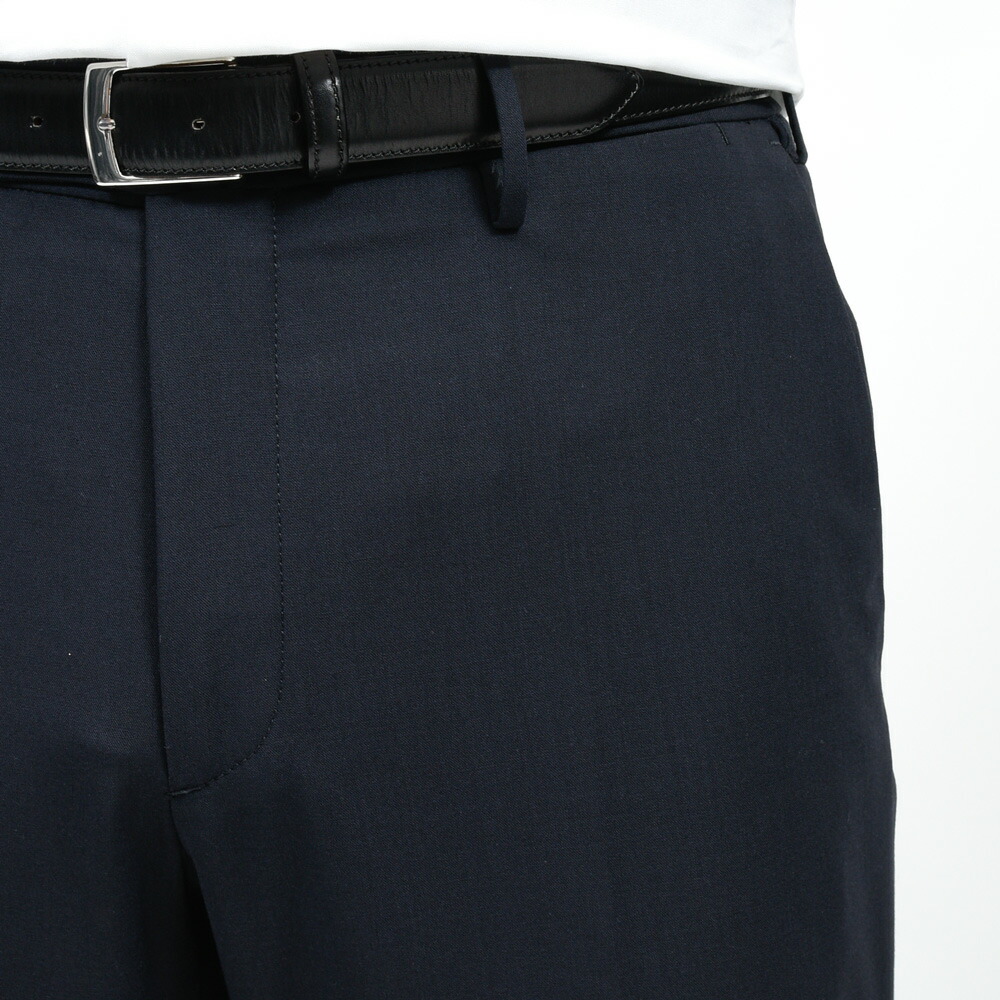ノープリーツ仕様によりウエスト周りがすっきりと収まり、ビジネスシーンでも端正に映るシルエットを形成します。