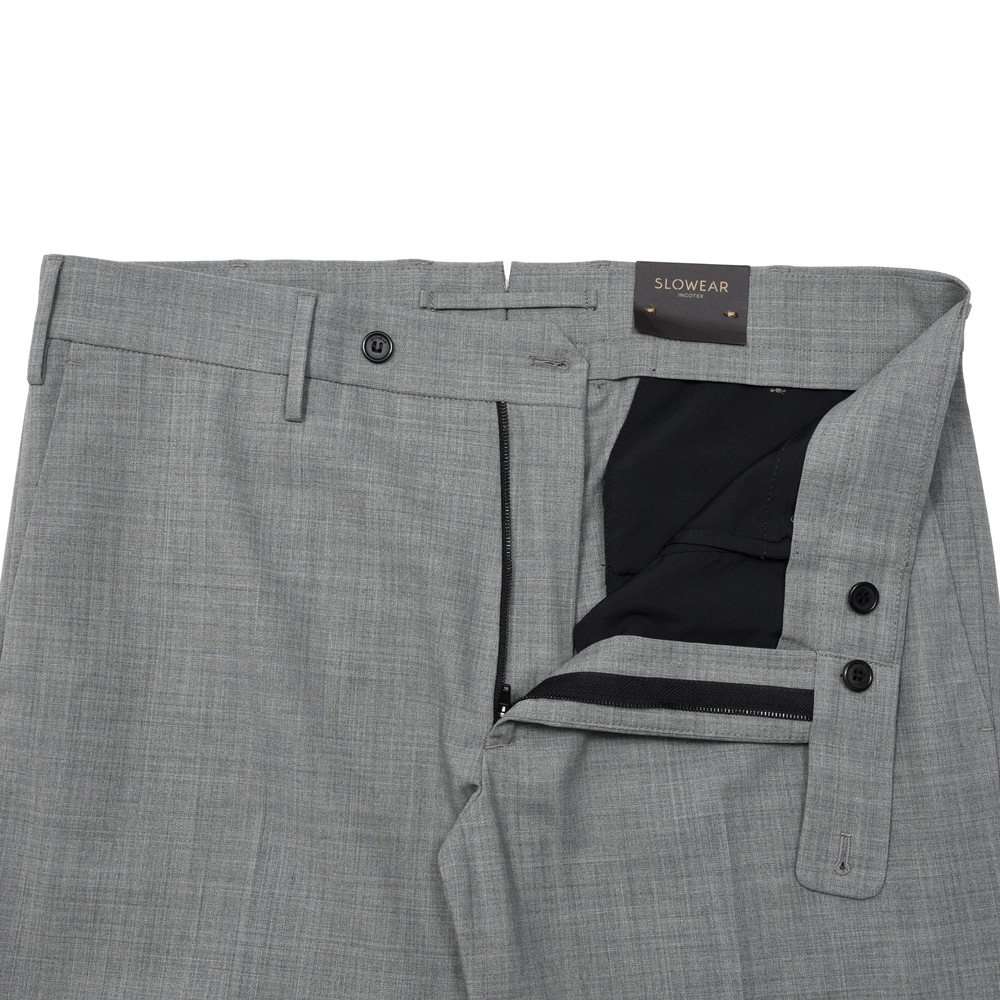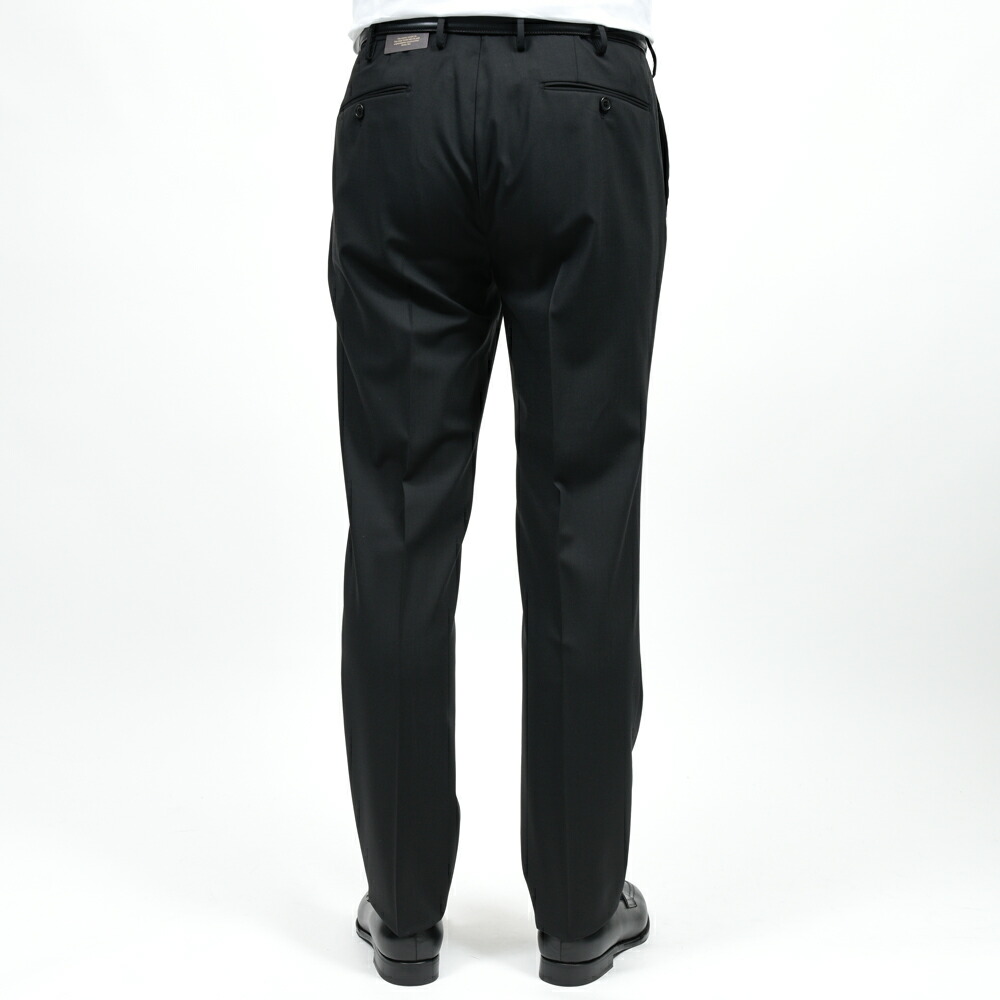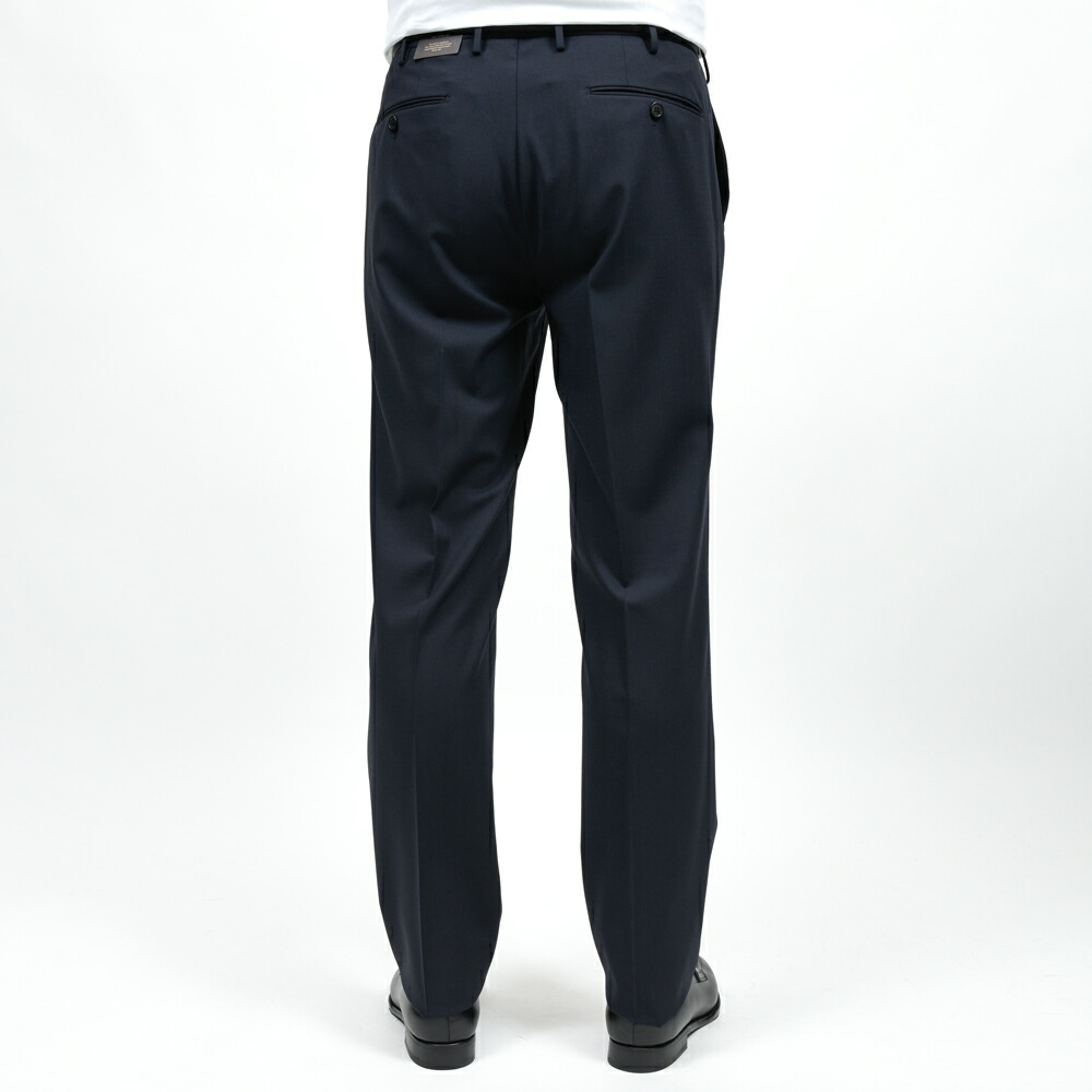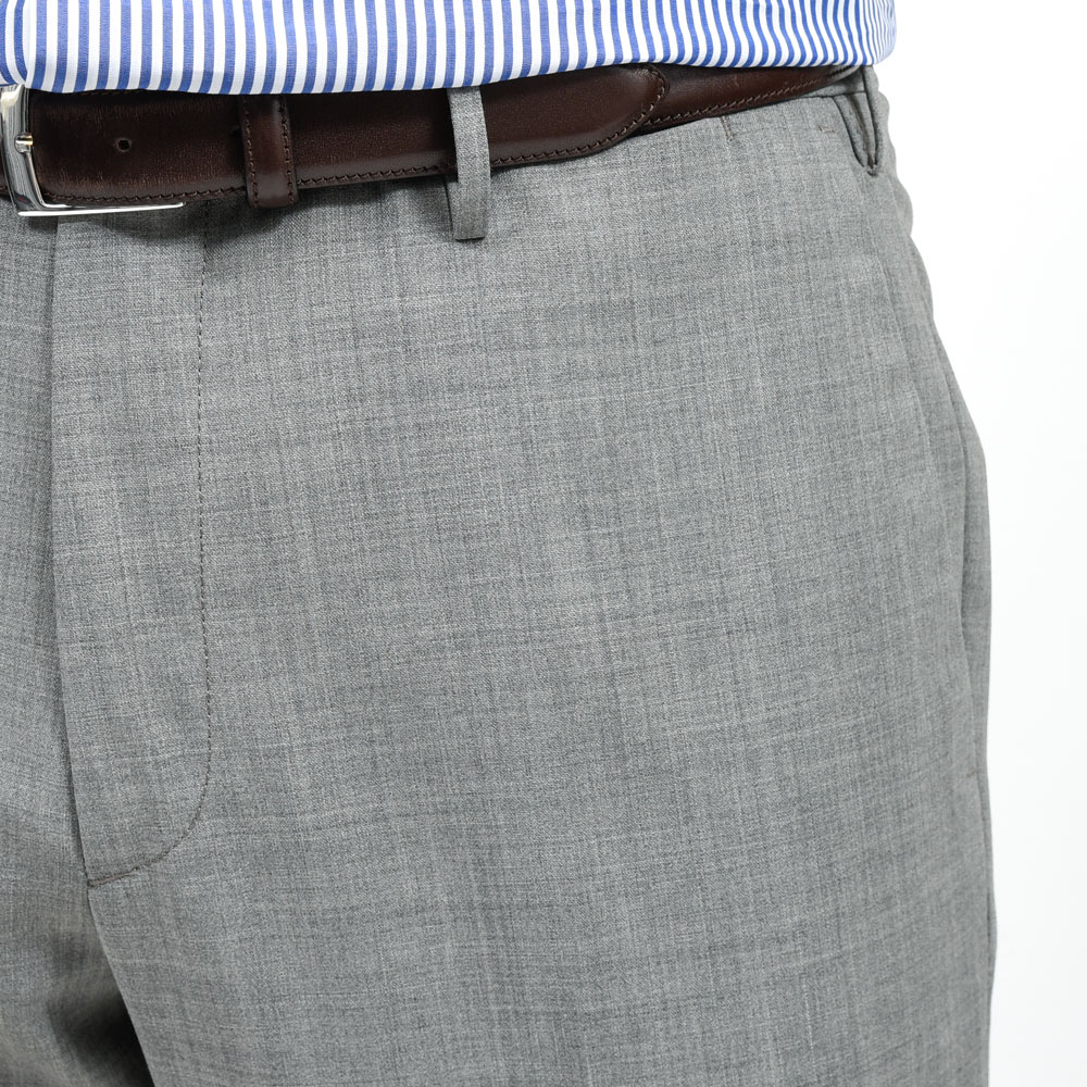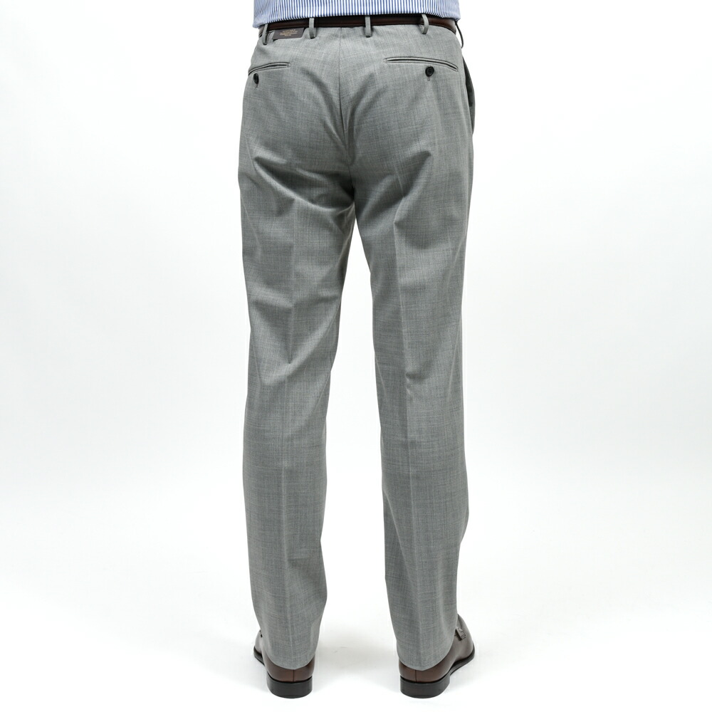 ノープリーツ仕様によりウエスト周りがすっきりと収まり、ビジネスシーンでも端正に映るシルエットを形成します。