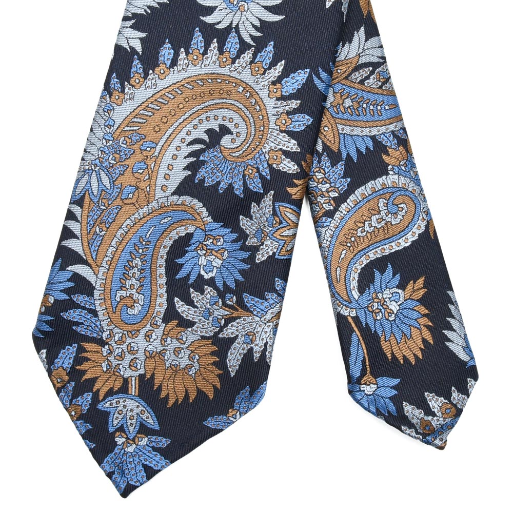 落ち着いたベースカラーに明るいトーンのボタニカル柄を重ねることで、確かな個性を備えつつもクラシックな装いに品良く馴染む一本です。