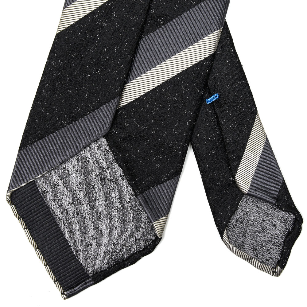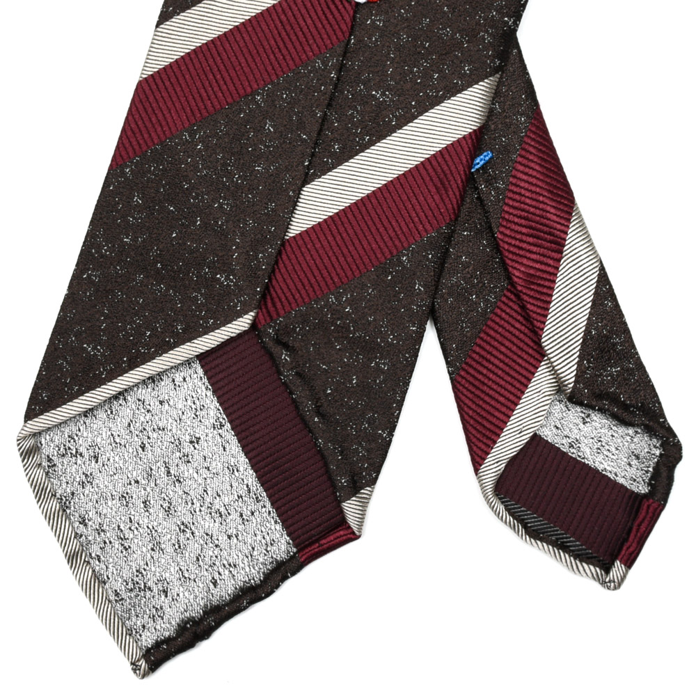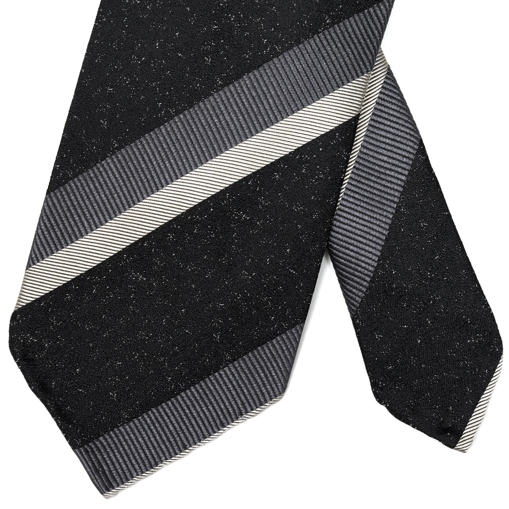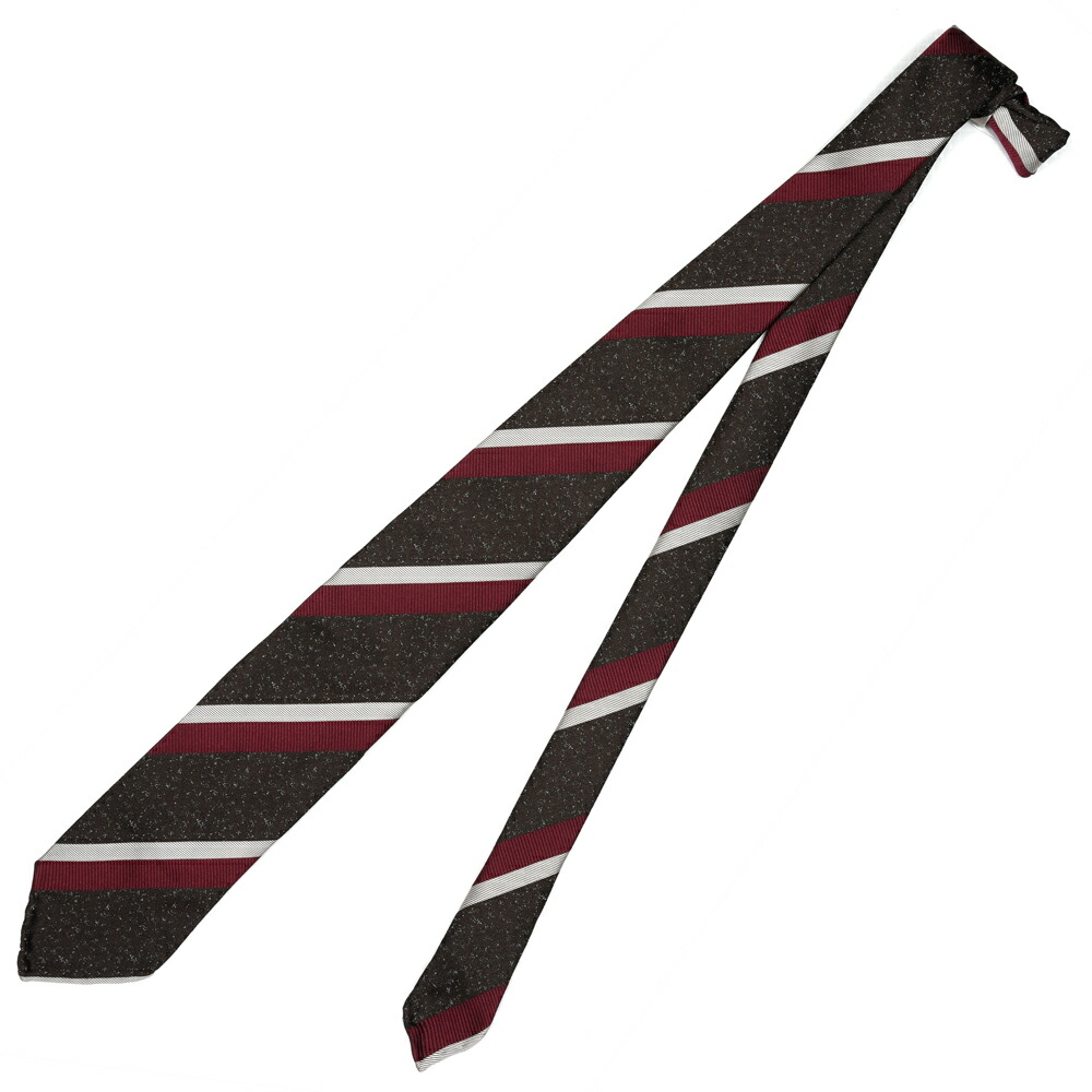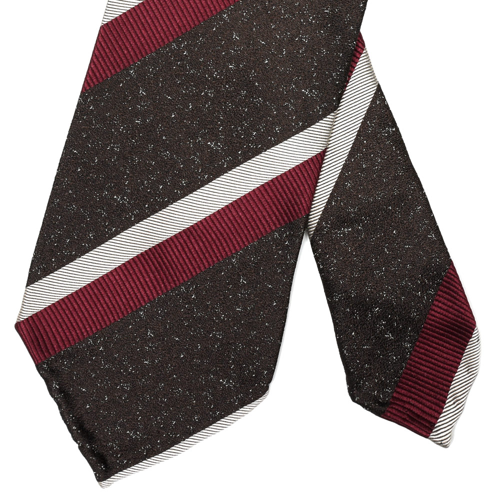 一見ベーシックなストライプですが、メランジベースの奥行きが加わることで、Vゾーンにさりげない立体感が生まれる一本です。