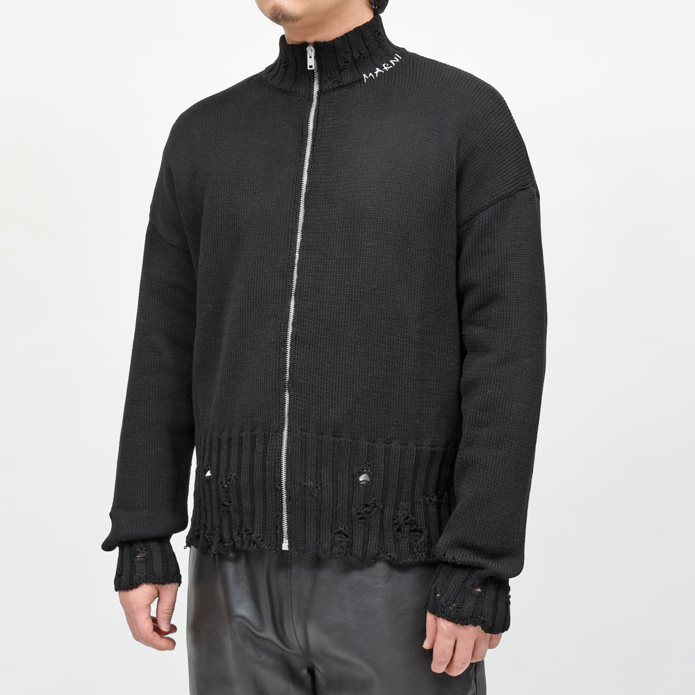MARNI(マルニ)らしい表現と言いますか、ここ数シーズン定番的に展開されているダメージ表現を施したニット、今回はカーディガン兼ブルゾン的なデザインのものをセレクトしています。