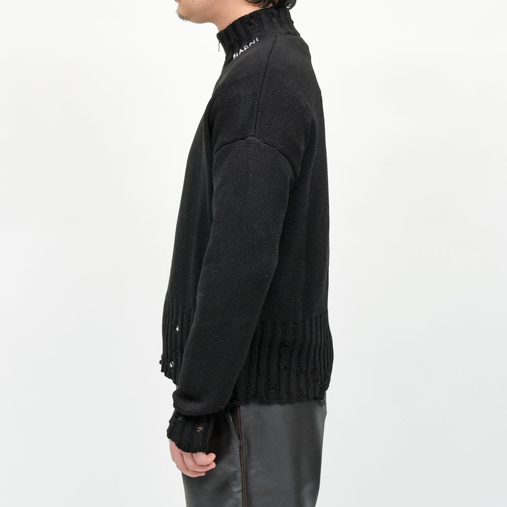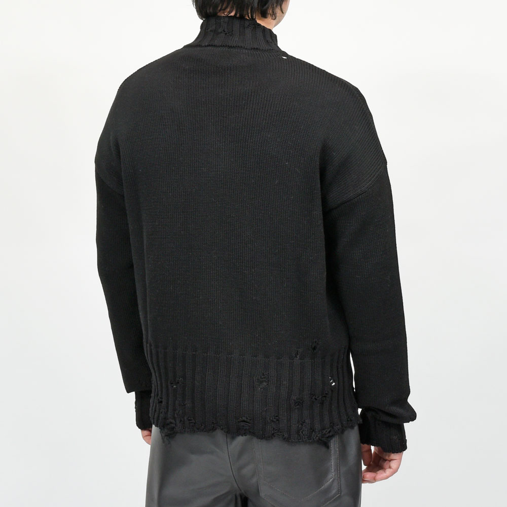 ダメージニットのシリーズ、カーディガンやクルーネックもありますが、こちらはよりニットアウター的に使用することが可能な一着になっています。
