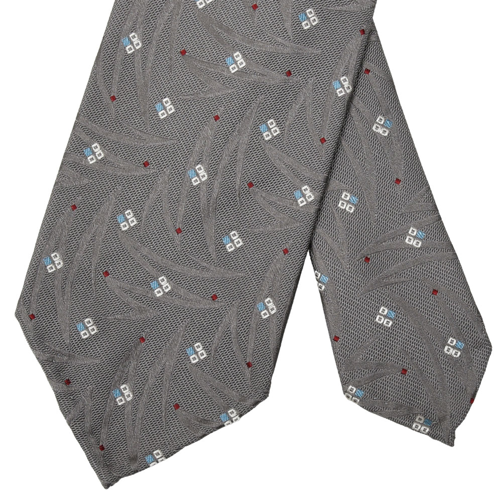 その上に水色と白のスクエアで構成された小紋調の柄と、さらに小さな赤のスクエアを配することで、繊細なリズムと奥行きを感じさせる洗練された一本に仕上げられています。