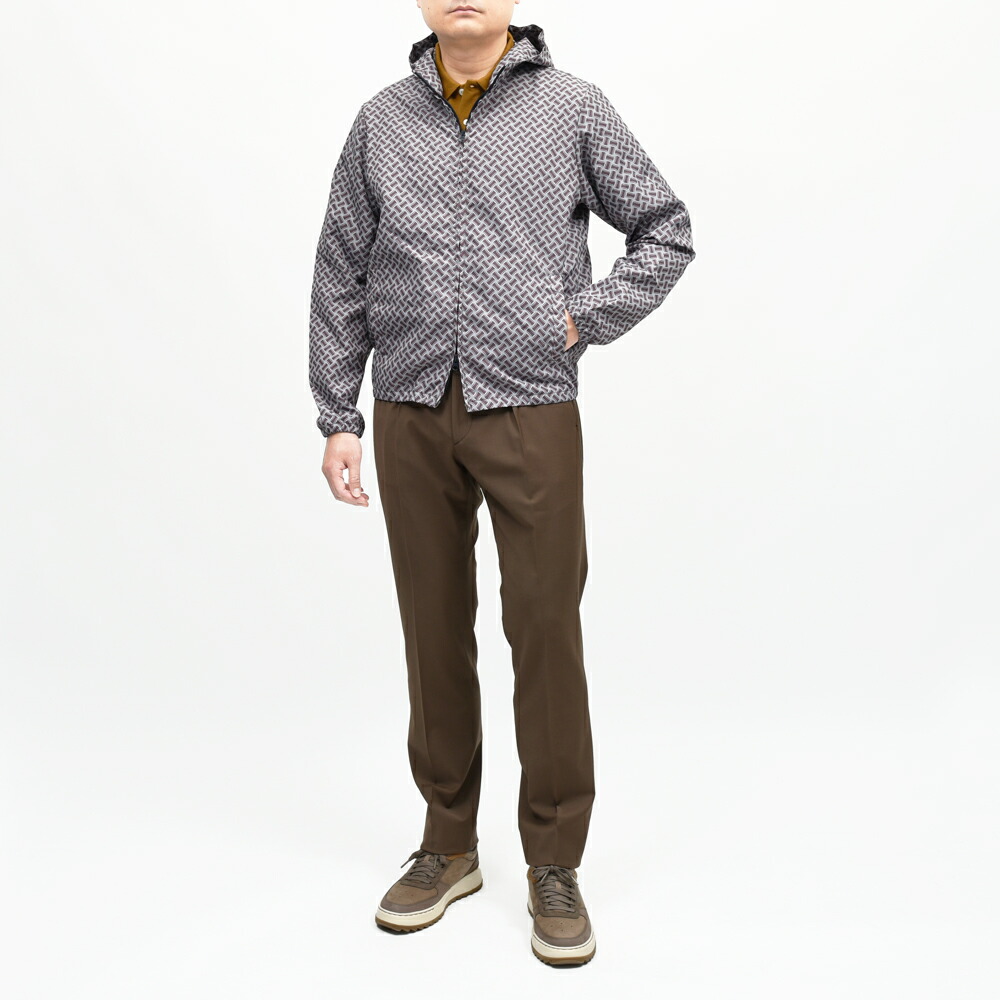 フード付きでカジュアルながらも上質な仕立てとシルエットで品のある大人のコーディネートに仕上がります。