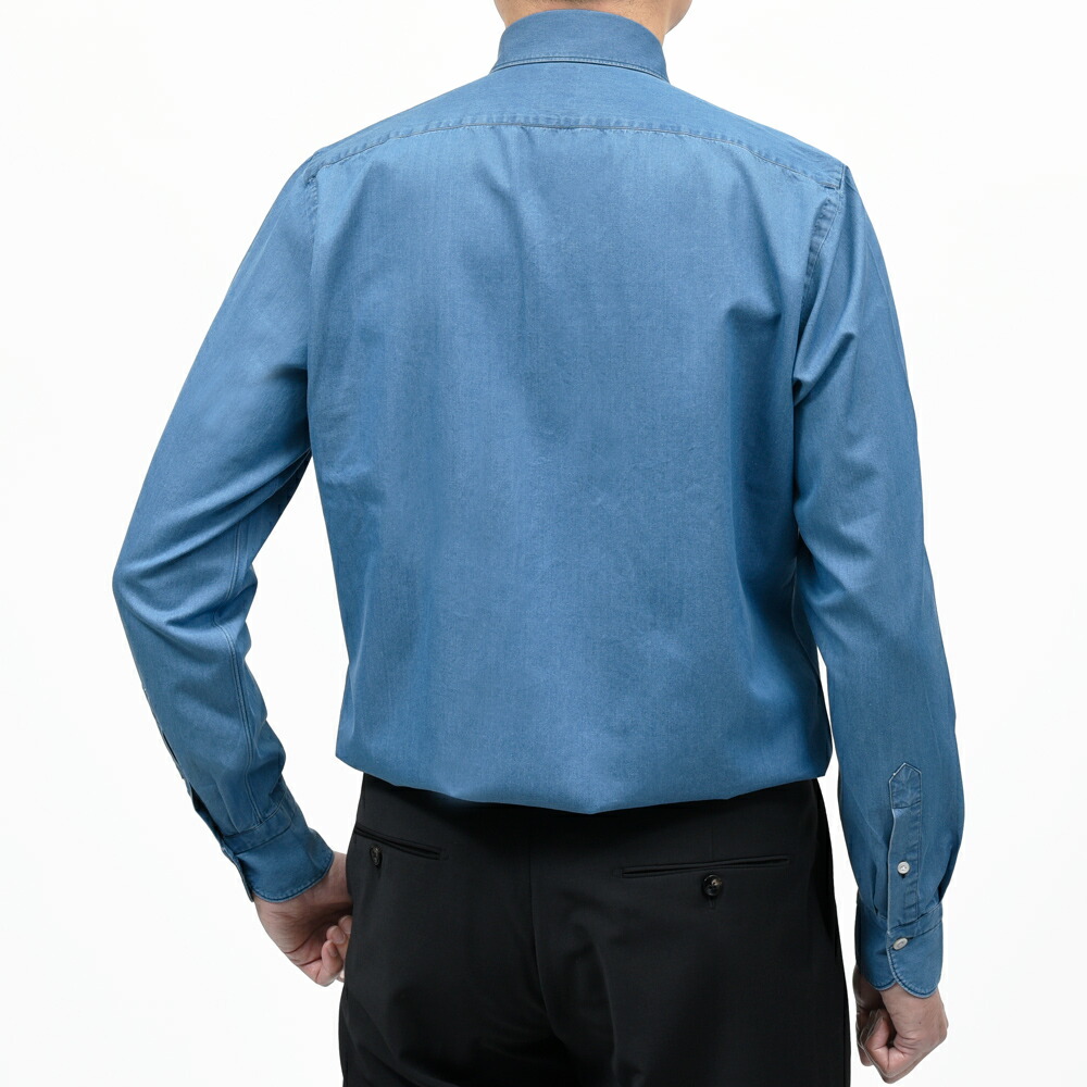 デニム系のシャツ、基本はカジュアル使いになりますが、ジャケットやスーツなどテーラードアイテムと合わせるというのもイタリアンスタイルのベーシックなテクニックでして、よく用いられるのがこのタイプ。