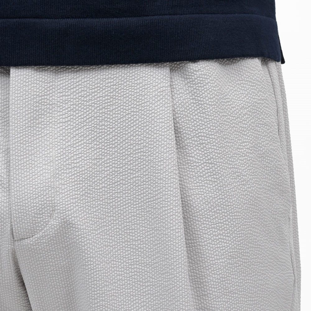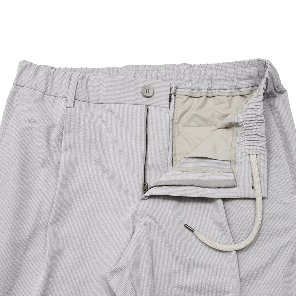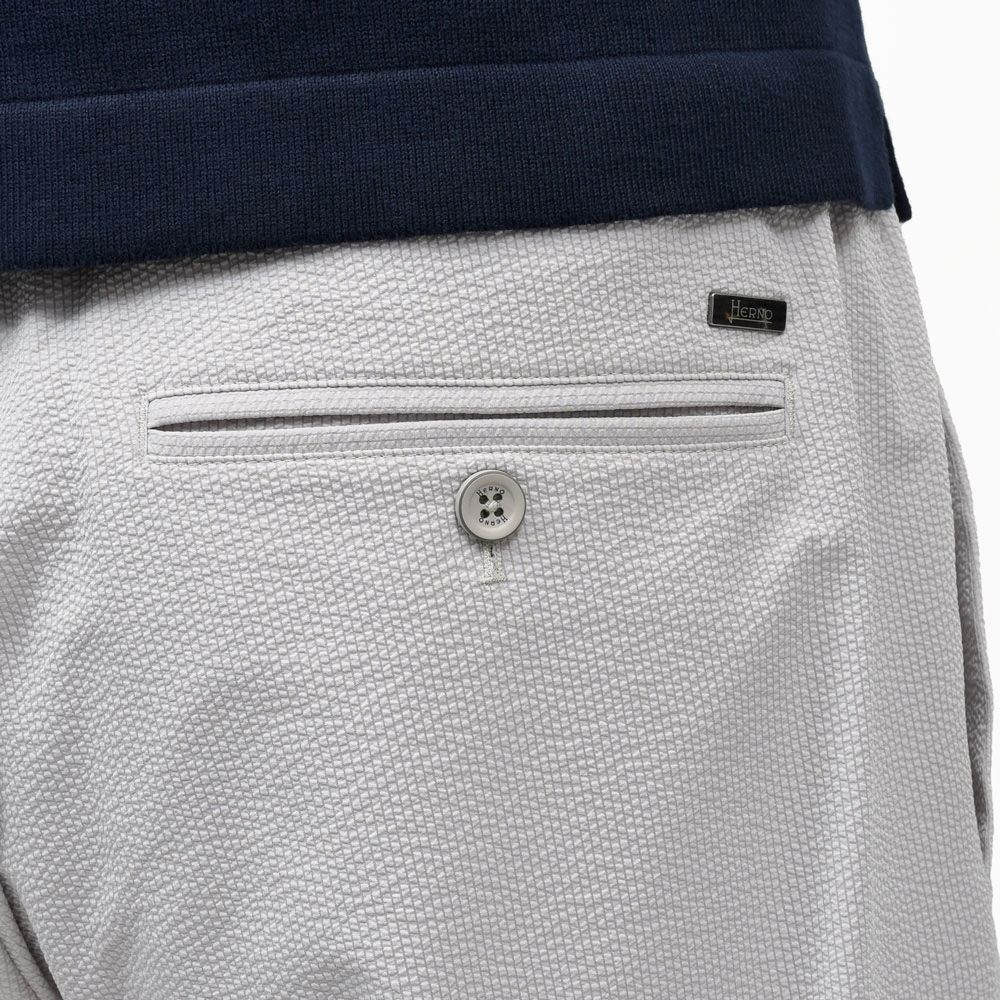 HERNO(ヘルノ)で毎シーズン人気を誇るテックファブリックのシャーリングパンツ、今シーズンはスムースなジャージ系生地ではなく、クラシカルな面持ちのテックシアサッカーでご用意です。