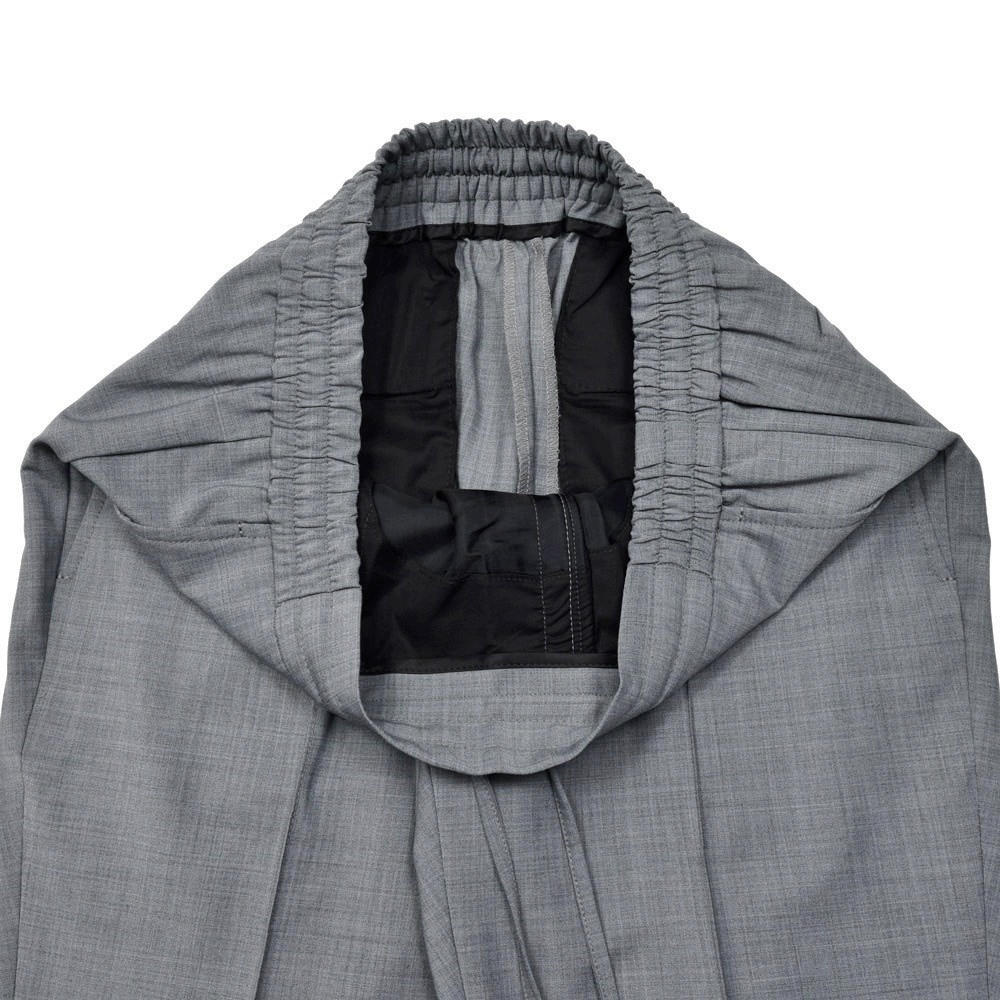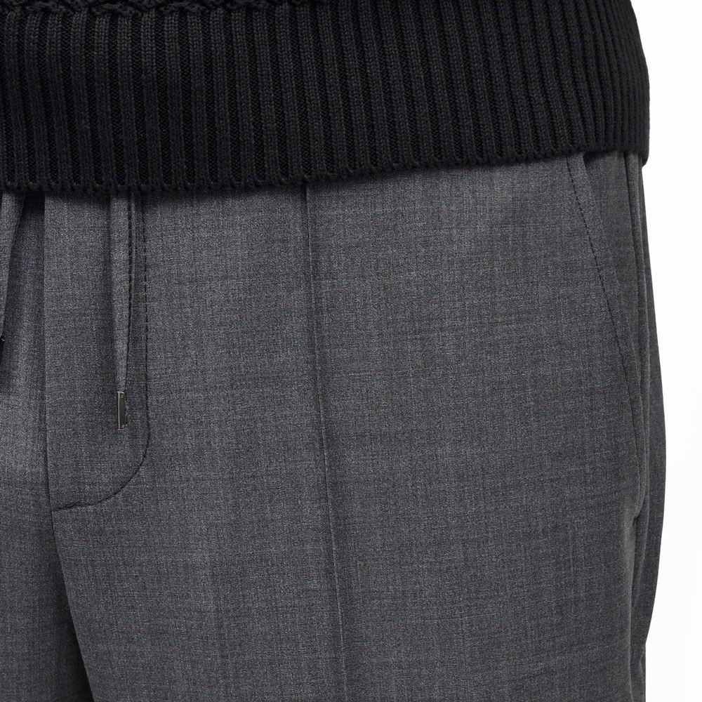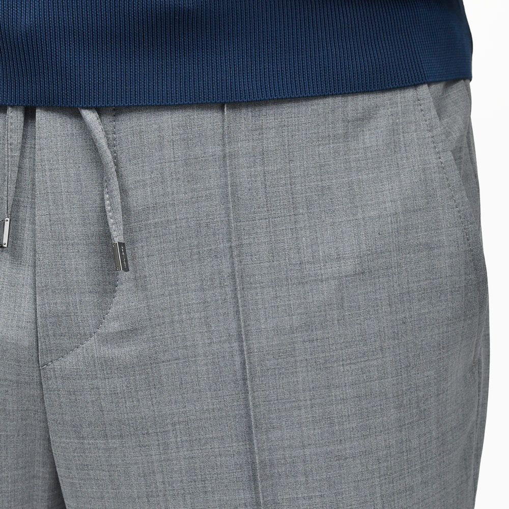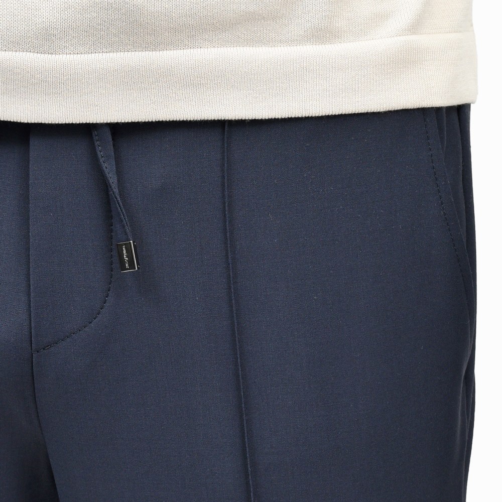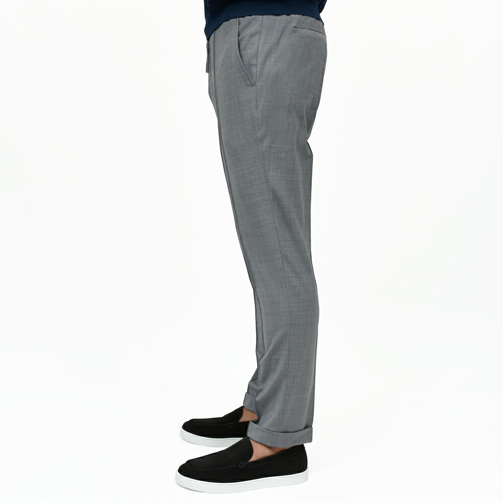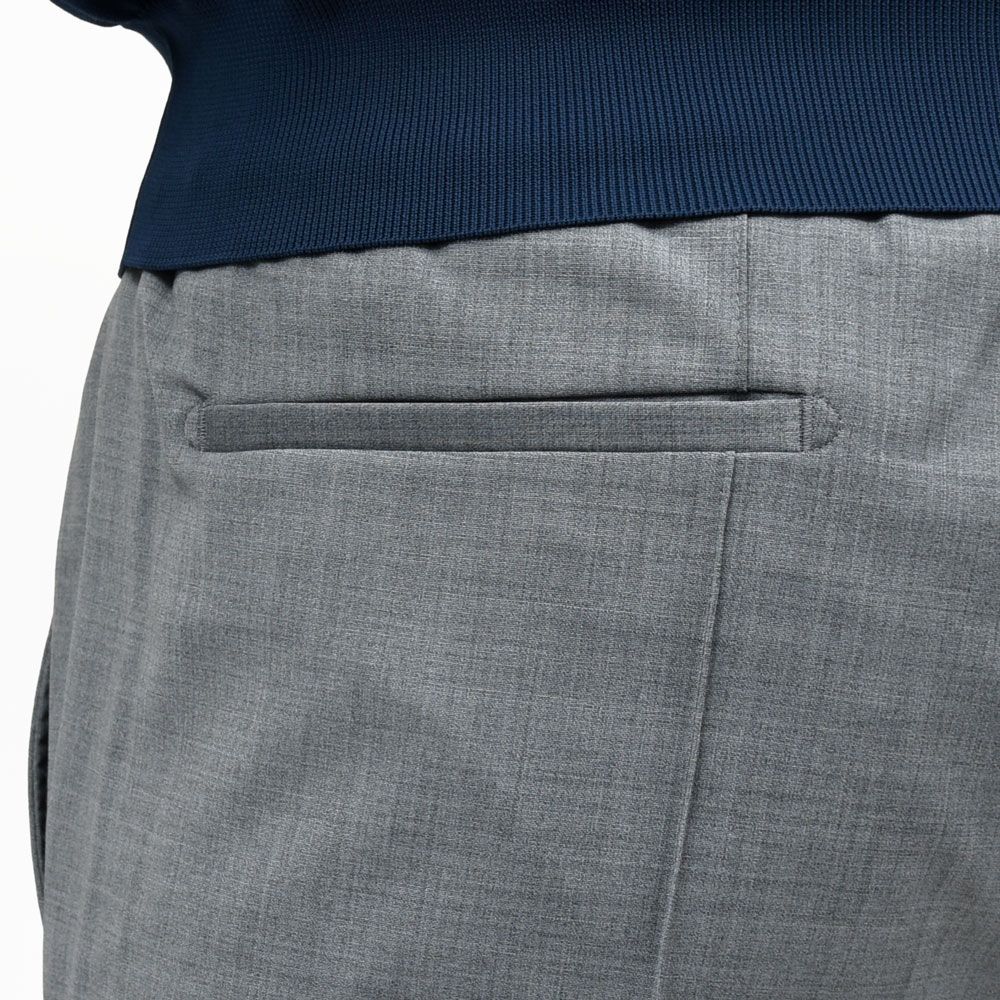 ドレススタイルに通じる見え方になるテックウールを用い仕立てたパンツなので、まず見た目に品格があります。そこにステッチクリースでピリッとしたスポーティさを加え、ウエストシャーリングでコンフォート性能も加味。
