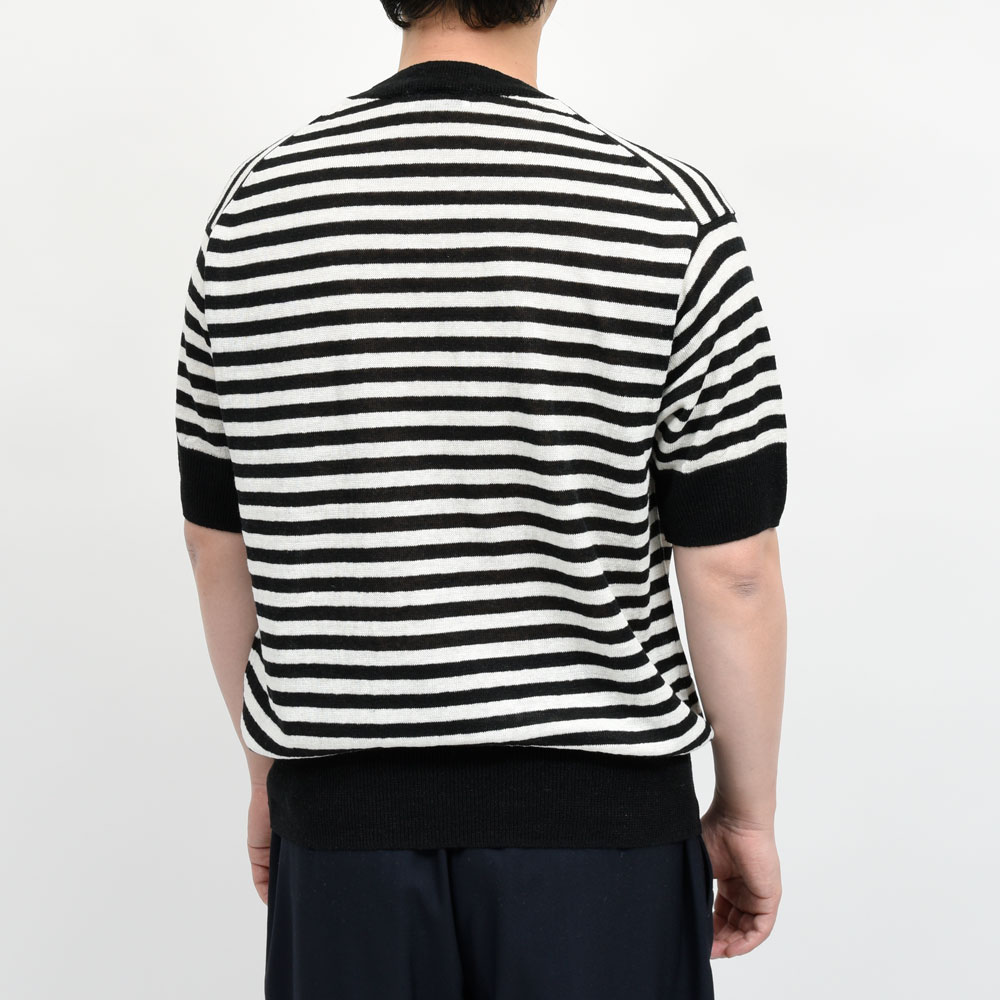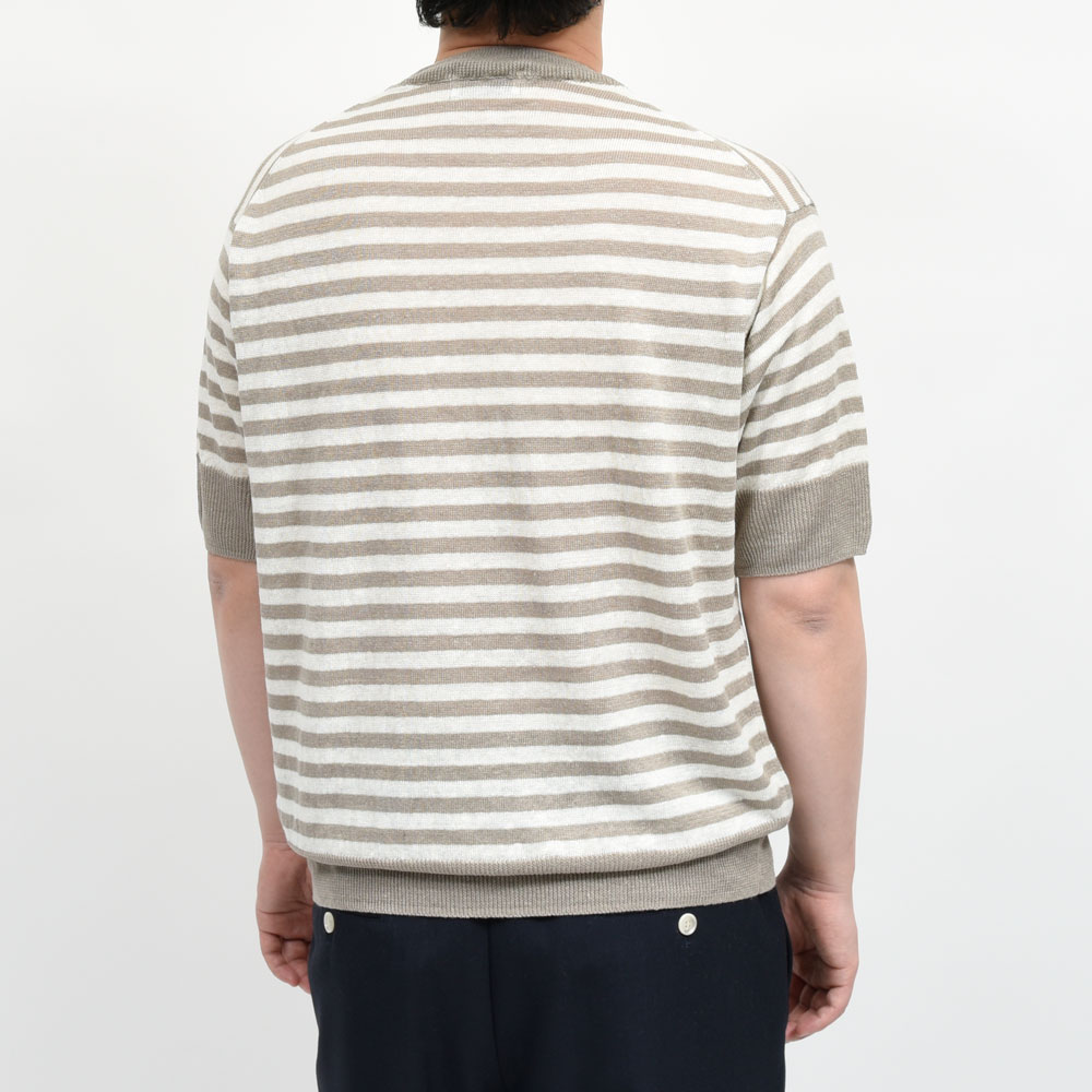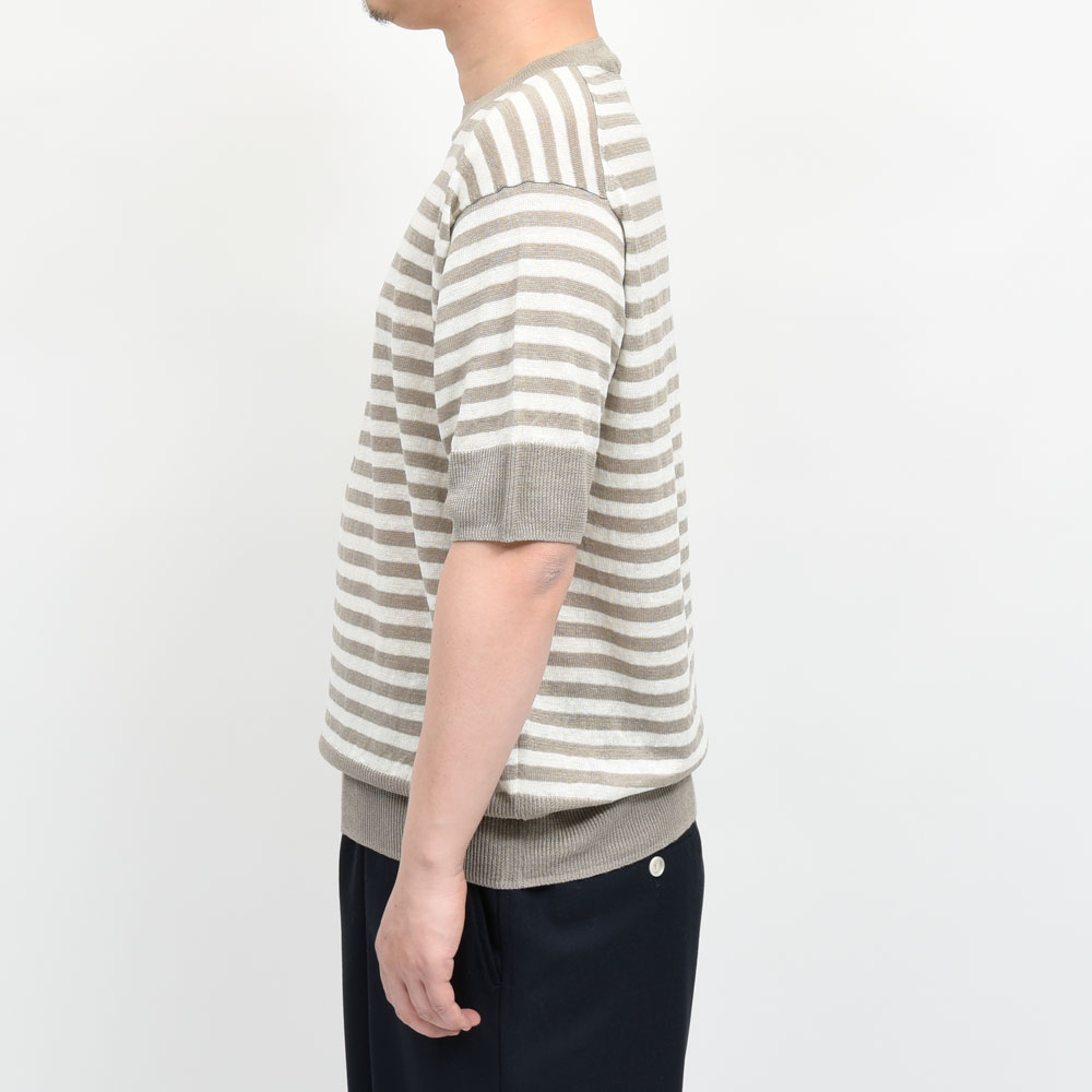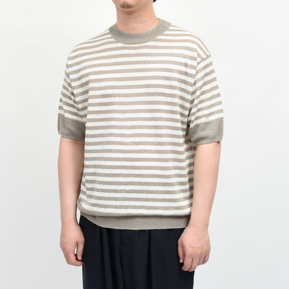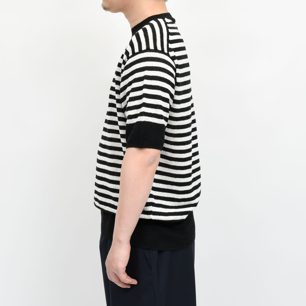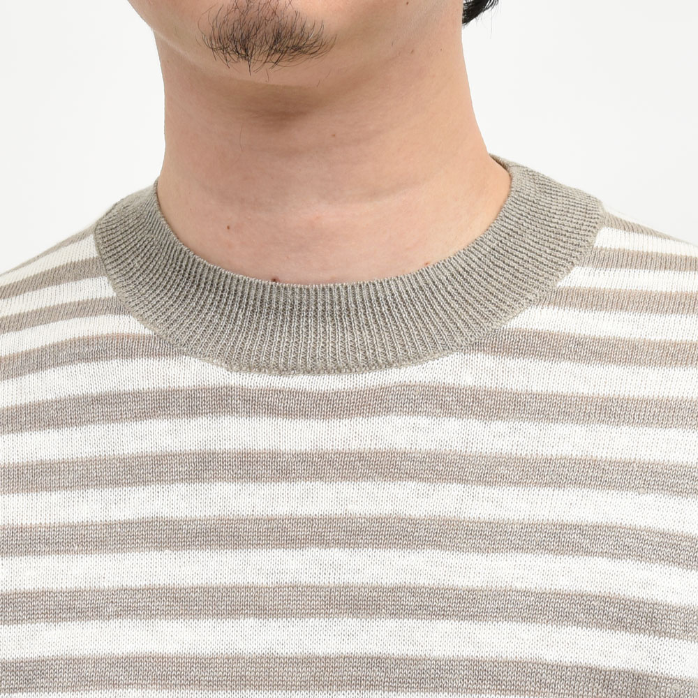 リブの存在感が際立っている一着で、マリン過ぎずカジュアル過ぎず、絶妙な塩梅に仕上がっていると思います。アーバンなボーダーニットとして大人の方が上品に着て頂けるタイプかと。