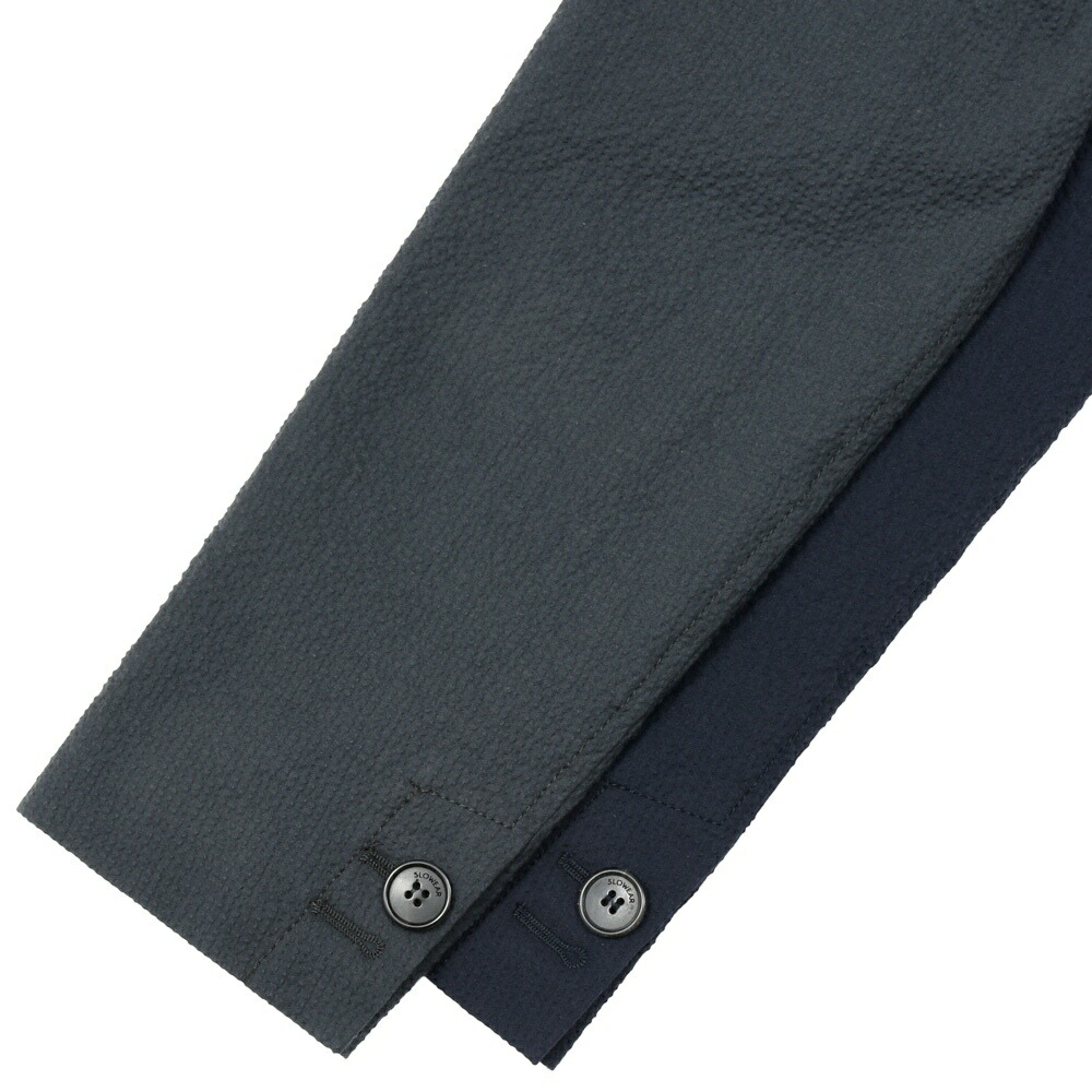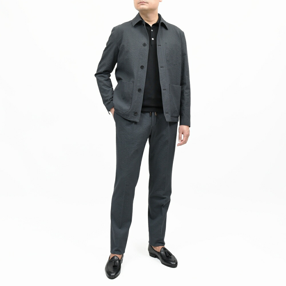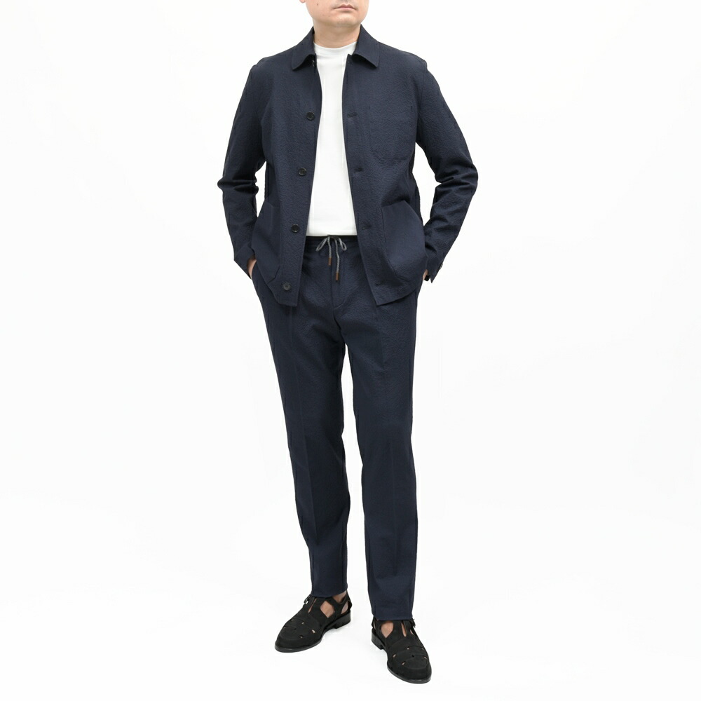 通常カバーオールやチョアジャケット的なアイテムはワーク由来の生地を乗せることが多いですが、パンツと共生地でセットアップで着られるよう、イタリアらしい上品な生地を用いているところがINCOTEXのセンスですね。