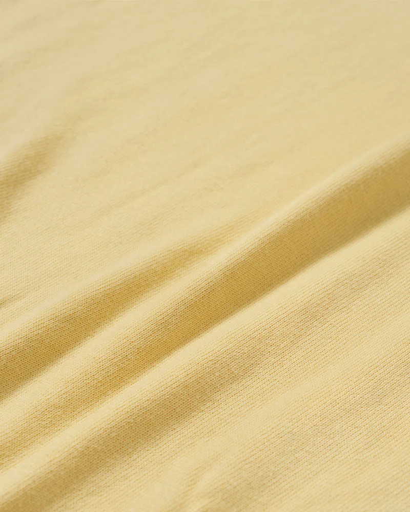 強撚糸を用いたハイゲージのクレープ生地に編み立てることで、マココットンらしいソフトな風合いと、ベタつきのないさらりとした肌触りを両立させています。