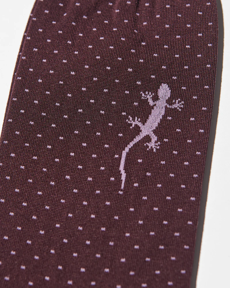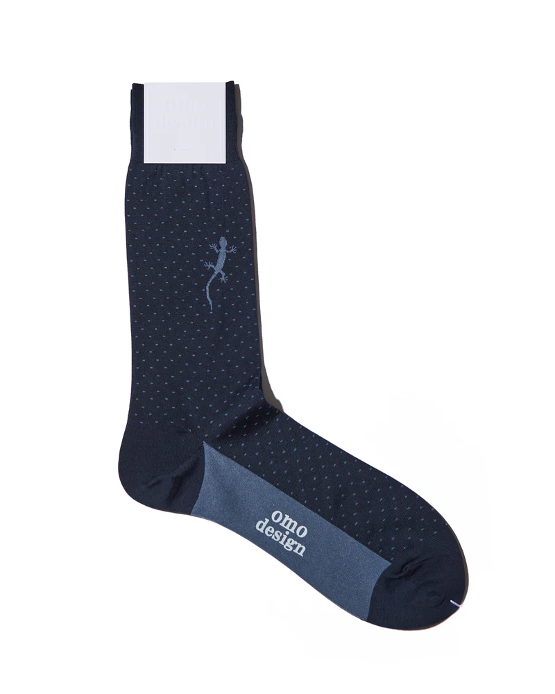 プレーンなピンドットソックスの片足にトカゲ(幸運のモチーフ)が歩いているユニークなデザイン。