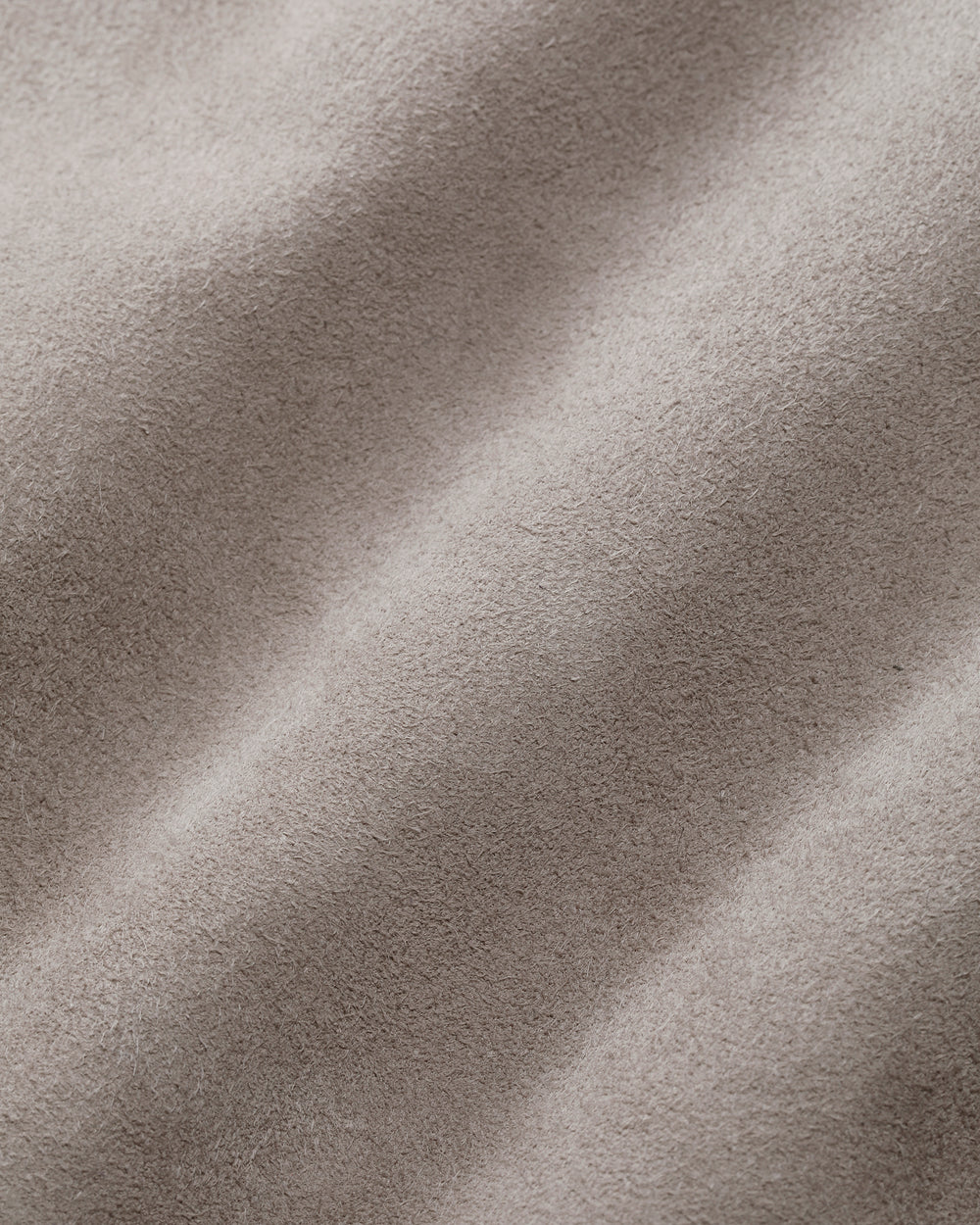 イタリアで鞣された0.5~0.6mm厚ゴートスキンスエード。美しいドレープが楽しめるラムレザーのような柔らかな手触りとゴートならではのコシのある素材感となっているのがポイントです。毎シーズントレンドカラーを含め、豊富なカラーバリエーションを用意しており、多くのメゾンブランドでも使用されるクオリティの高いレザーとなっています。