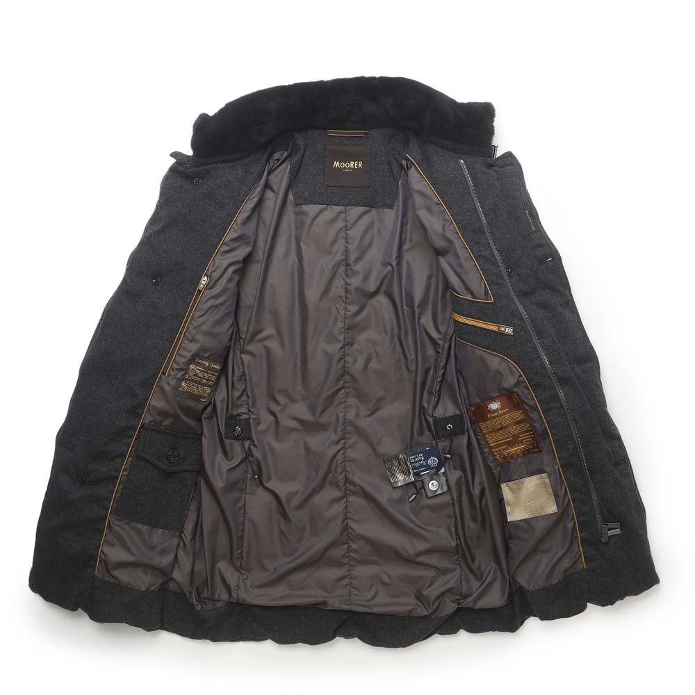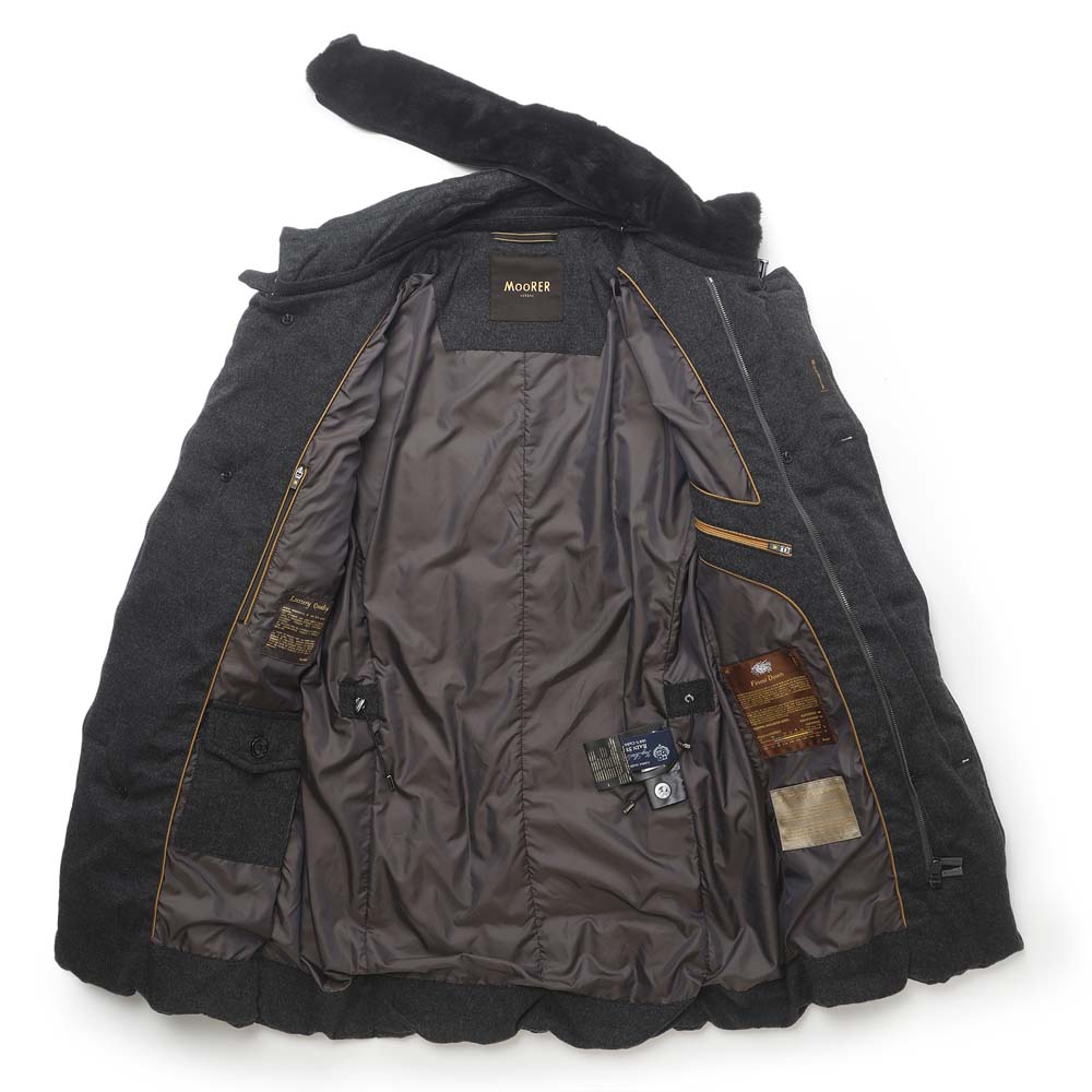 首元には、非常に滑らかな肌触りの取り外し可能なヌートリアファー、襟周りには防寒性を高めるベルトが配されており、高い保温性とともに、ラグジュアリーな雰囲気を演出します。