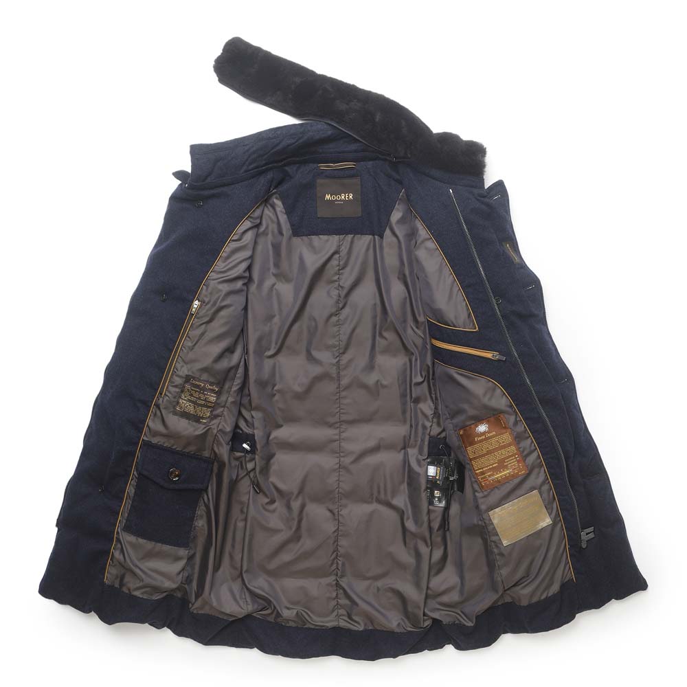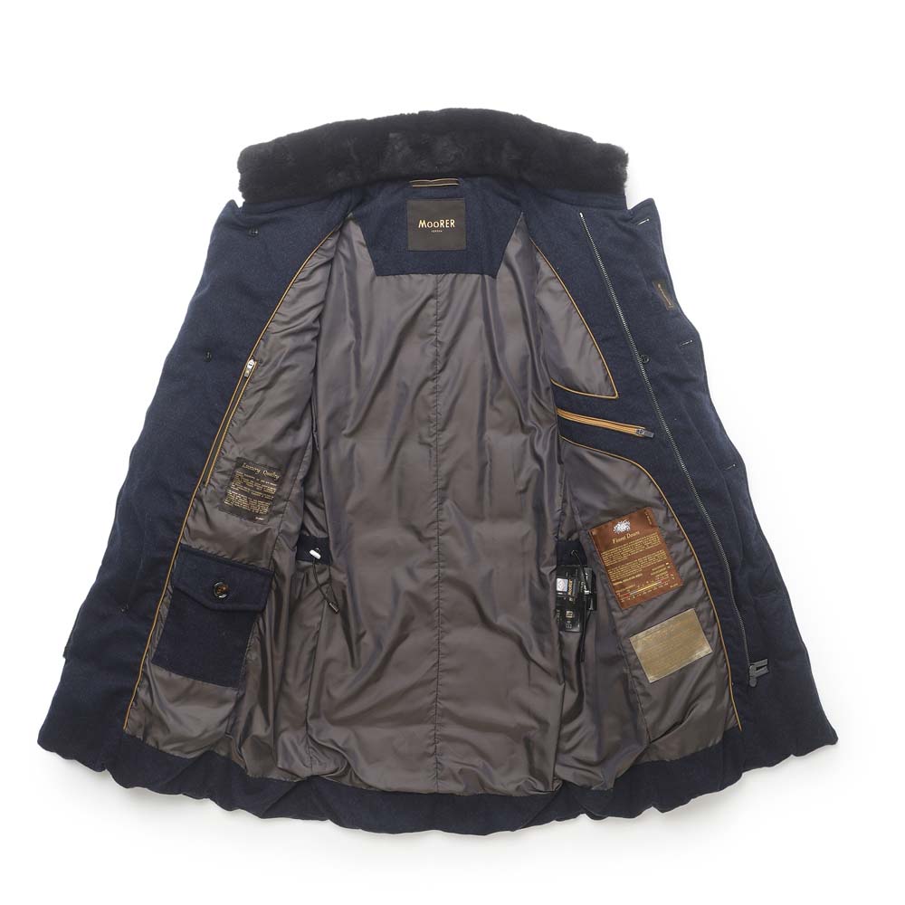 首元には、非常に滑らかな肌触りの取り外し可能なヌートリアファー、襟周りには防寒性を高めるベルトが配されており、高い保温性とともに、ラグジュアリーな雰囲気を演出します。