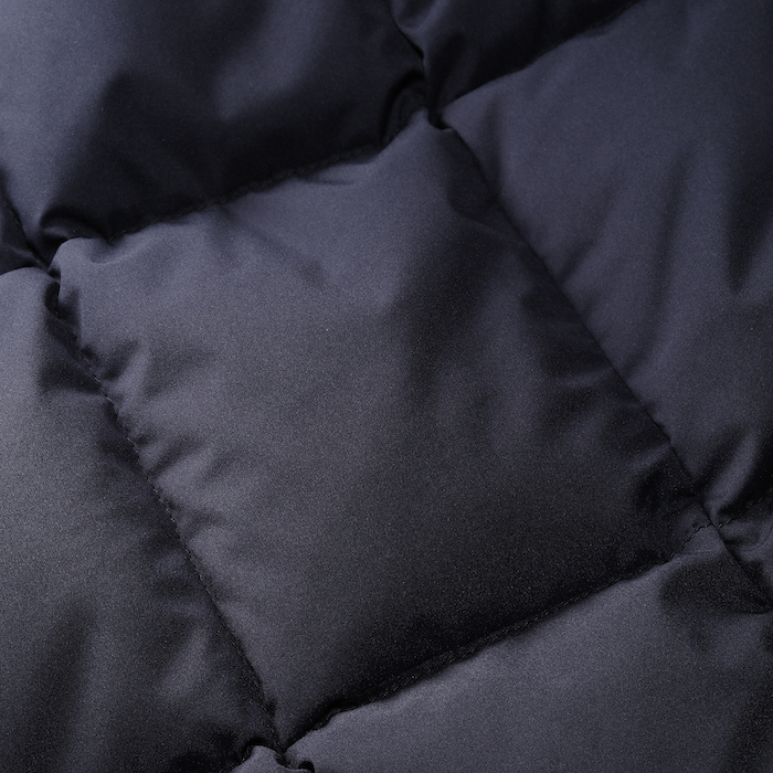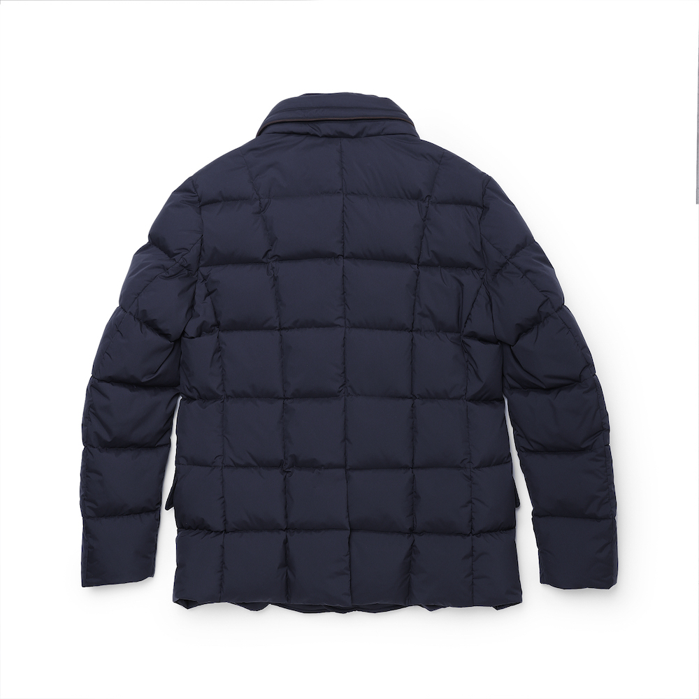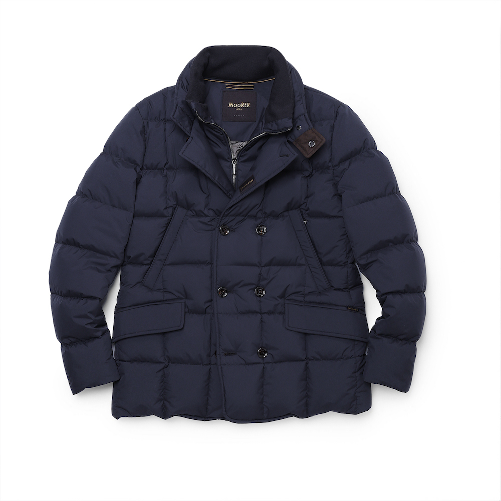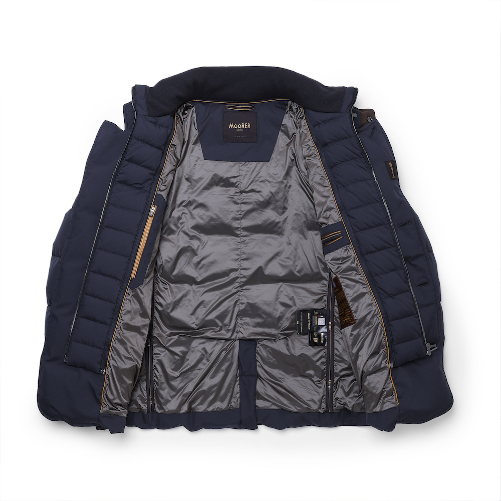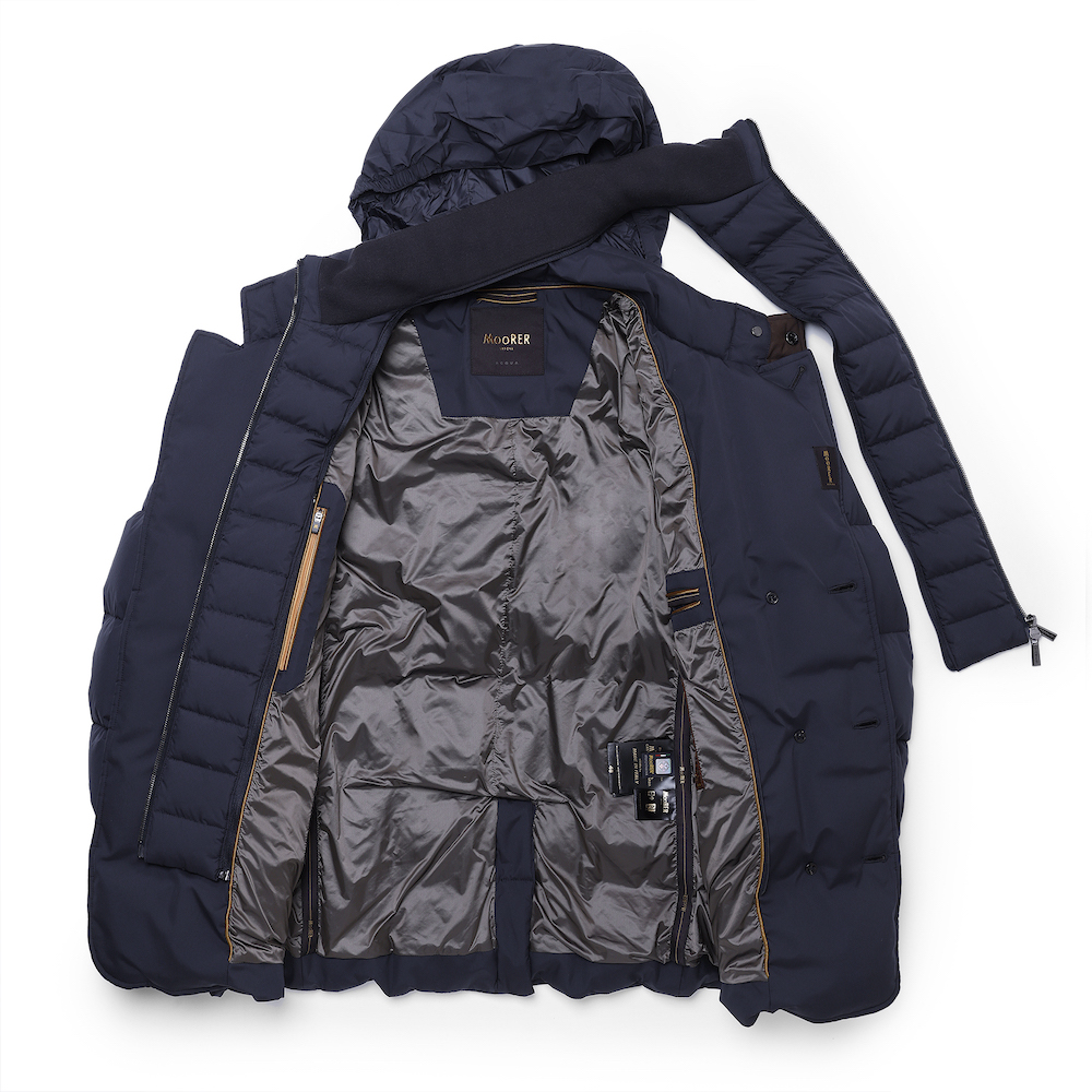 セミダブルブレストが MooRER らしく、フロントを開けて着用したときも美しくスリムなシルエットが 特徴です。 重ね着をしたようなスタンドカラーのリブ襟~前立ては取り外しをすることができるので、気温や着こな しに合わせて調節ができます。 また襟元にはフードが内蔵されています。襟元に施されたスエードのトリミングがラグジュアリーな雰囲 気を醸し出しています。