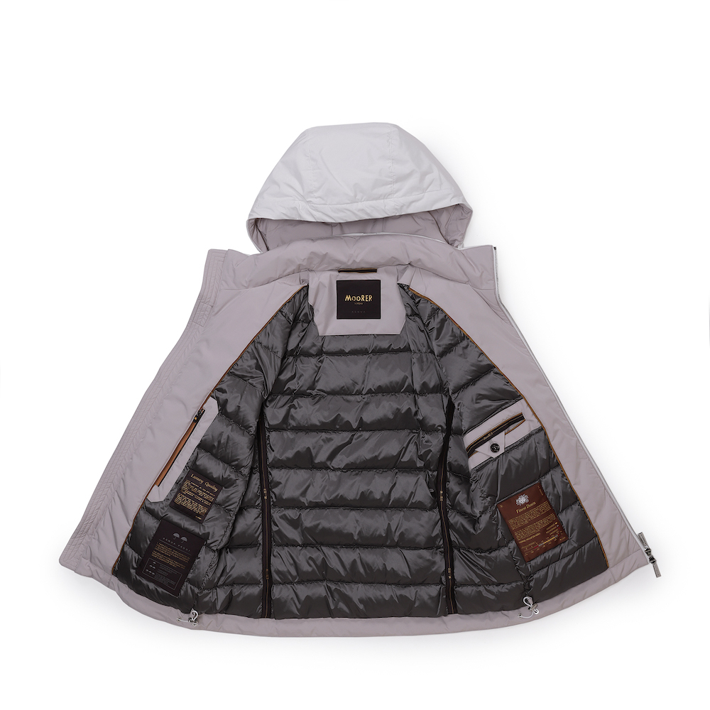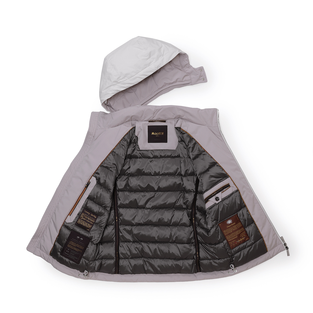 裏側にブーダンキルティングを施して表側にダウンステッチのない軽量ダウンブルゾンモデルALBINI より汎用性の高いシンプルなフーデッドブルゾン型をベースに、取り外し式のフードや内側には大き目な縦ポケットとパイピングし たてのサイドポケットを装備しており、快適さと贅沢なディテールを兼ね添えています。 表地には特殊なフィルムを裏側に施したテクニカルファブリックを使っており防水,防風,透湿効果があります。 アクセサリーは全てブランド別注の素材を使用しています。