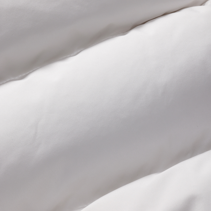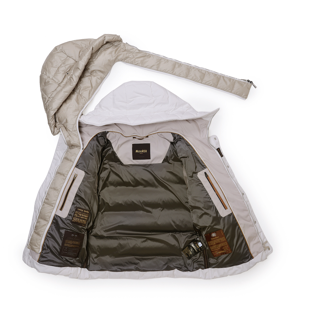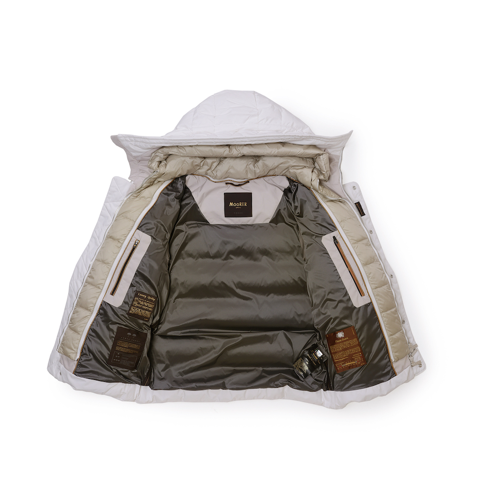 ワイドなブーダンキルティングにグースダウンを詰めたマットファブリックと、ディテールが軽いコントラストを生み出しています。ダブルフード仕様で、外側は固定、光沢のある同系色の素材で仕上げたライナーのフードは、ファスナーで取り外しできます。フロントのファスナーとコンシールボタンで開閉します。ウエストの高さに便利なサイドポケット。内側には、貴重品を入れるための内ポケット2つとロゴ入りリボンのディテールをあしらっています。