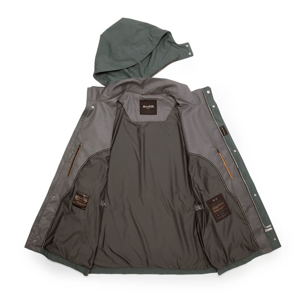 軽量なテクニカルファブリックに防水メンブレンを組み合わせることで、高いプロテクション性能と軽やかな着心地を両立しています。都会的な佇まいの中に、MooRERならではの精緻な機能美が息づきます。