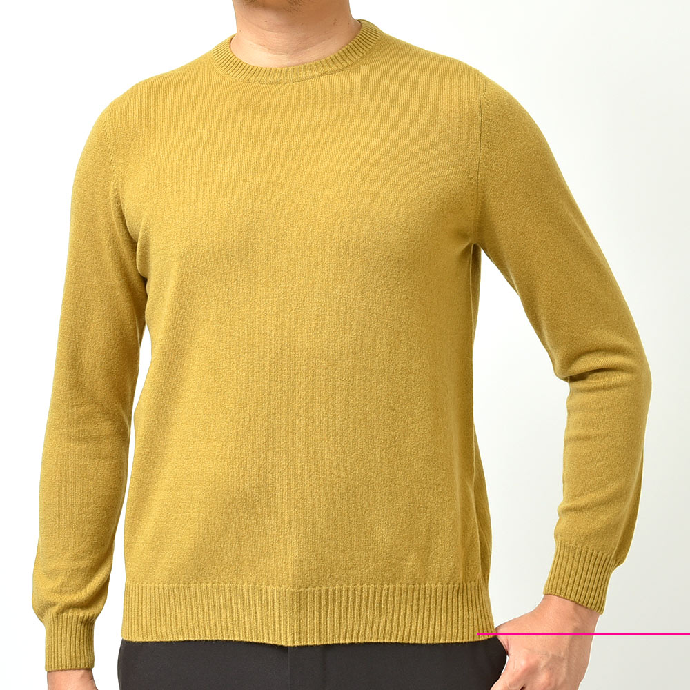 身頃はスッキリとしたシルエット。フィッティングは気持ちゆとりがある程度です。上質なカシミヤ100%のクルーネックニットです!