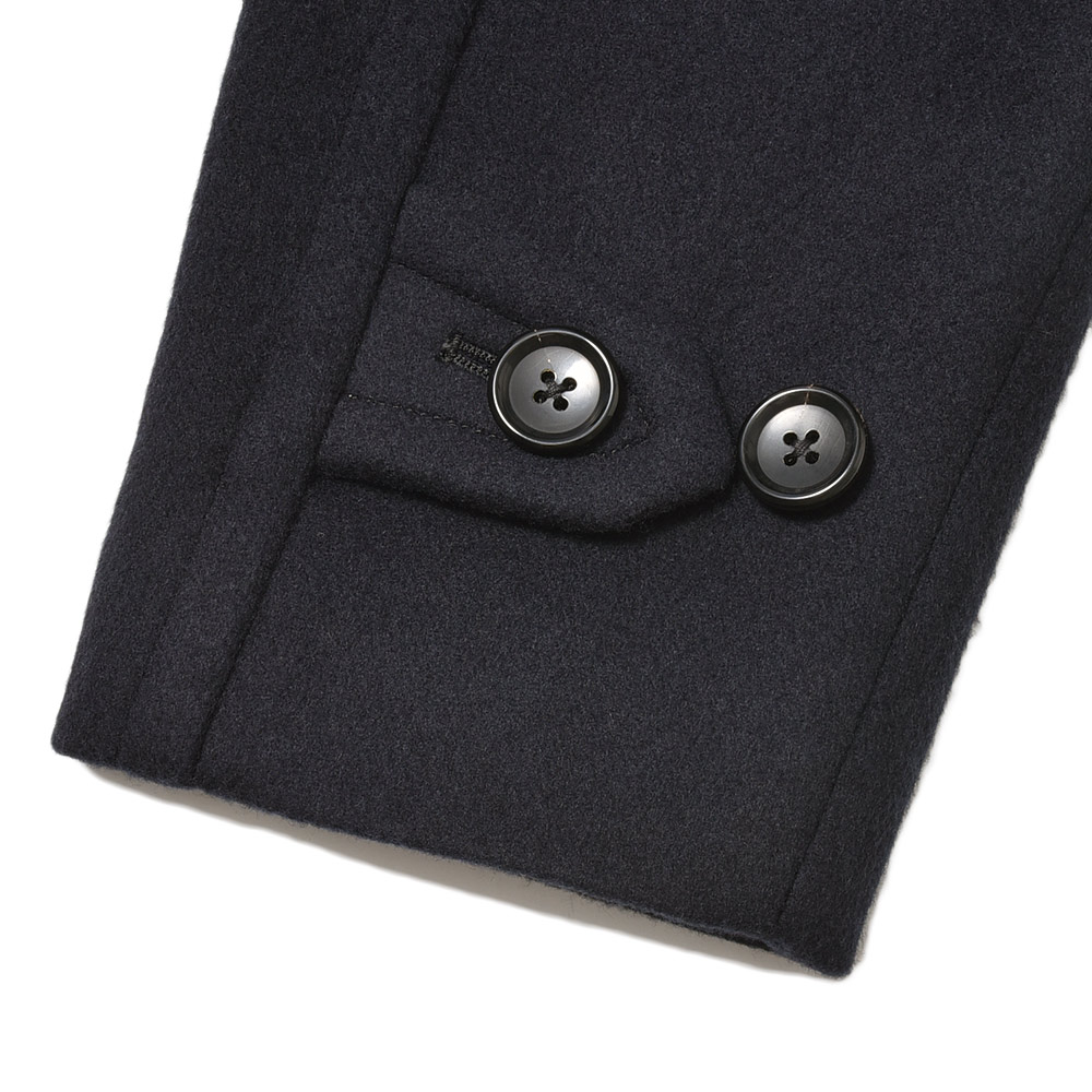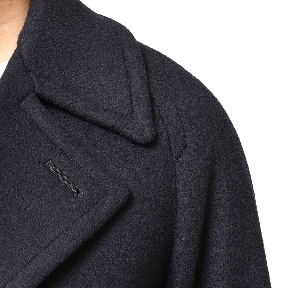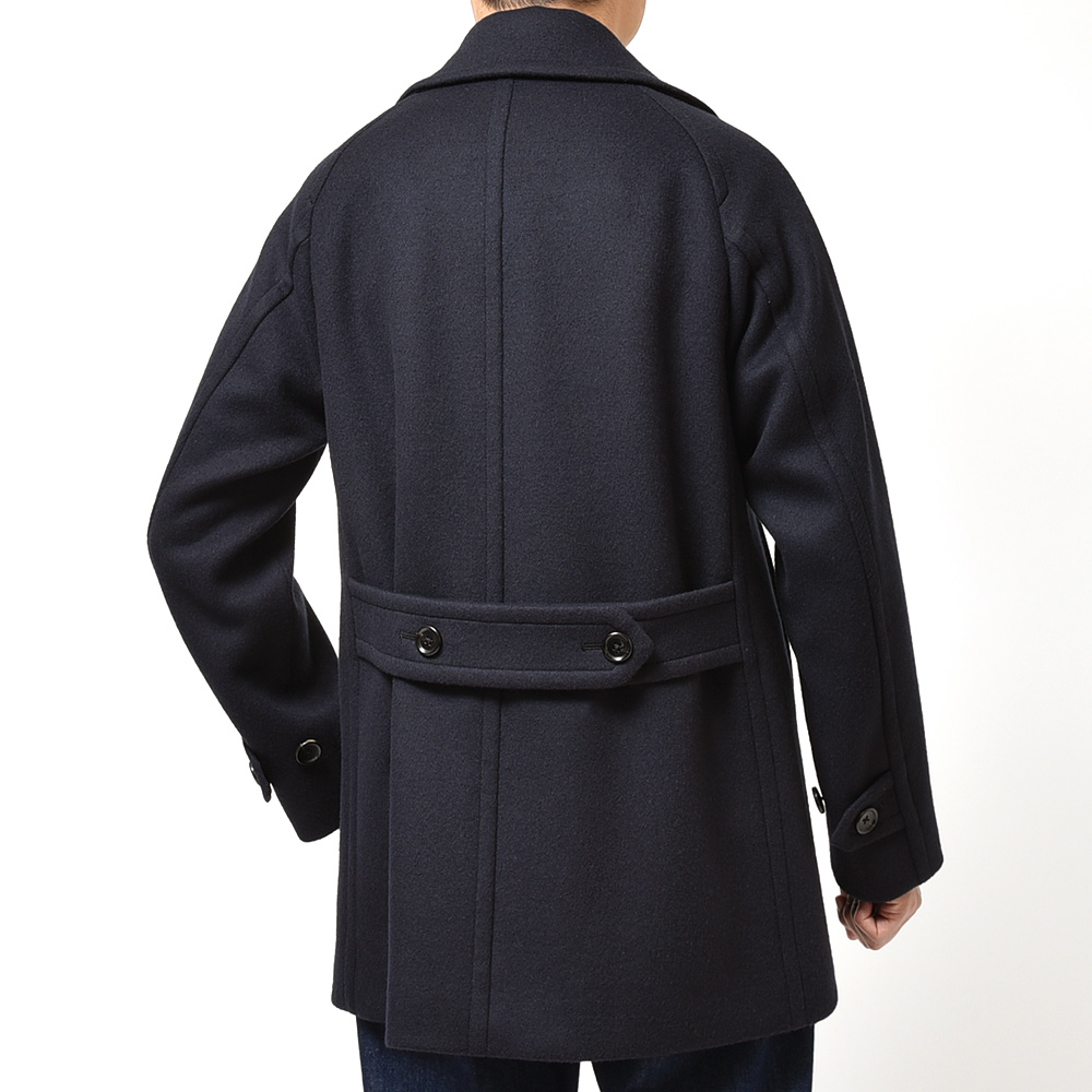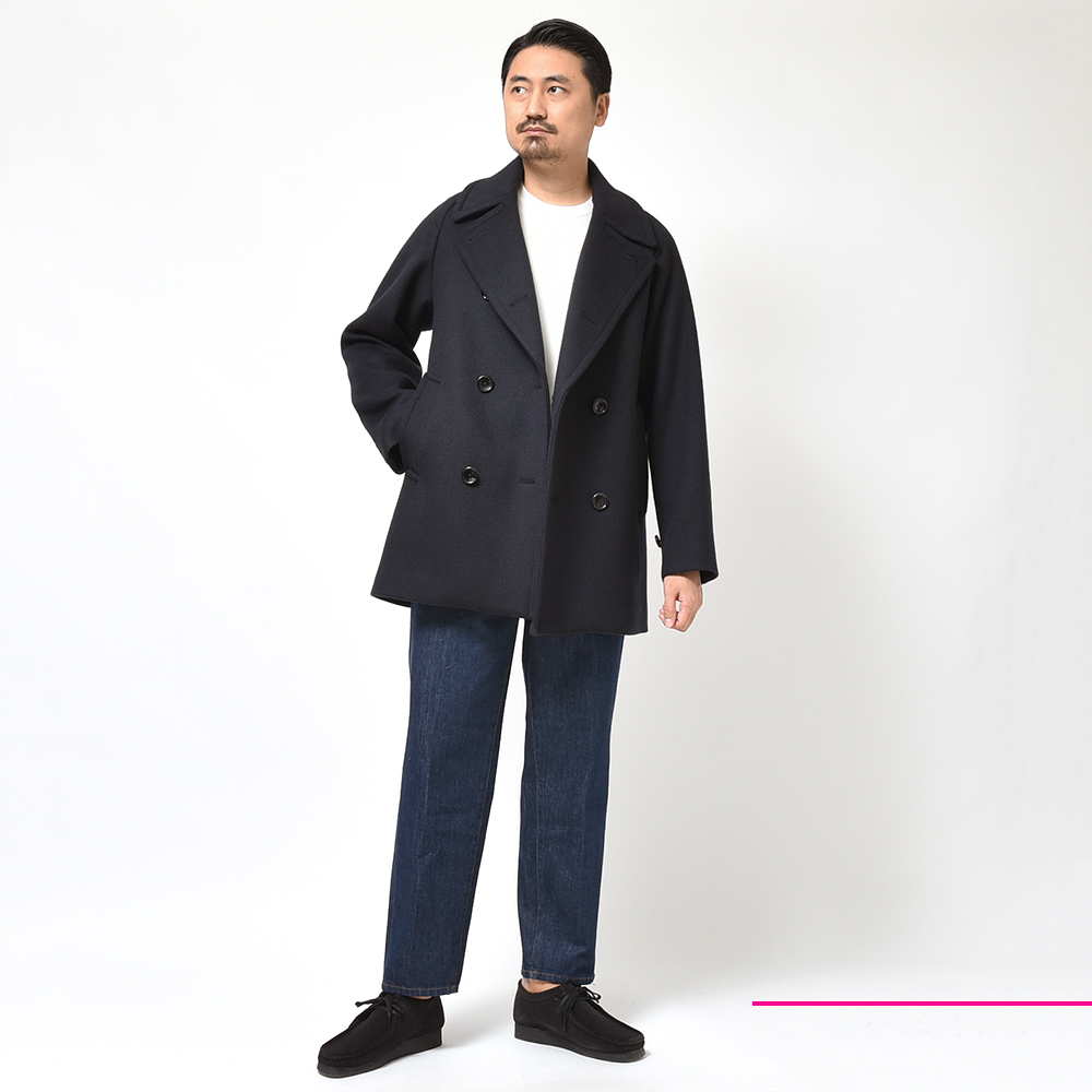 カラーとラペルの幅がほぼ同じ衿幅のアルスターカラーを採用したショートコートになります。ラグランスリーブのリラックスした雰囲気に、ドレープ感の出やすいふくらみのあるビーバー仕上げのウールメルトンを使用。ビーバー仕上げのエレガントな素材感と、ドレープ感によるノンシャランな佇まいが品のある男性像を作り上げてくれます。