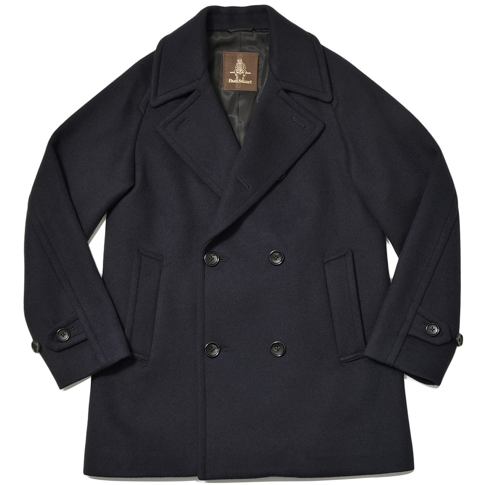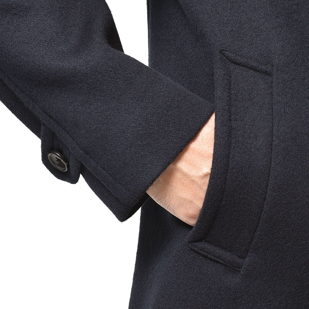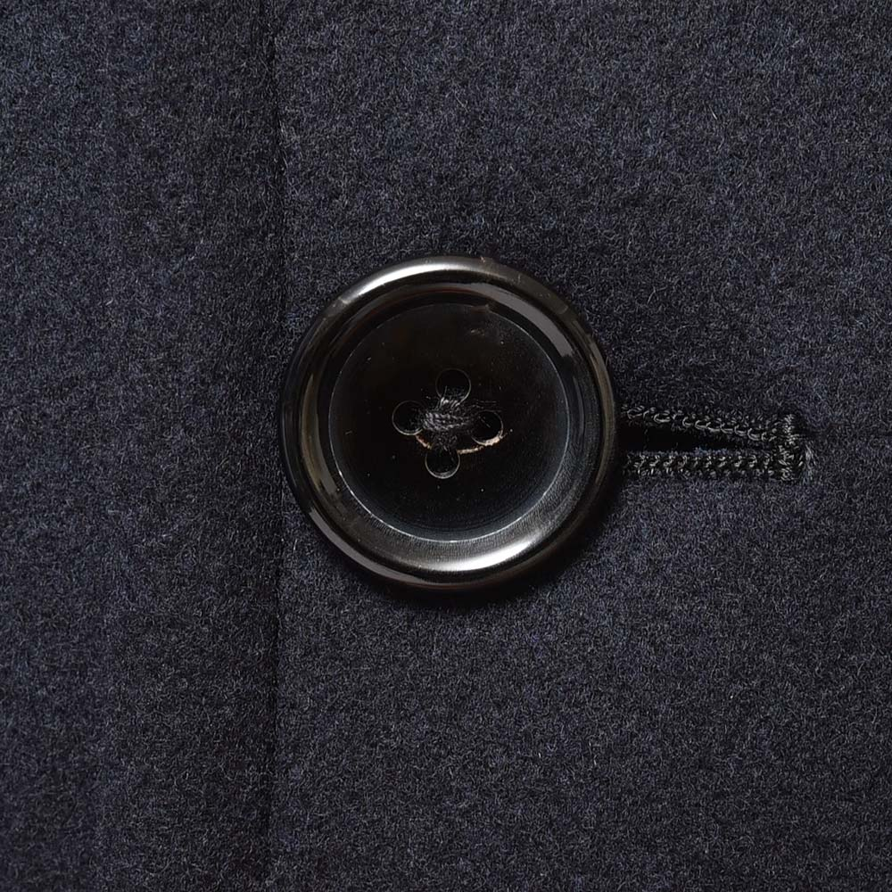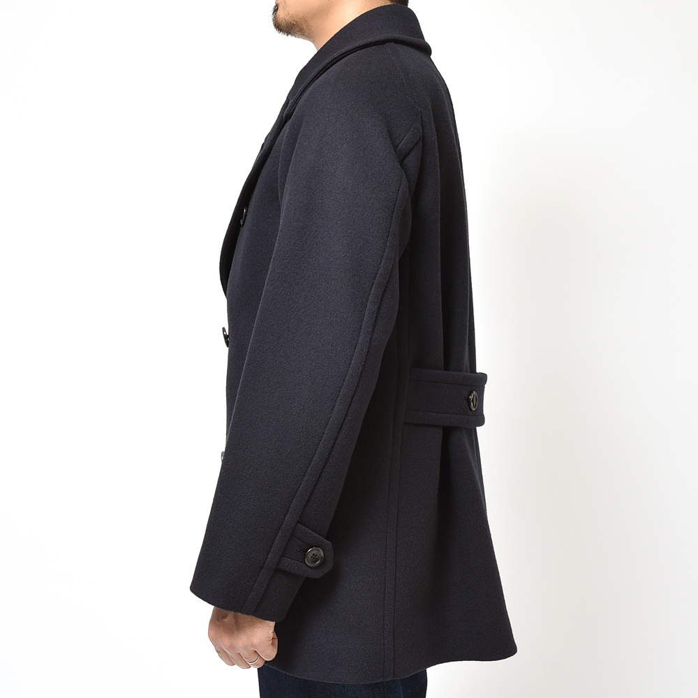 カラーとラペルの幅がほぼ同じ衿幅のアルスターカラーを採用したショートコートになります。ラグランスリーブのリラックスした雰囲気に、ドレープ感の出やすいふくらみのあるビーバー仕上げのウールメルトンを使用。ビーバー仕上げのエレガントな素材感と、ドレープ感によるノンシャランな佇まいが品のある男性像を作り上げてくれます。