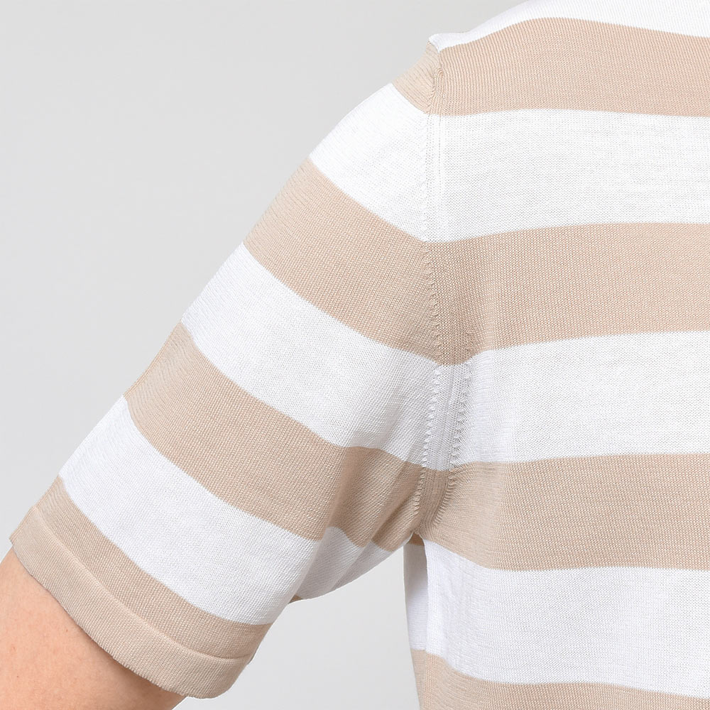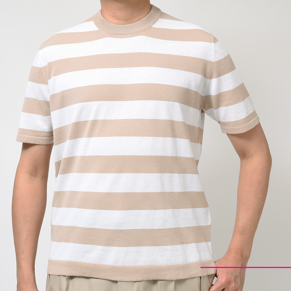 ニュアンスを付けるのであれば、この太ボーダーなら簡単にコーディネートをいつもと違った雰囲気に仕立て上げてくれますし、柔らかい色出しに加え、セッテフィーリメイドならではの上品なオーラは、大人が着用できるボーダーと言っても過言はありません。