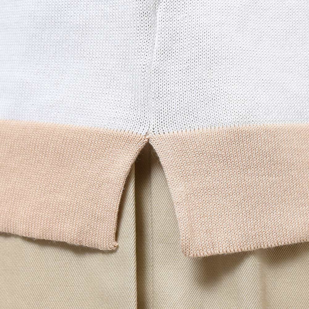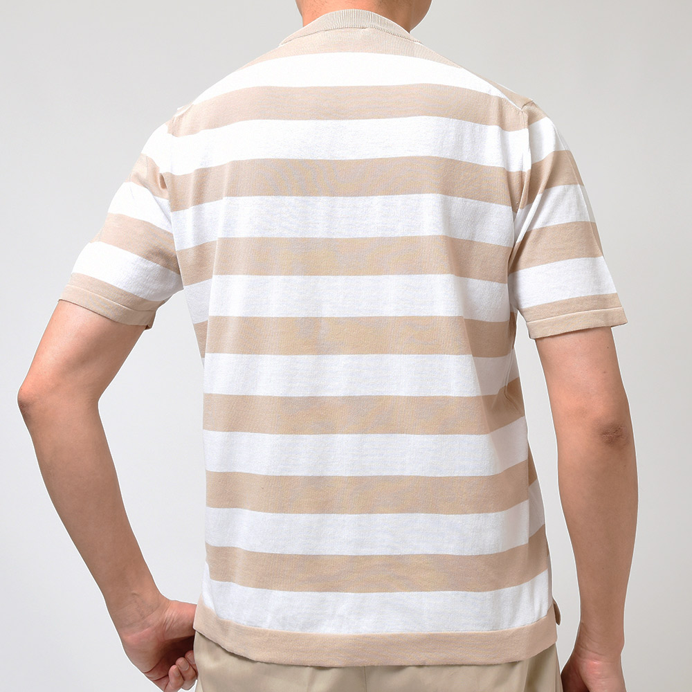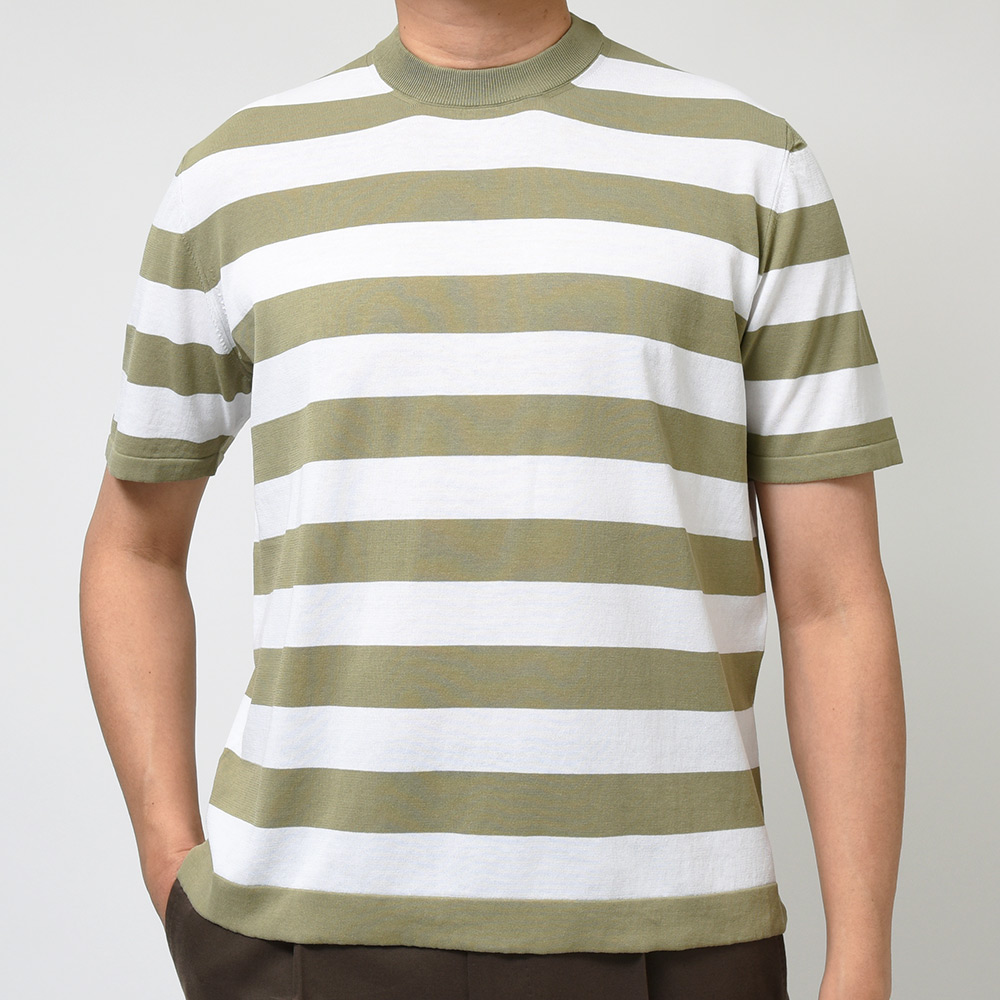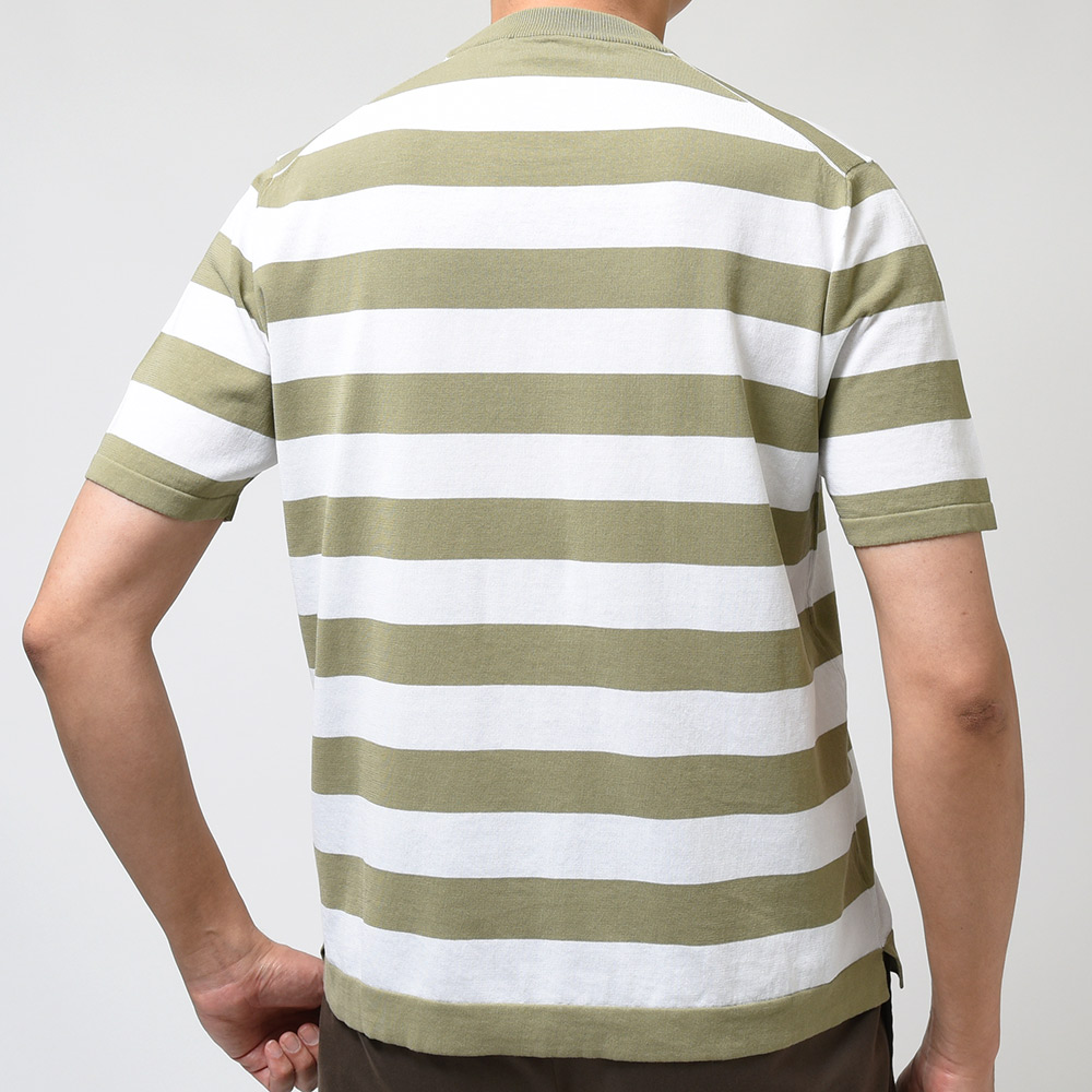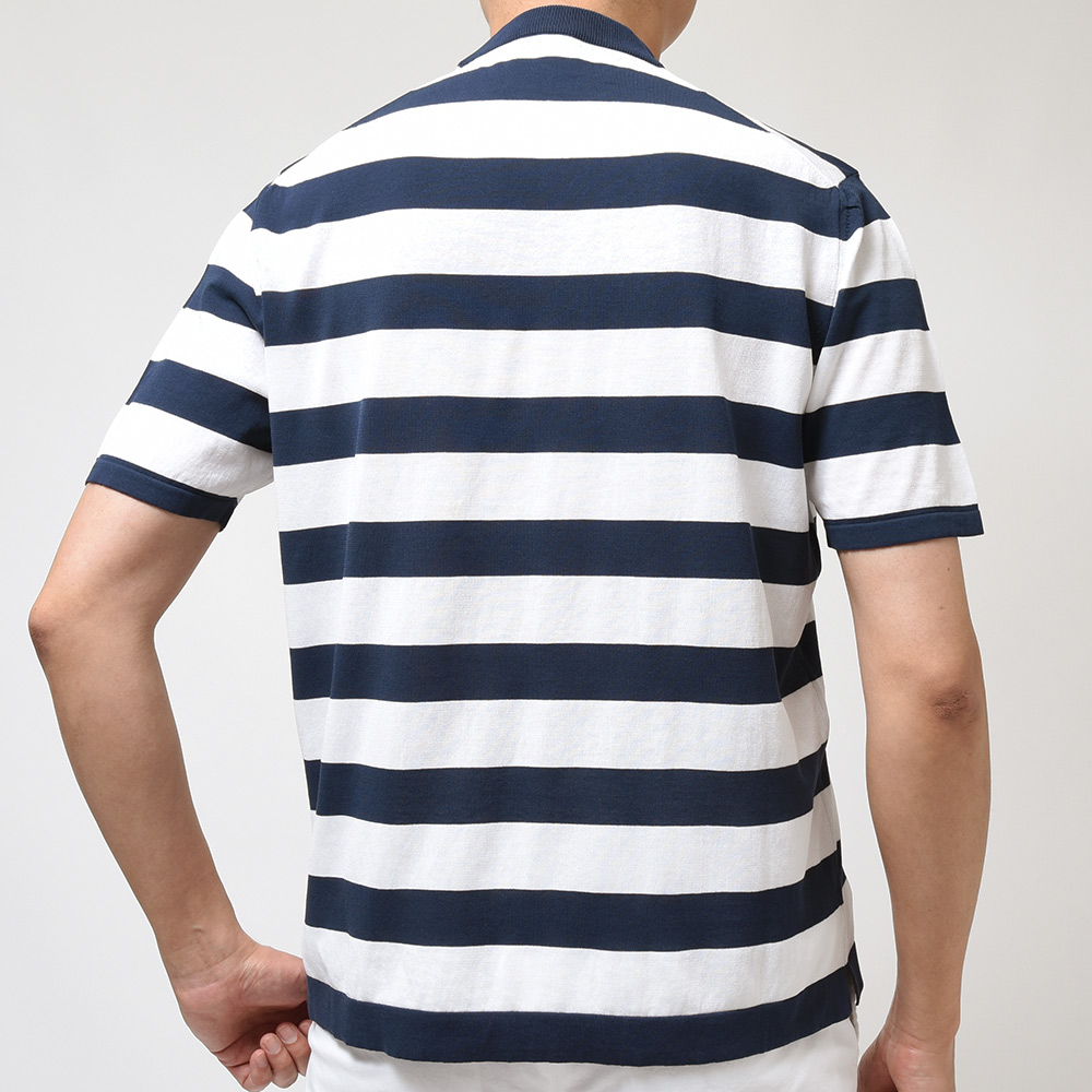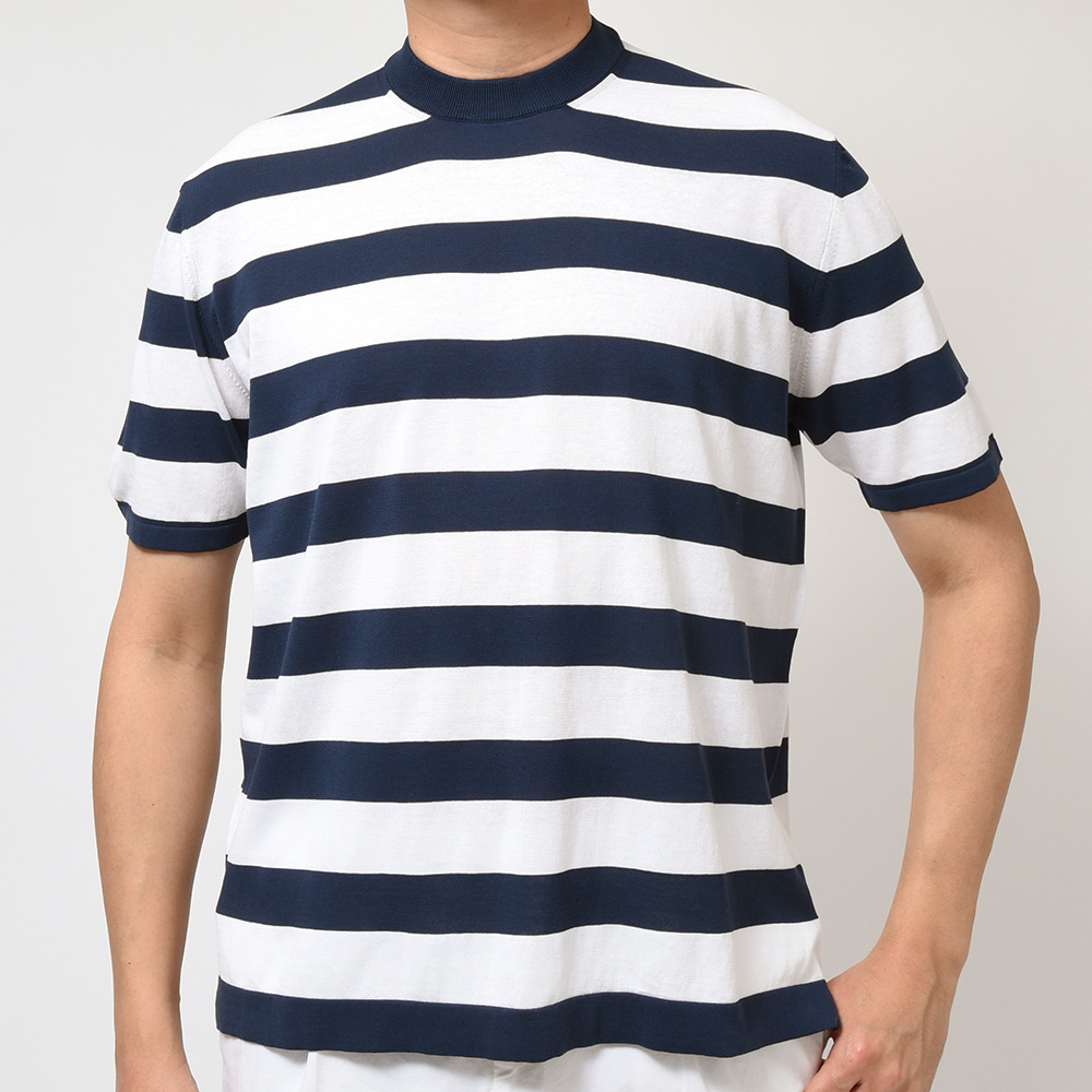 今シーズン、新たに提案されていた4cm幅の太ピッチボーダーニット。ボーダーらしくマリンな香りを仄かに漂わせつつも、どこかモダンで品のある佇まいはSettefili Cashmereらしさを感じさせてくれます。生地はかなり薄手のためカットソー感覚で着用でき、かつ強撚糸を使用したドライなタッチが真夏でも清涼感を運んでくれる着心地になります。