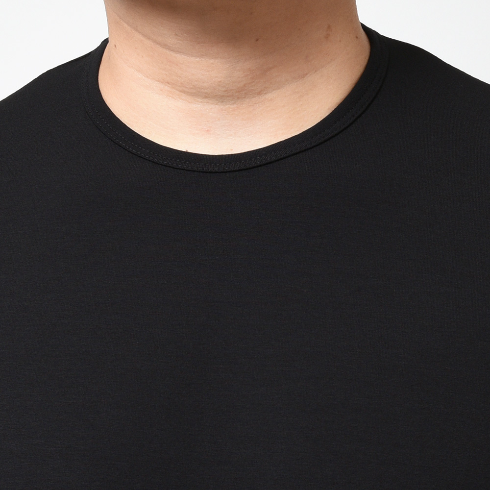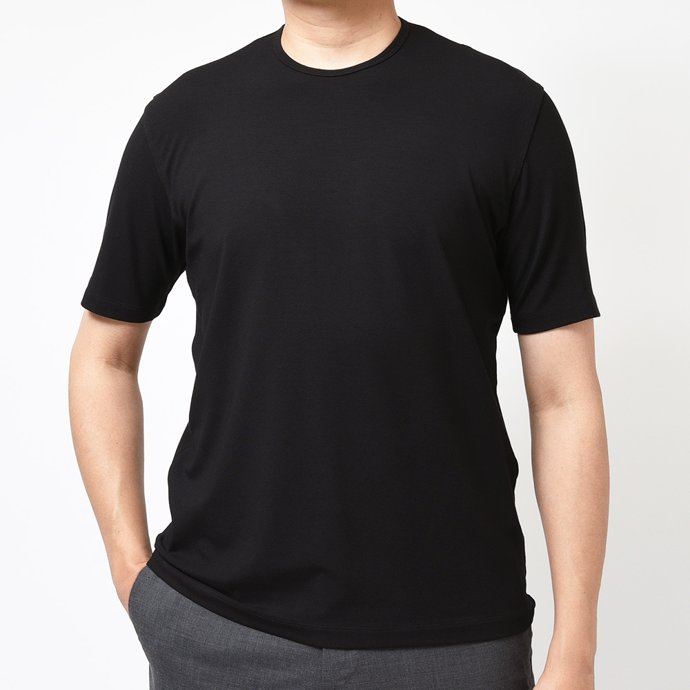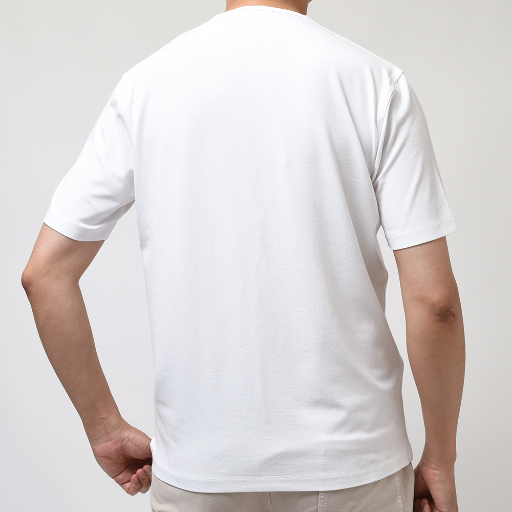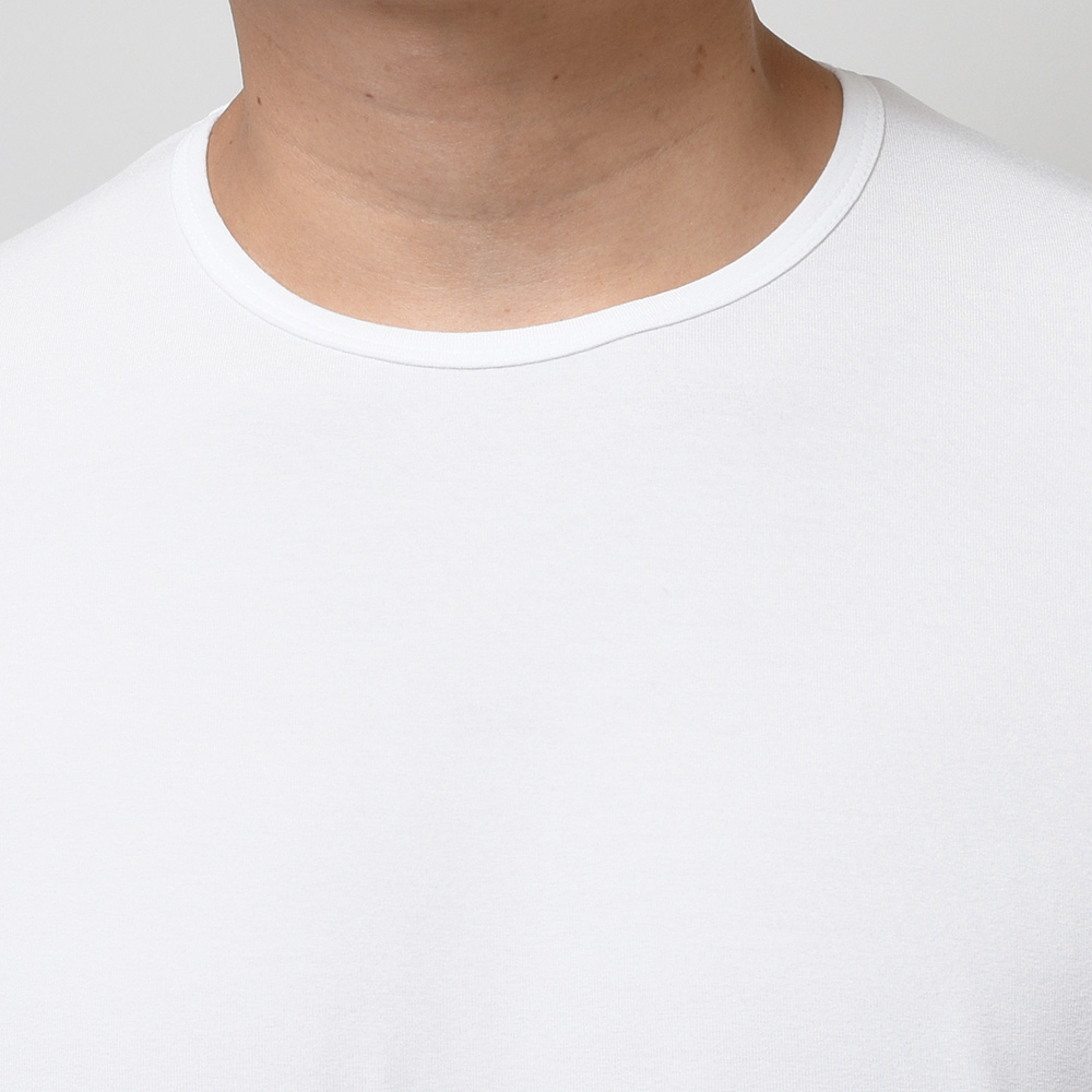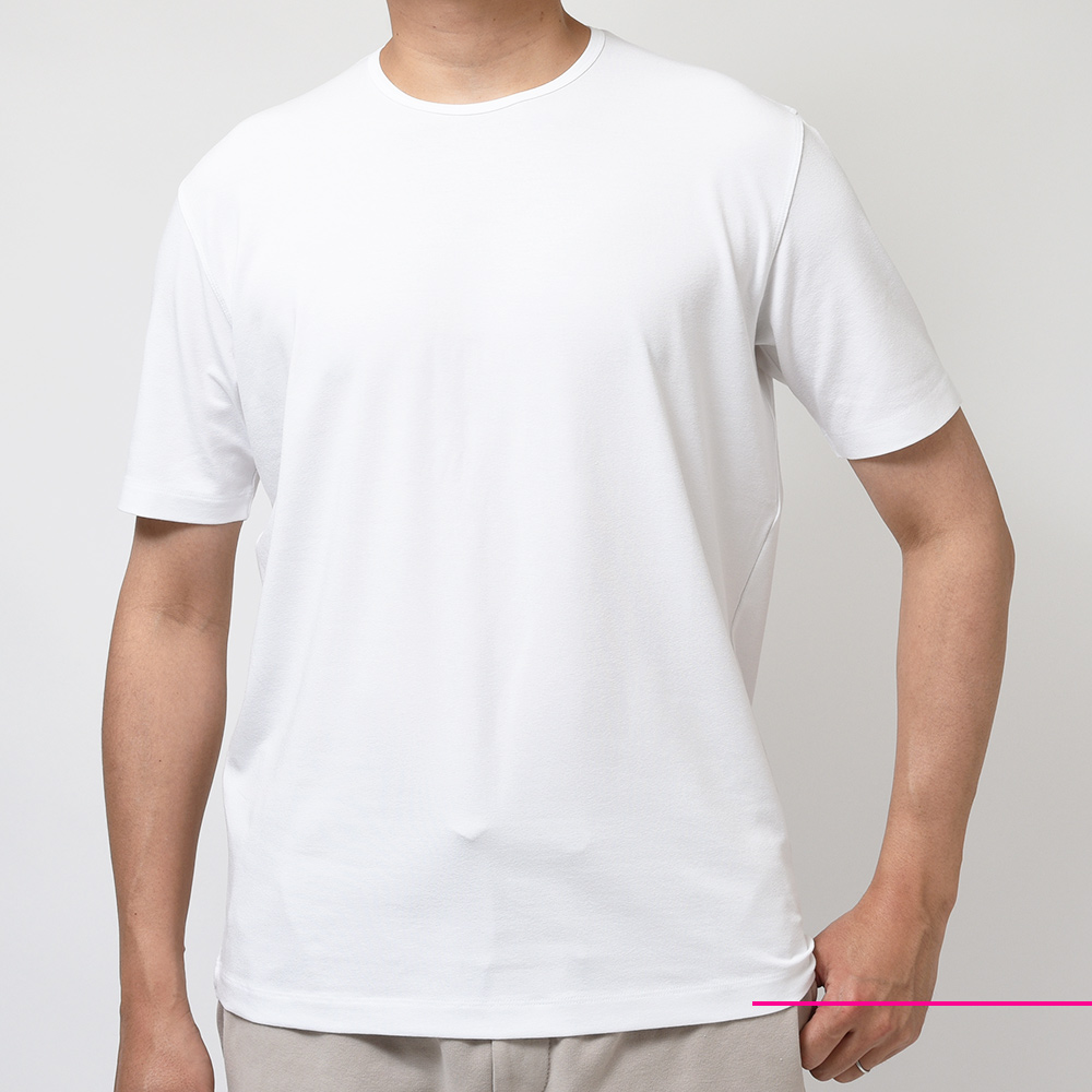 インナー使いにも最適なサイズ感や大人の余裕を感じる品の良い佇まいが特徴だったスムース素材から一新し、今シーズンは強く捻りを加えた糸を使用することで生地に表情が生まれ、ドライなタッチで清涼感ある風合いの生まれ変わった新素材が登場しました。