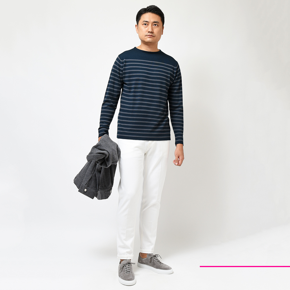 30ゲージよりも少し厚みのある24ゲージシリーズ。メリノウールを使用した24ゲージのふんわりと柔らかで、それでいてペラペラすぎないという絶妙なバランスで成り立っている、JOHN SMEDLEYの代名詞であり不動のロングセラーアイテムです。昨年より登場した、秋冬向けのメリノウール素材のボーダーバスクシャツ。重くなりがちな秋冬のスタイリングにいい塩梅のヌケ感を作ってくれるとあって大好評のアイテムでした。