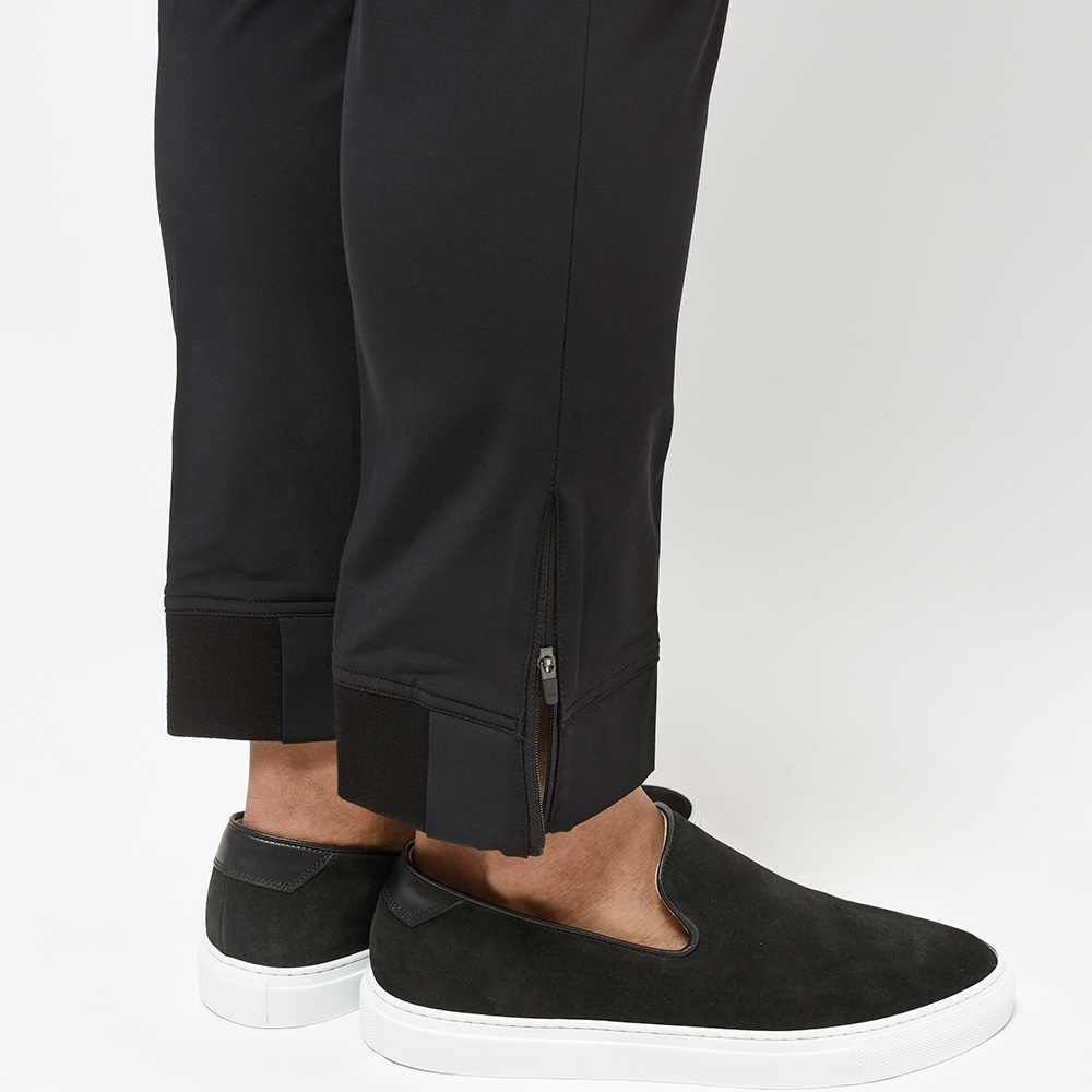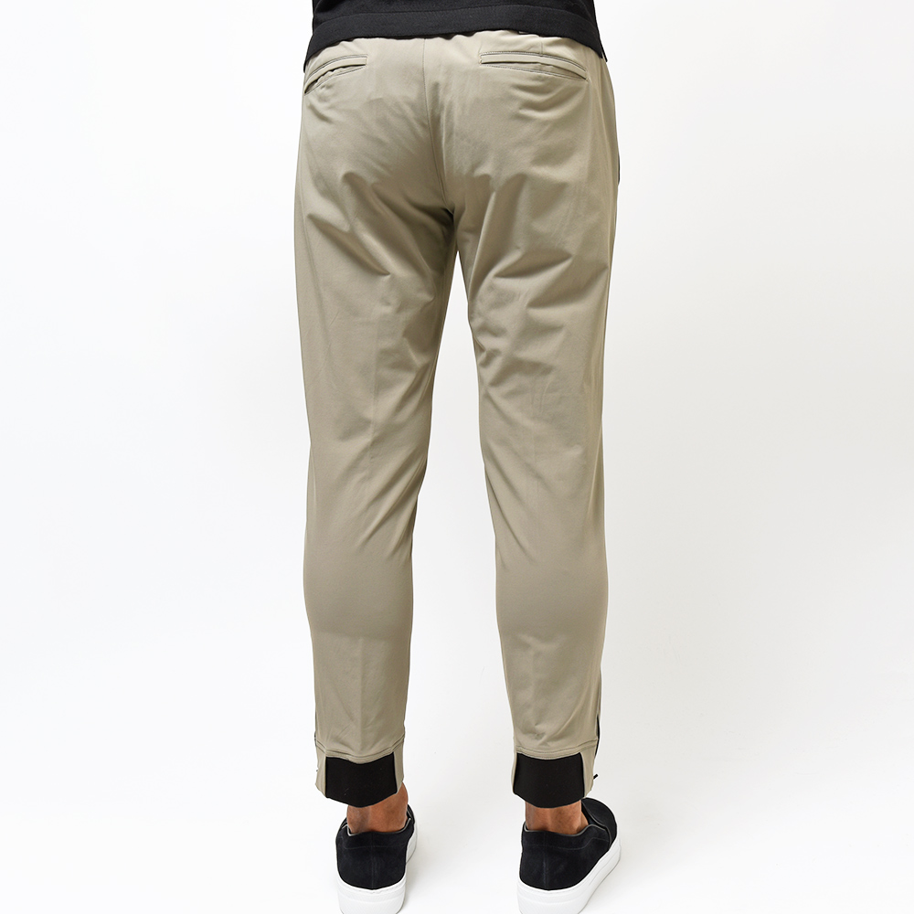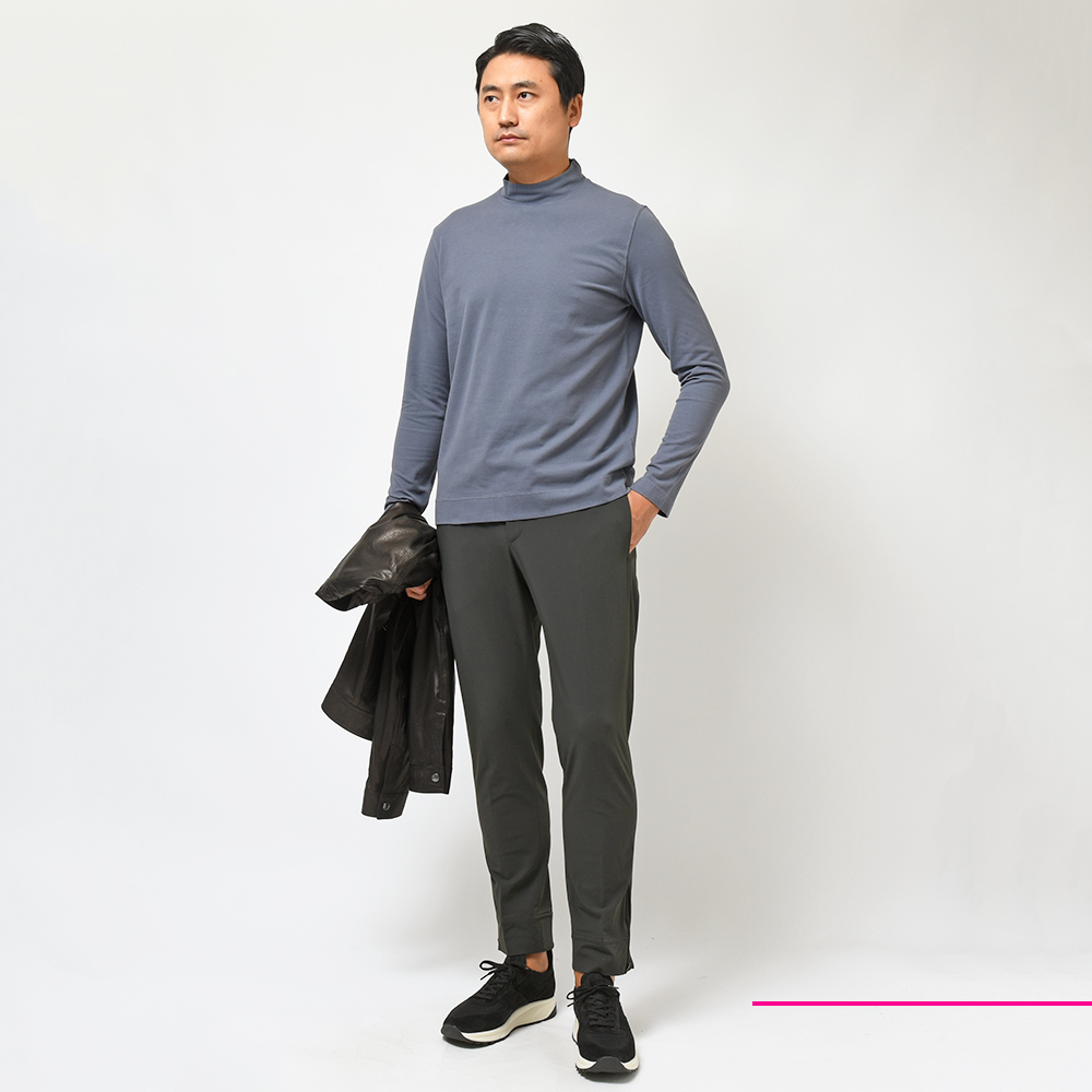 モデル“EPSILON RIB+ZIP”はring10周年を記念して別注を行った限定モデルになります。大人気となり今やActiveシリーズの顔とも言える裾ジップ仕様に、スポーティーなパンツの代名詞とも言えるリブをもプラスしたハイブリットな見た目に、EPSILONのスマートなシルエットが合わさった特別仕様。裾の仕様がカジュアルならばベルトループではなく、シャーリングの方が良いのではというバイヤー宮本の発案で、ウエストのシャーリング部分はActiveシリーズのモデル“OMAGE”のディティールを踏襲し、OMAGE+EPSILONという有りそうで無かった逸品となっています。