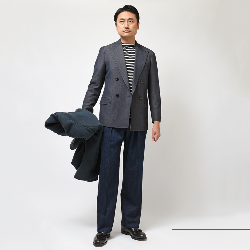 尾州産のデニムライクなウール生地は、4プライウールを使用したハリのある質感。通常のコットン素材のデニムに比べ、ウールであることで艶感が生まれています。それにより、アメリカンな雰囲気を程よく感じさせつつも、上品な雰囲気を纏わせてくれます。