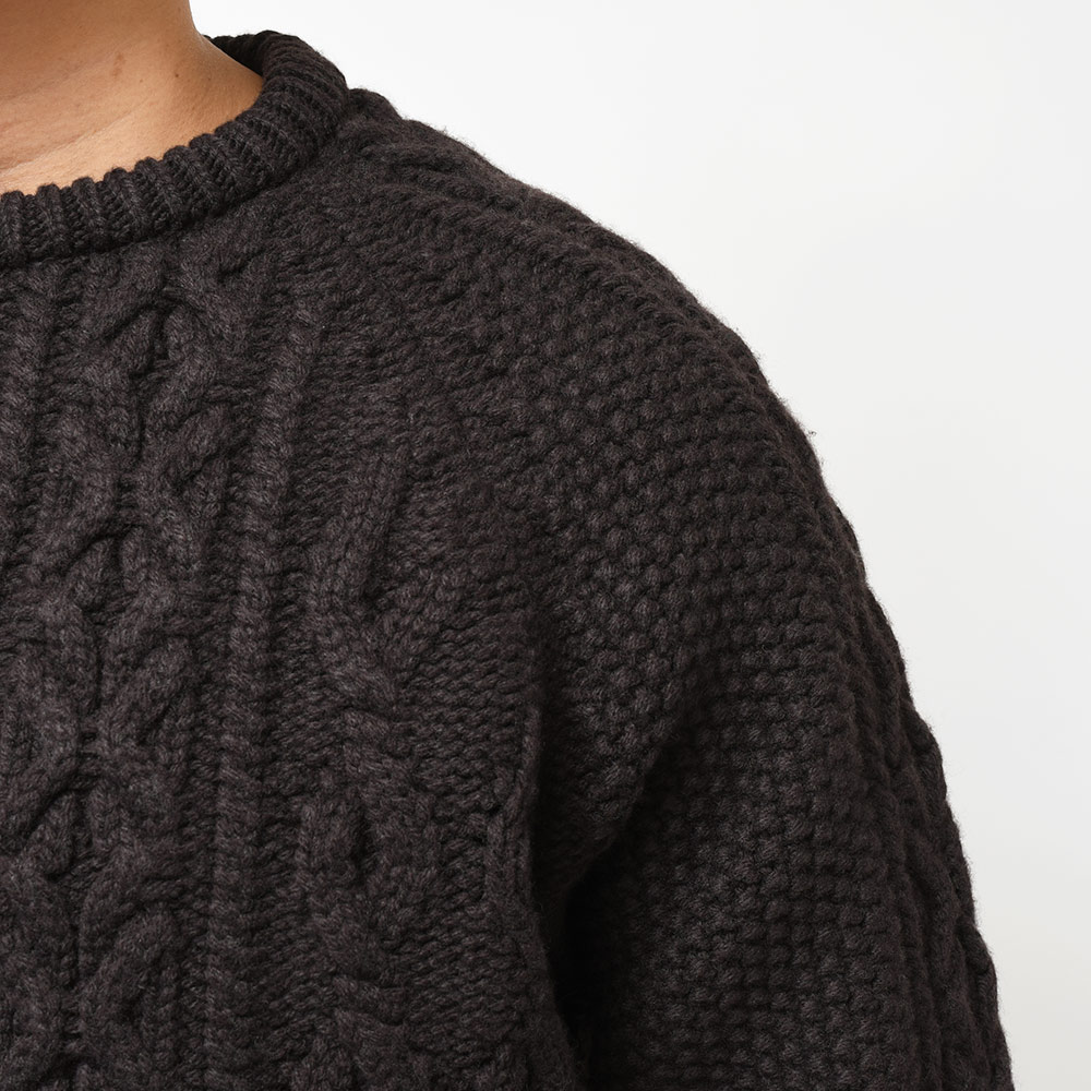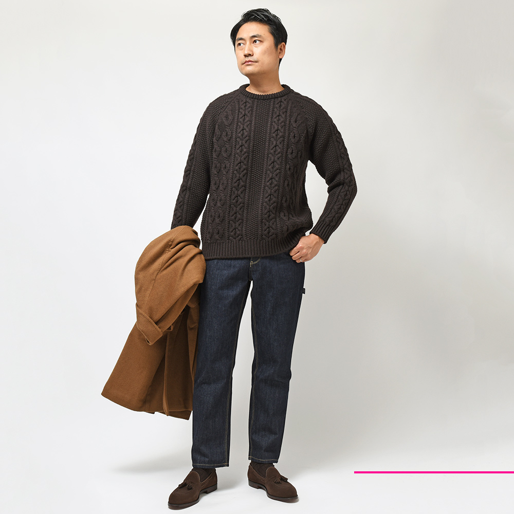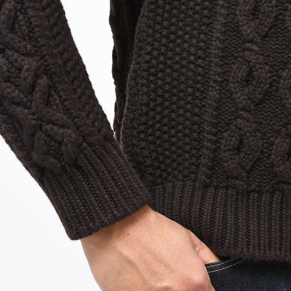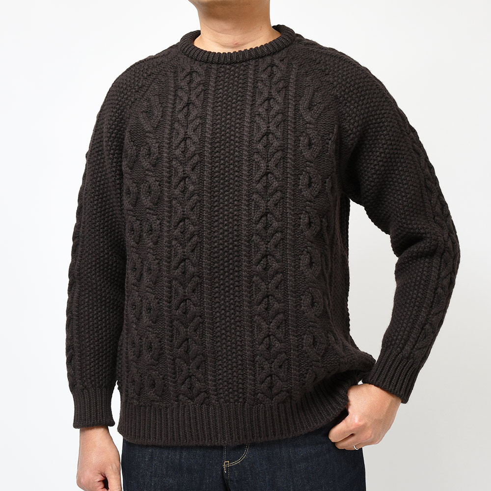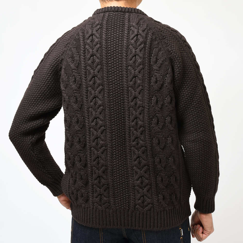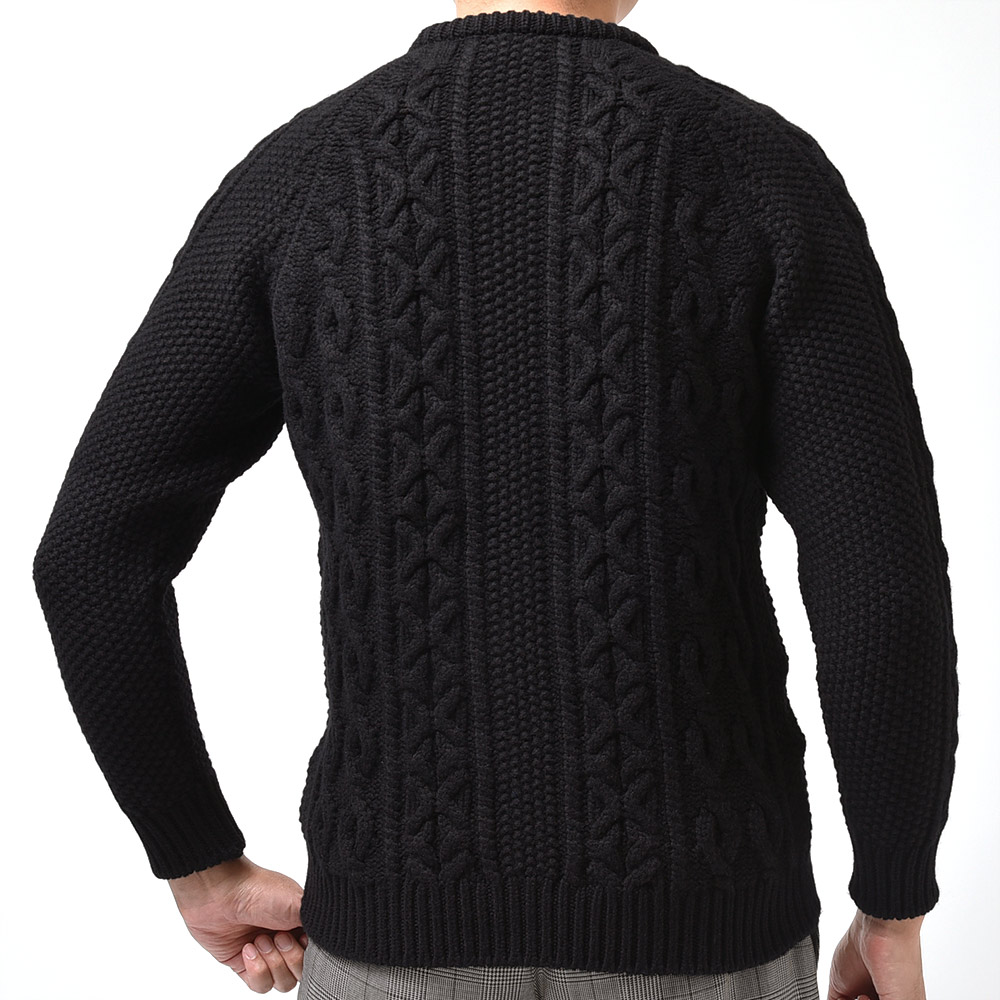 前回と同じく、トッド&ダンカンの5プライ(5本の糸を一つに撚った糸のこと)のジーロンラムズウールを使ったケーブル編みのニットになりますが、所謂フィッシャーマンニットのように油を染み込ませたようなタフなものではなく、柔らか~く滑らか~なタッチに加え、このボリュームながら驚きの軽さも高級素材ならではのパフォーマンスと言えます!